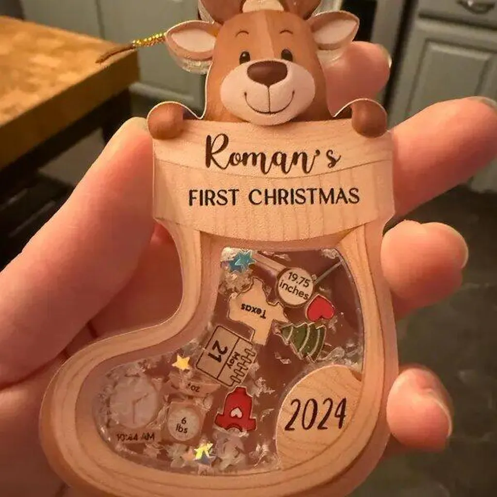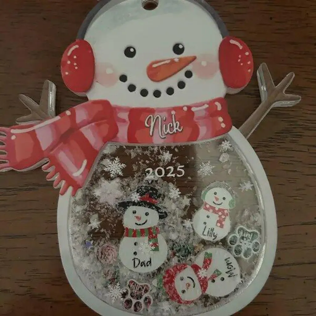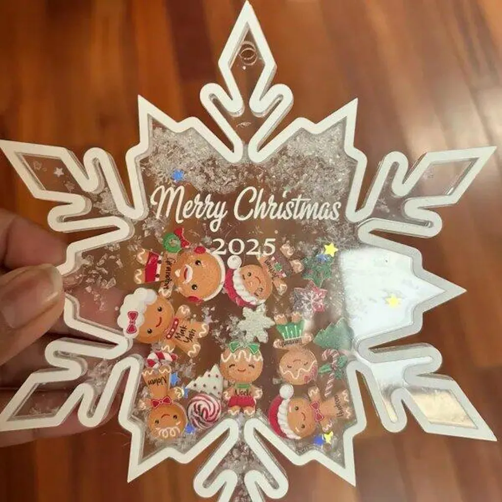 Make your décor sparkle with our custom 3-layer acrylic shaker ornament. Precision laser-cut and UV printed in vivid color, it features a clear, layered construction filled with floating accents that dance with every shake—personalized for names, pets, or your favorite people.