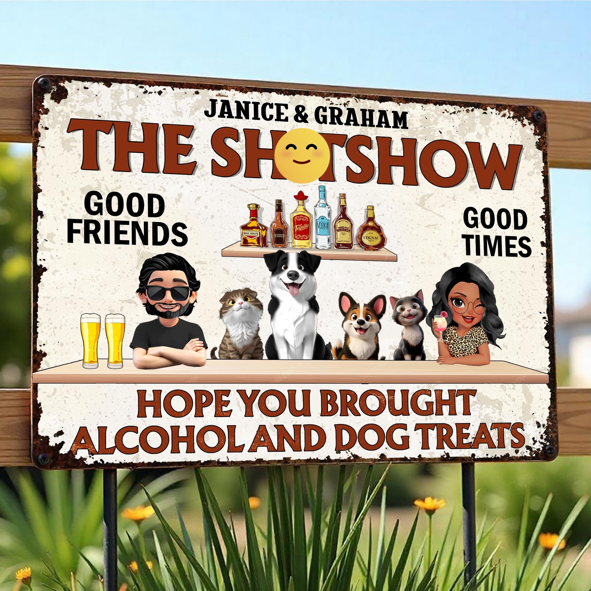 The Sh*tshow, Good Friends Good Times, Hope You Brought Alcohol And Dog Treats, Bottles And Dogs - Personalized Metal Sign - FAM035_MSIGN