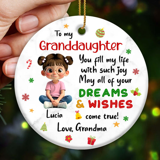 To My Granddaughter, Dreams & Wishes, Little Girl Sitting Christmas Symbols - Personalized Custom Ceramic Ornament With Round Shape - GDT358_RCE