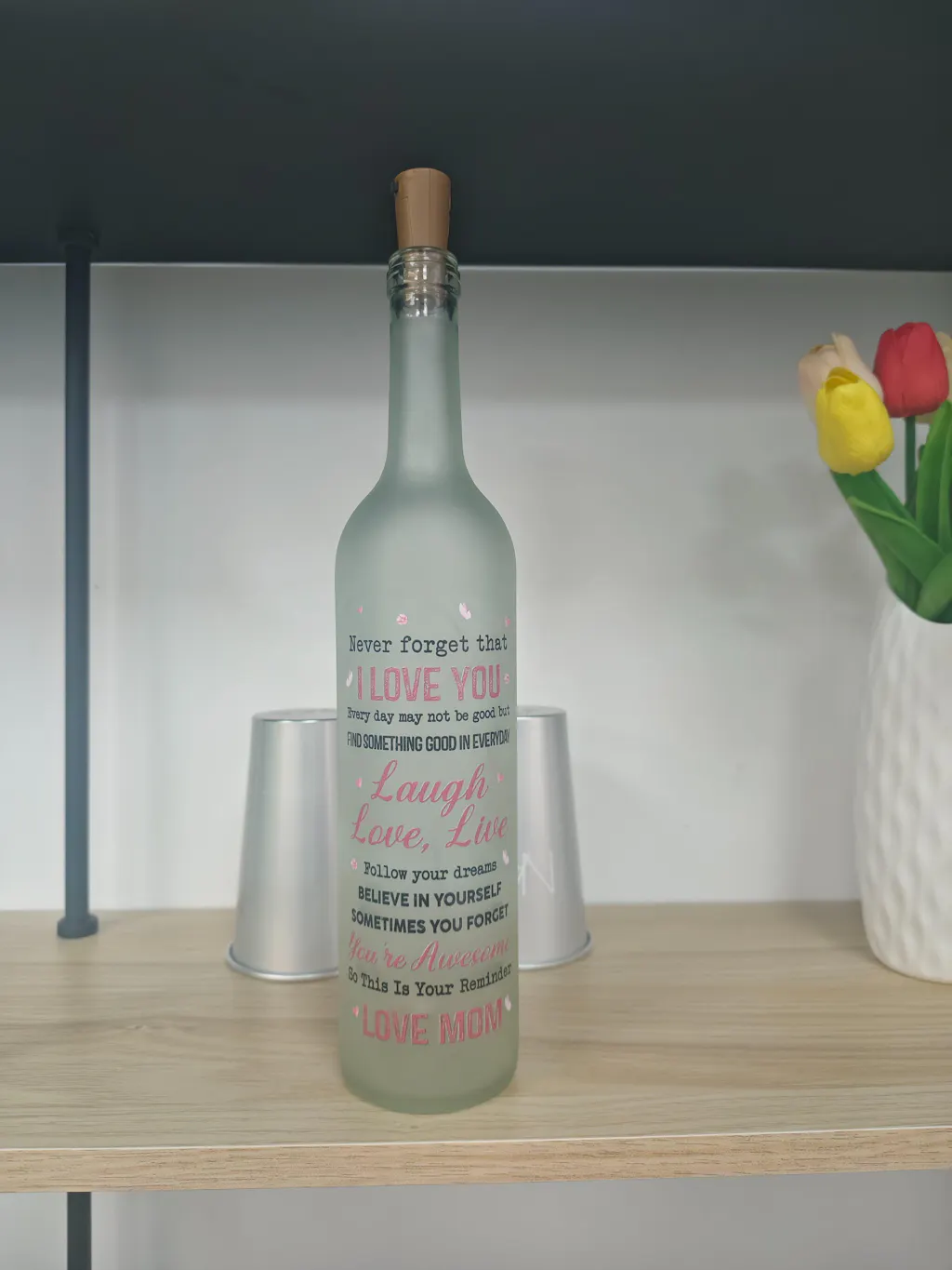 Celebrate love and cherished moments with our Personalized Bottle Lamp. Designed to create a warm, romantic glow, this enchanting keepsake is perfect for setting an intimate atmosphere during date nights, cozy evenings, or as a heartfelt decorative piece.