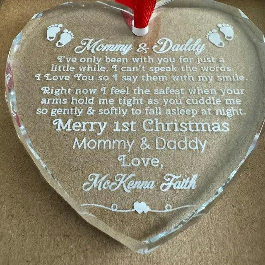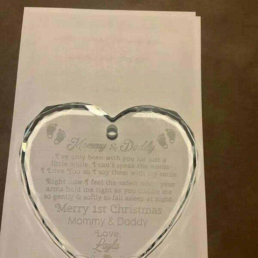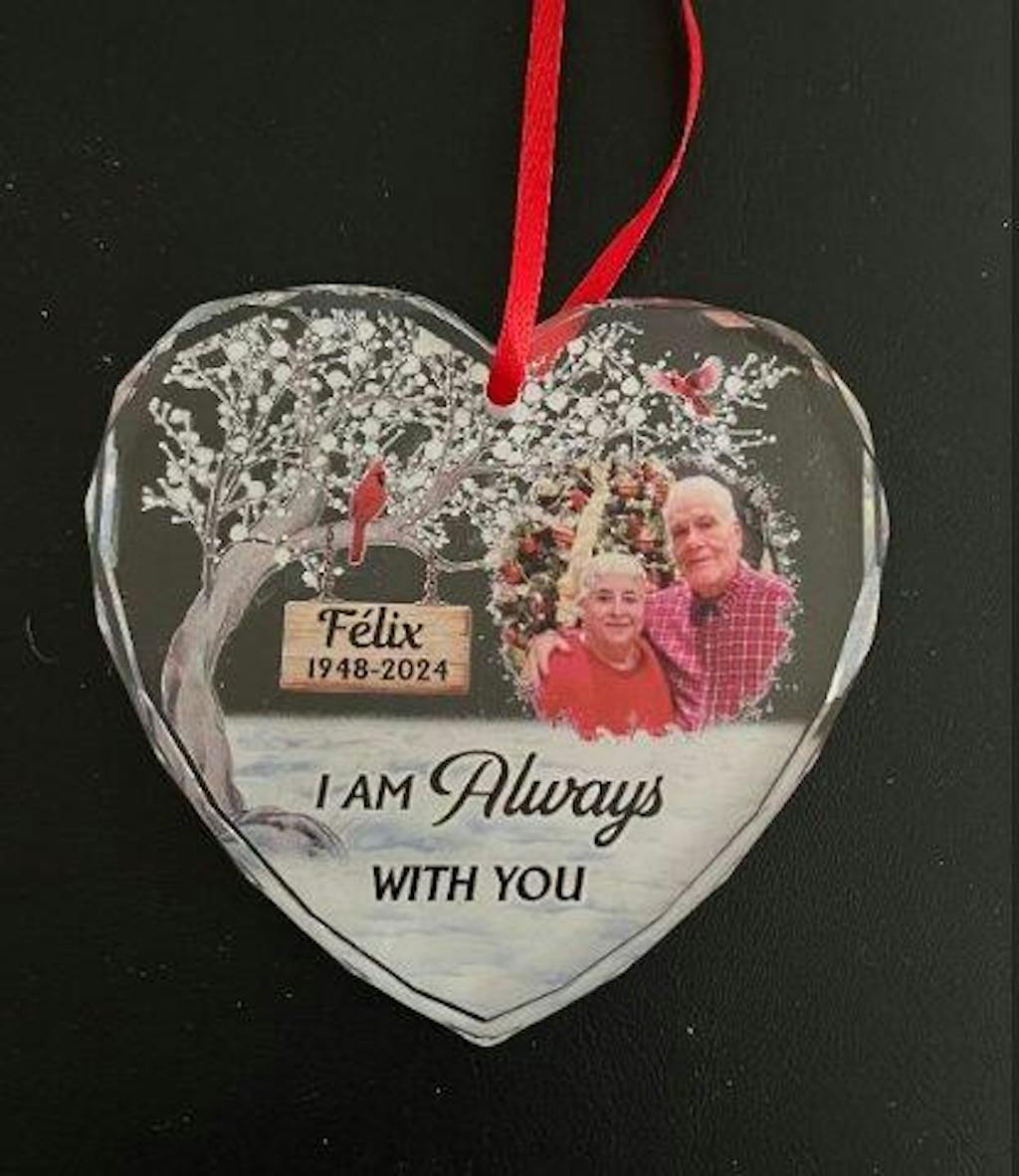 Capture special moments with this heart-shaped glass ornament, custom printed in vivid color and ready to hang. A refined keepsake that elevates holiday décor and memory displays alike.