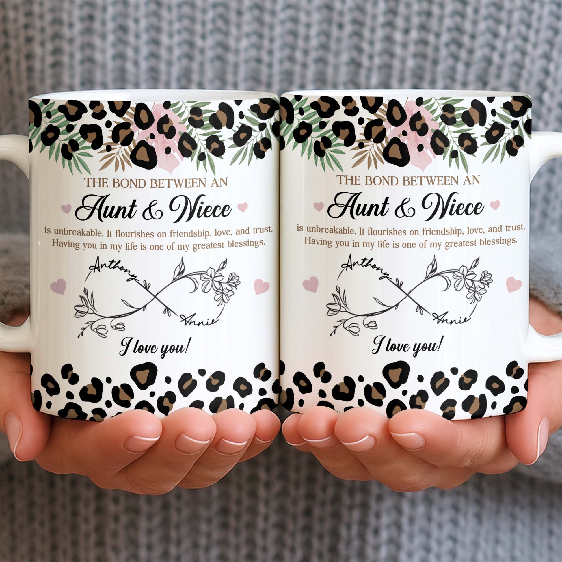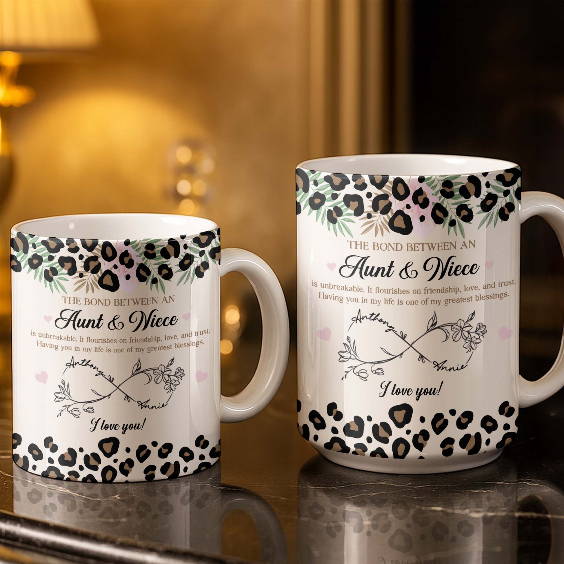 The Bond Between An Aunt & Niece, Leopard Print And Hearts, Coffee Mug, Gift For Family