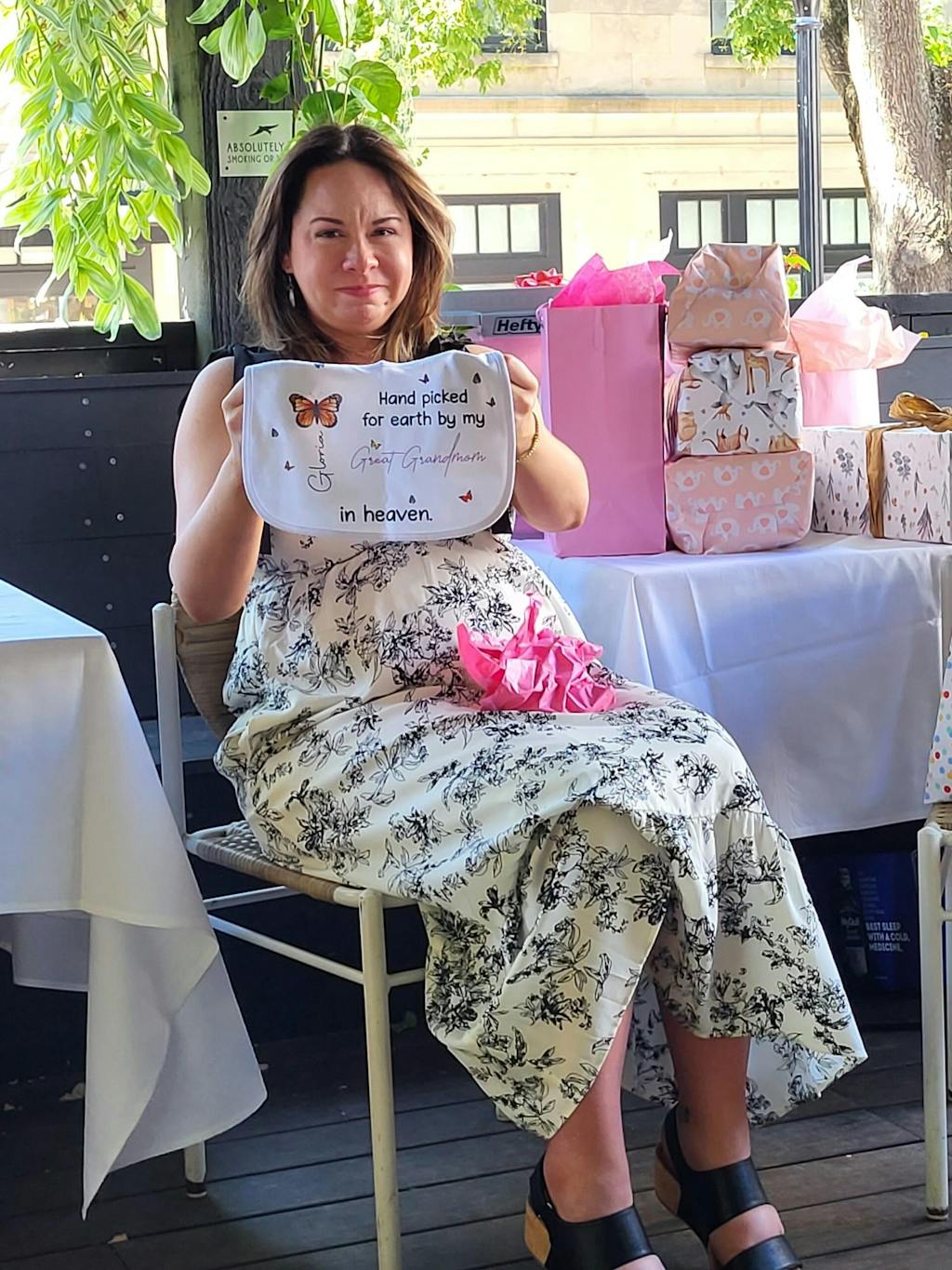 I purchased the bib for my nephew and his wife’s baby shower, as a gift from my Mom, who passed 3 years ago. She didn’t get to see this beautiful couple married, so I was determined to make sure she had a place with the baby. The bib was beautiful and literally EVERYONE cried when it was opened. ❤️