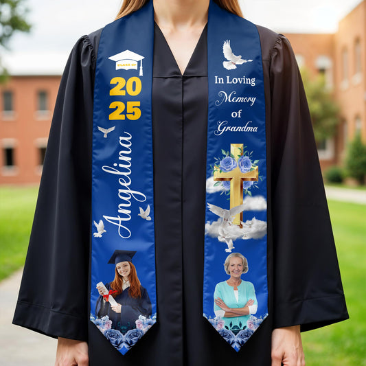 In Loving Memory Of Grandma, Dove, Cross, And Flowers - Personalized Graduation Stole - HME021_TRIGRA