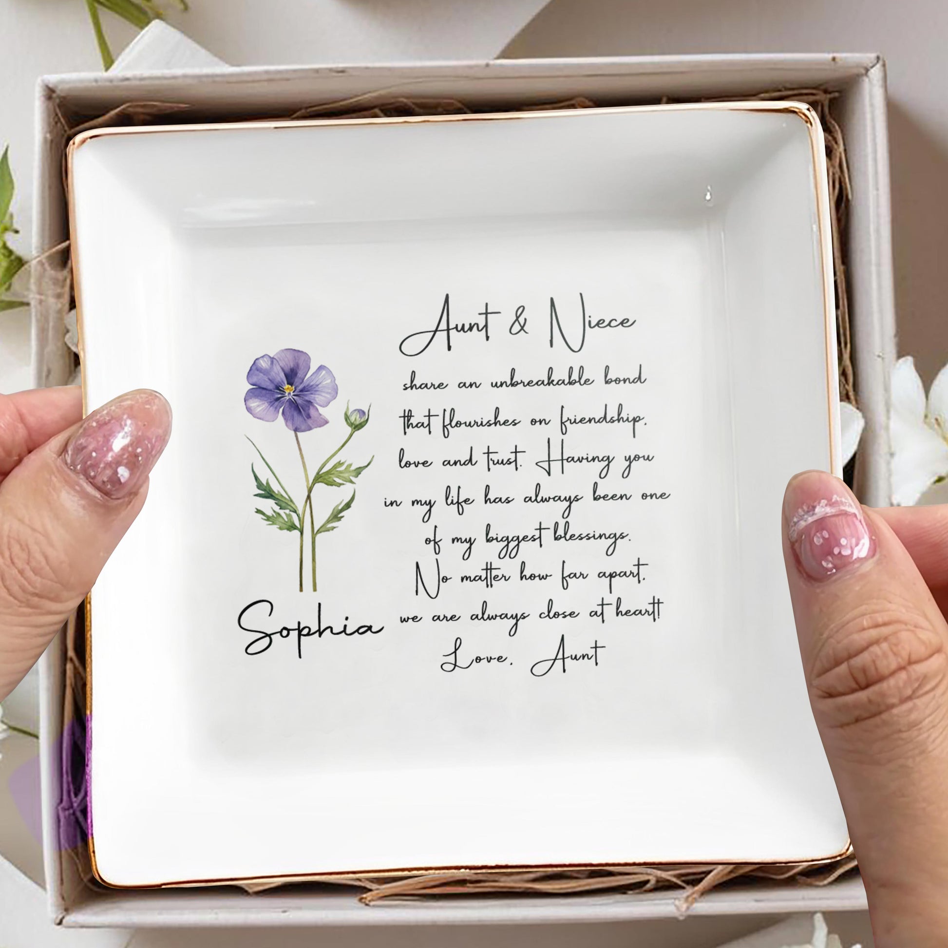 Aunt And Niece Share An Unbreakable Bond Flower Jewelry Dish - Personalized Custom Jewelry Dish, Square Ceramic Dish - NCE041_SCRD