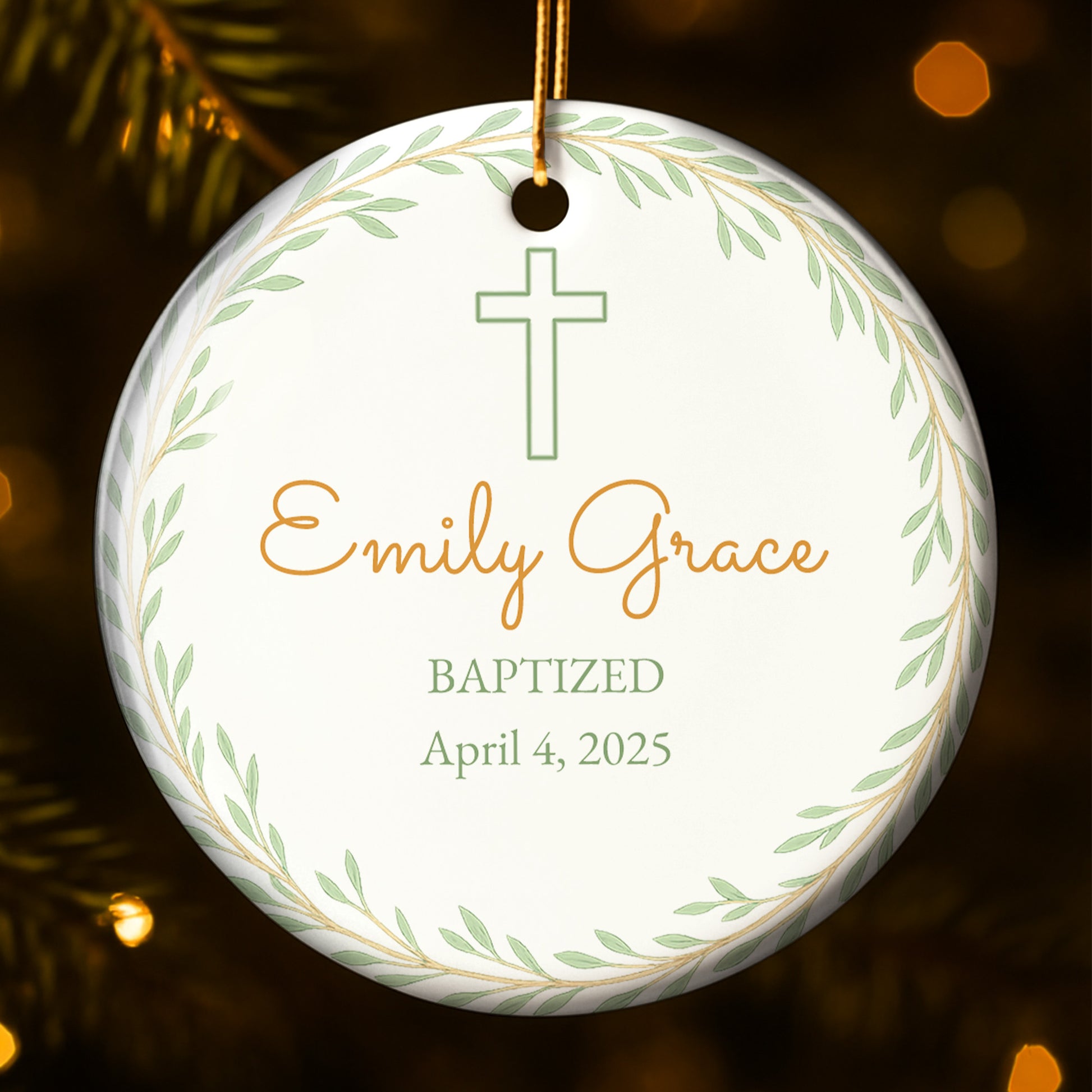 Hermoso recuerdo de bautismo con cruz y hojas - Adorno de cerámica personalizado con forma redonda - KID214_RCE
