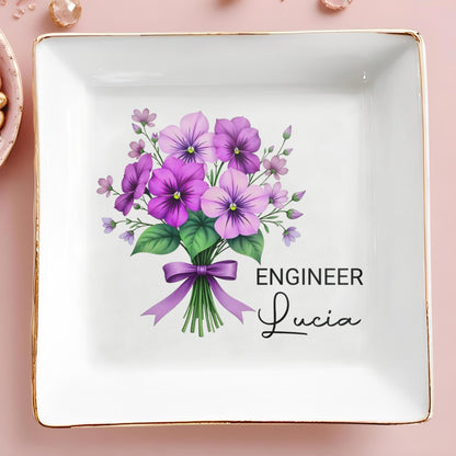 Celebre su espíritu solidario con este diseño floral inspirado en su trabajo, flores y cinta - Plato de joyería personalizado, plato cuadrado de cerámica - GRAD273_SCRD