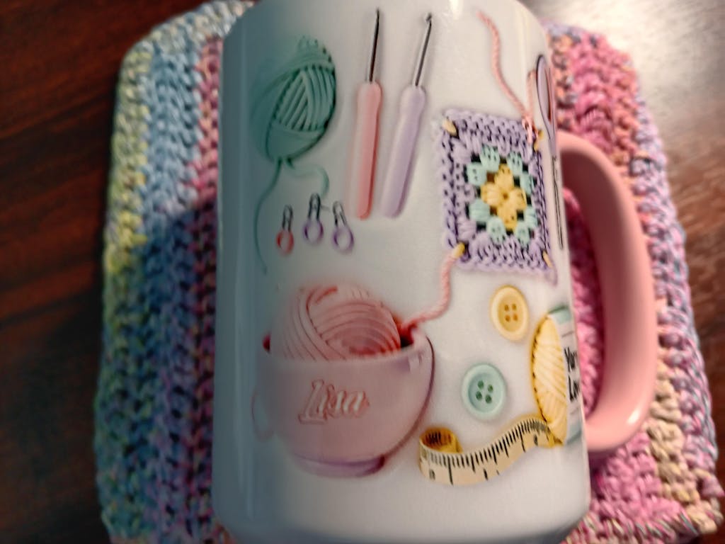 I love the mug! I have it near me when knitting or crocheting. It contains the current needles I am using (knitting or crochet hooks), stitch counter, sewing needle, stitch markers and scissors.