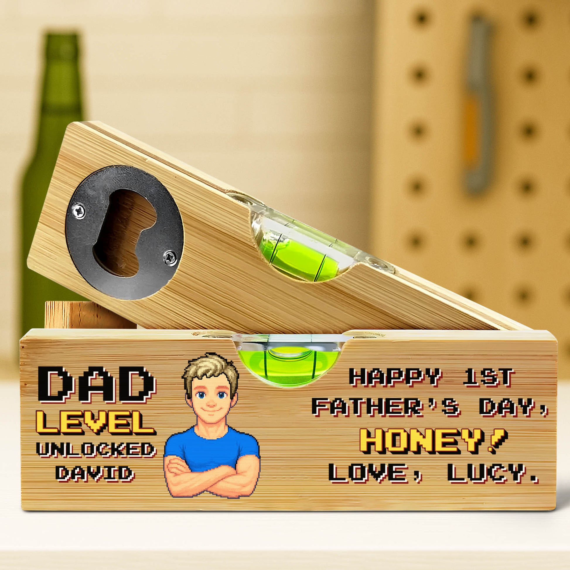Nivel de Papá desbloqueado, Feliz primer día del padre, Nivel con abrebotellas - Nivel de madera personalizado con abrebotellas - HSB001_PLEV