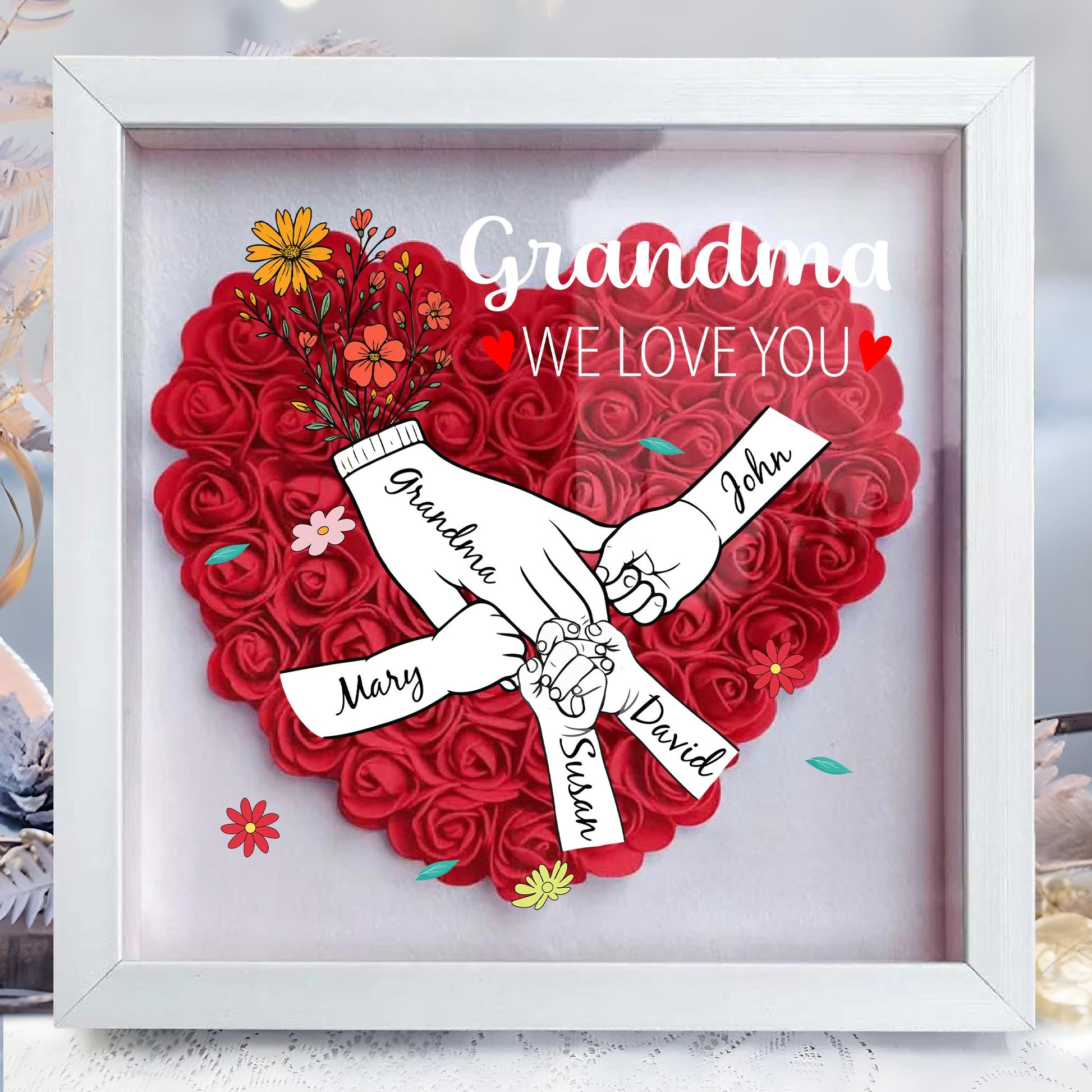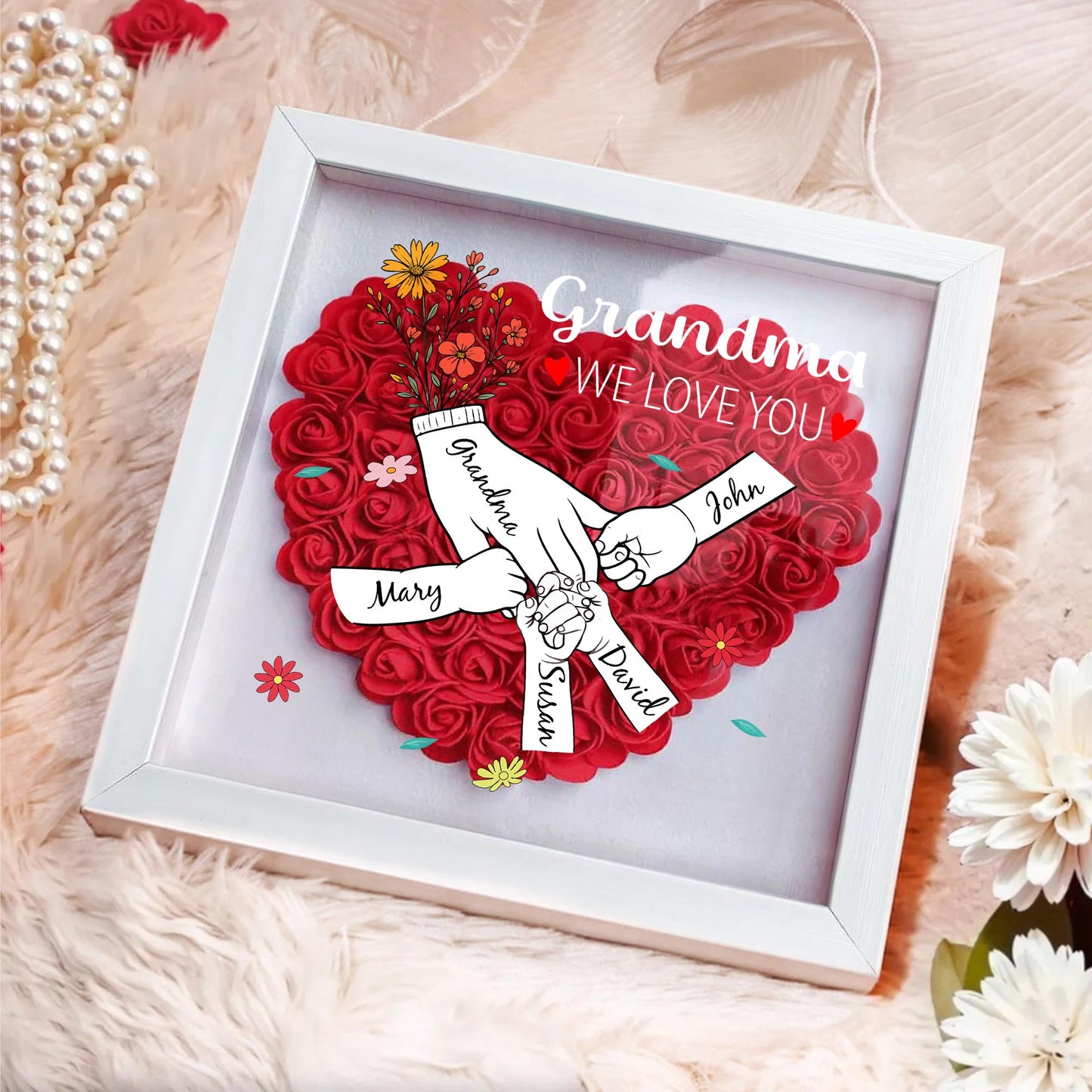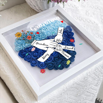 Grandma, We Love You, Flowers and Hands, Personalized Flower Shadow Box, Gift For Grandma