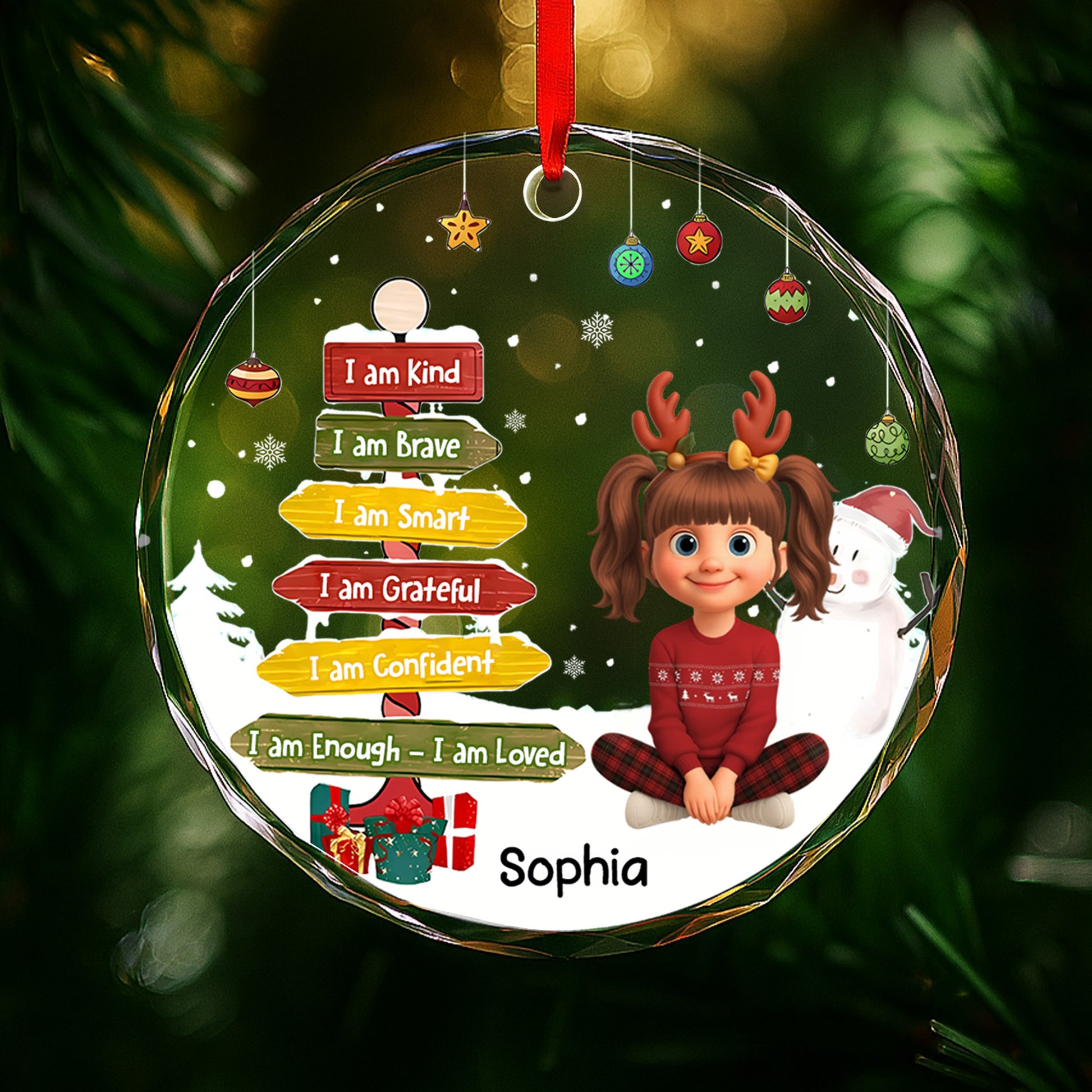 I Am Kind, I Am Brave, I Am Smart, Personalized Custom Circle Glass Ornament, Gift For Young Girls