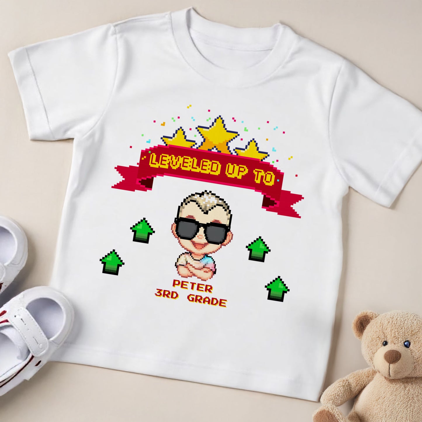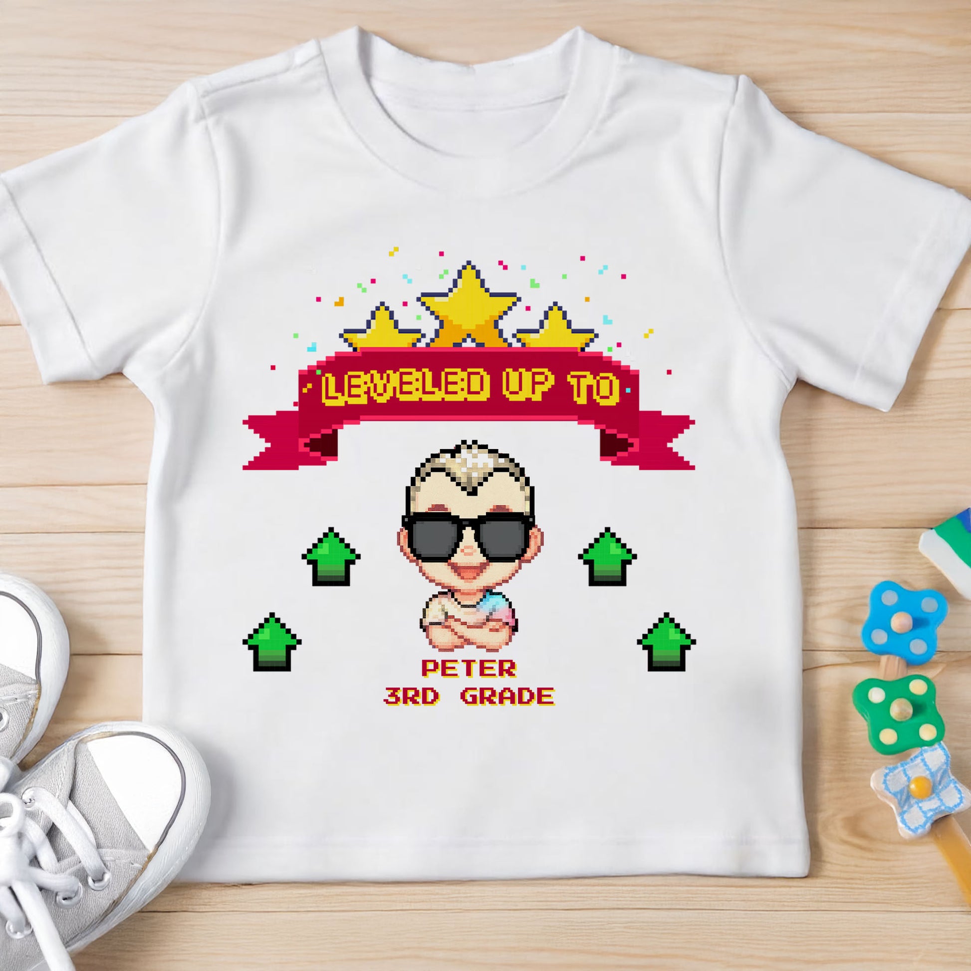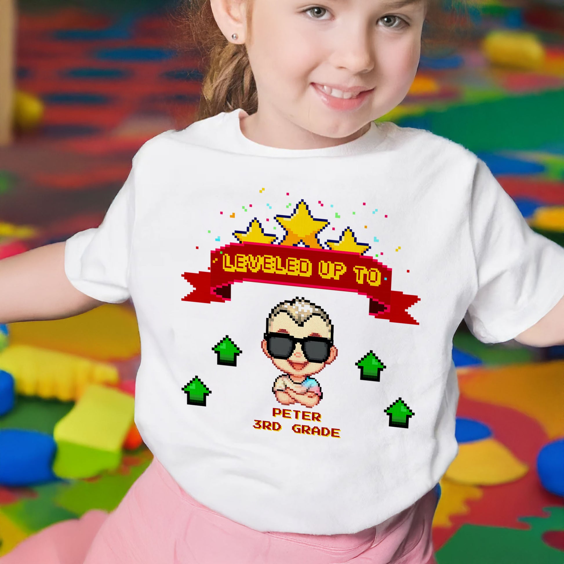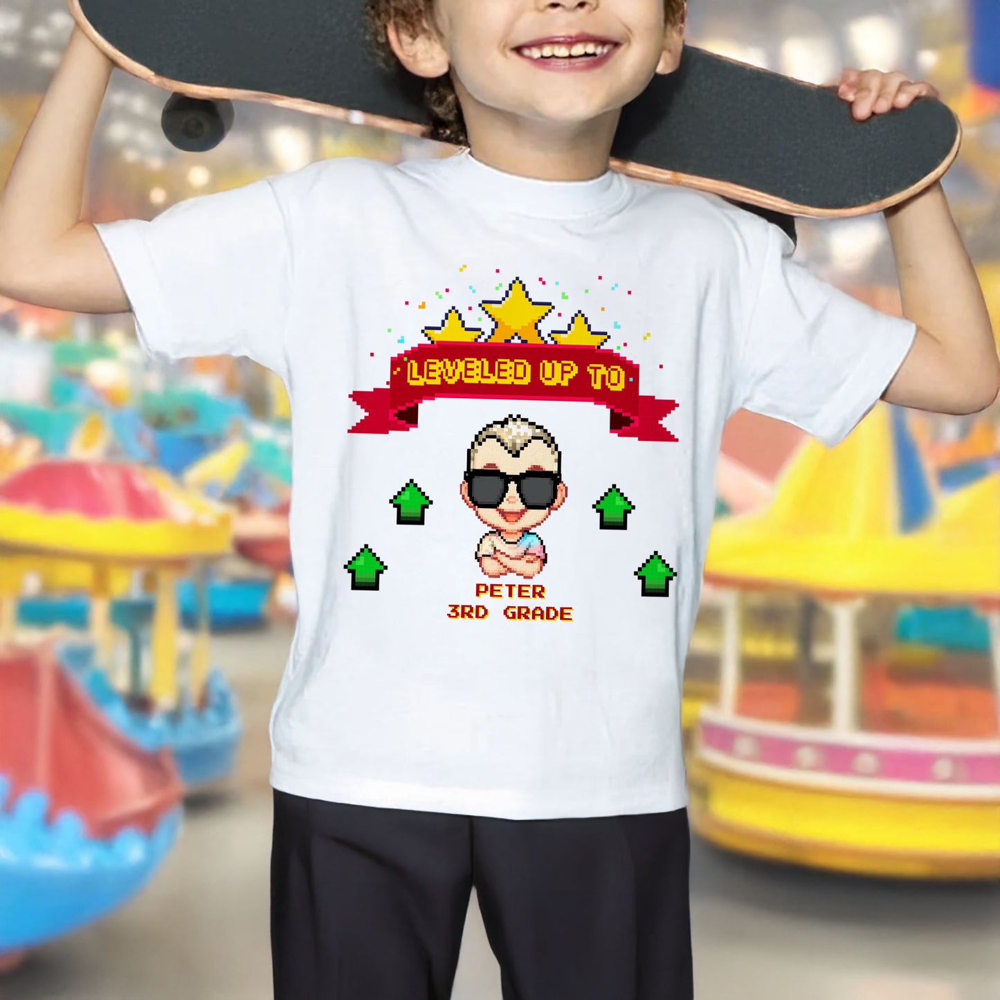 Leveled Up To 8-Bit Style Character And Stars, Personalized Custom Youth T-Shirt, Gift For Students
