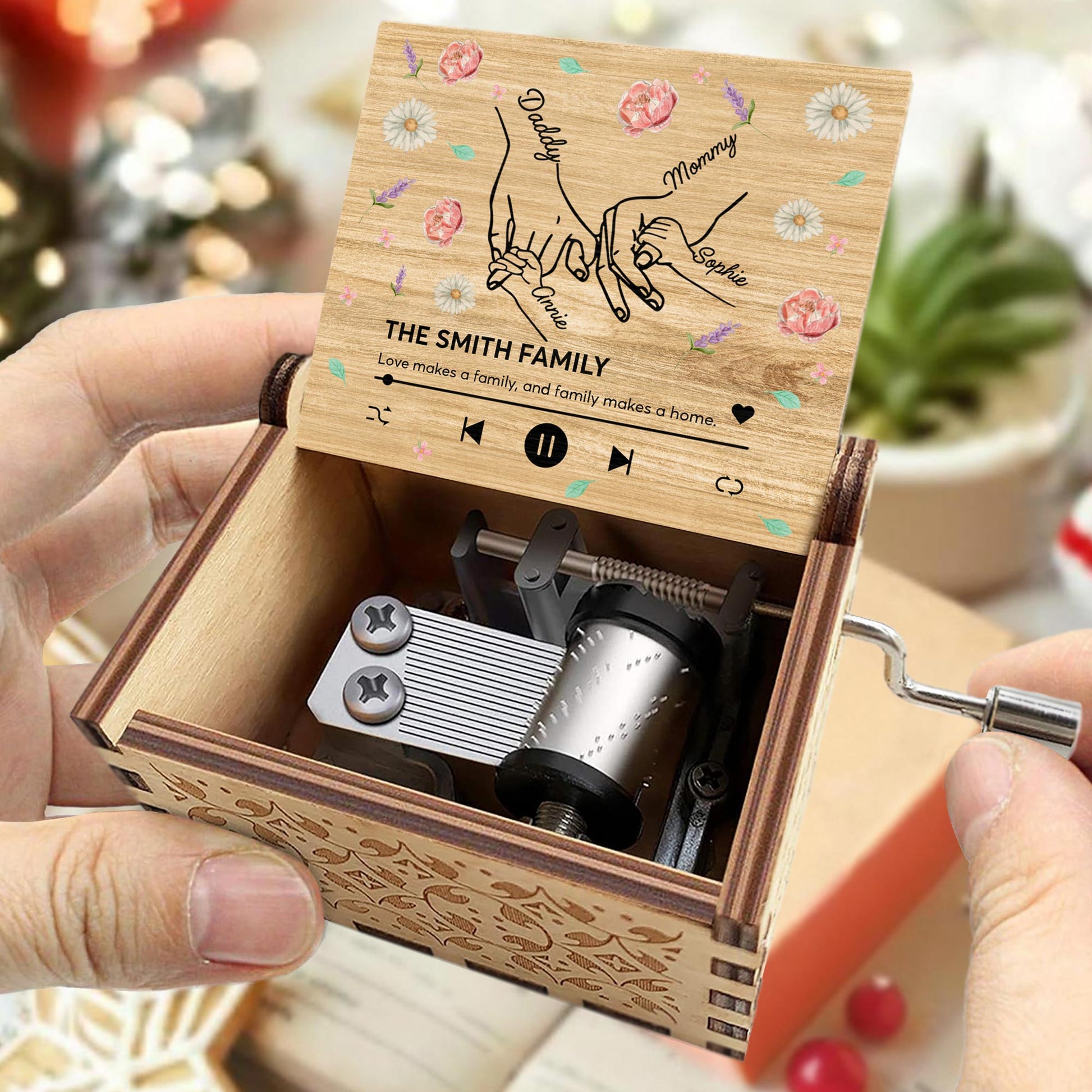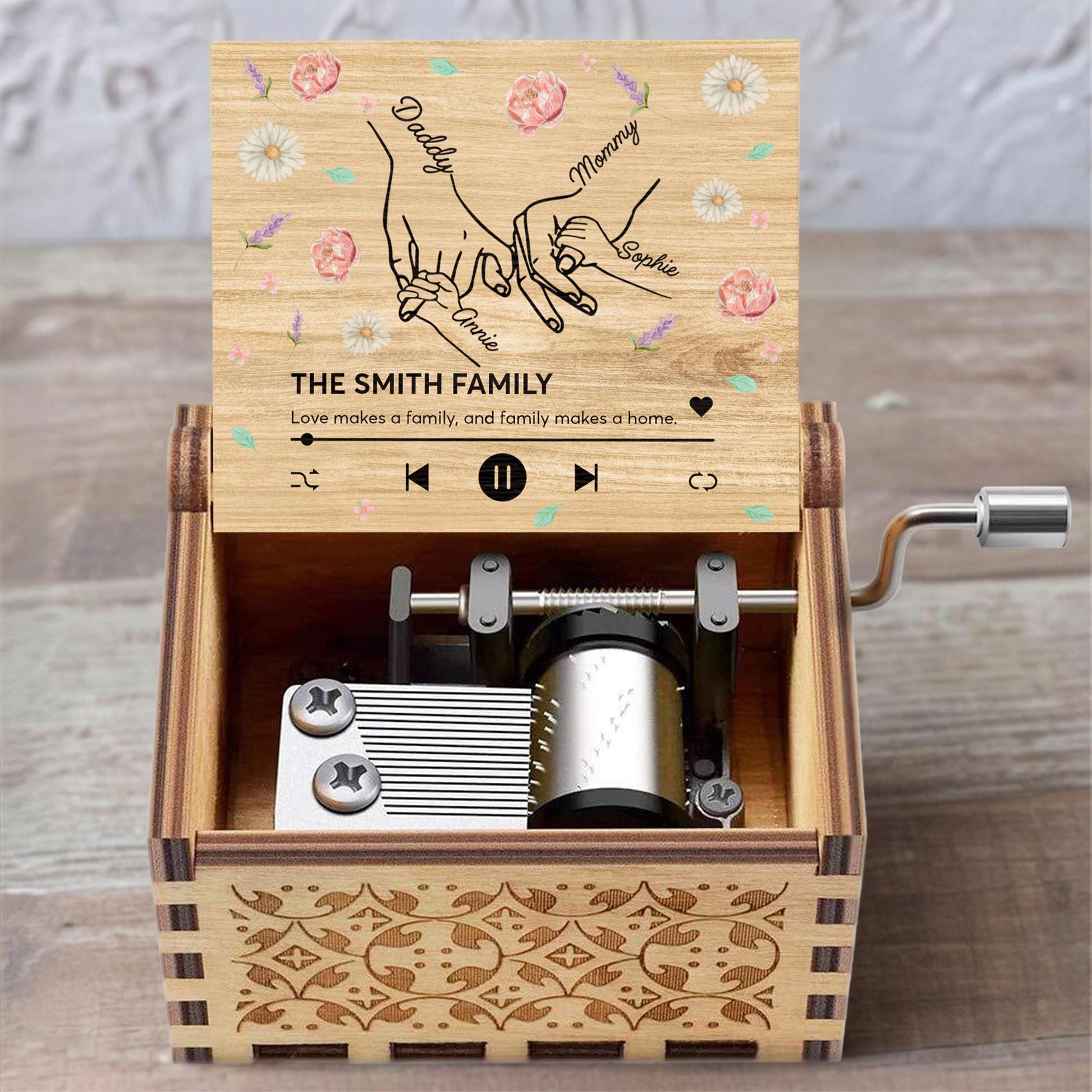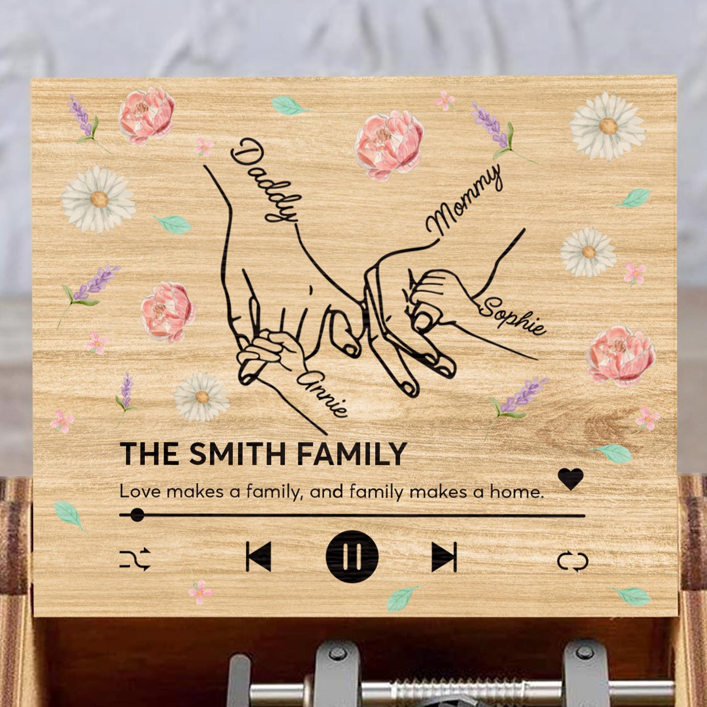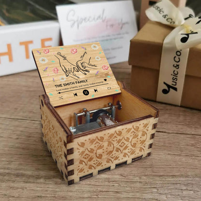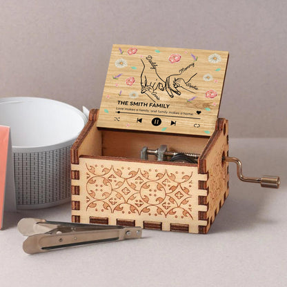 Love Makes A Family, Handprints And Flowers Design,Custom Music Box,Gift For Family