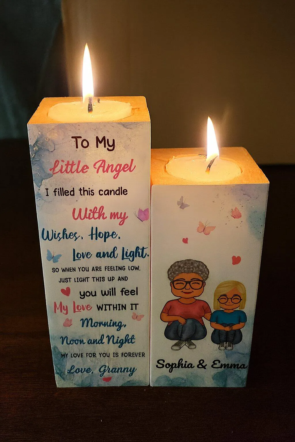Crea un ambiente cálido y romántico con nuestro juego de portavelas de madera personalizado . Fabricados en roble macizo e impresos con tecnología UV con tu diseño, estos portavelas añaden un toque emotivo a cualquier habitación u ocasión.