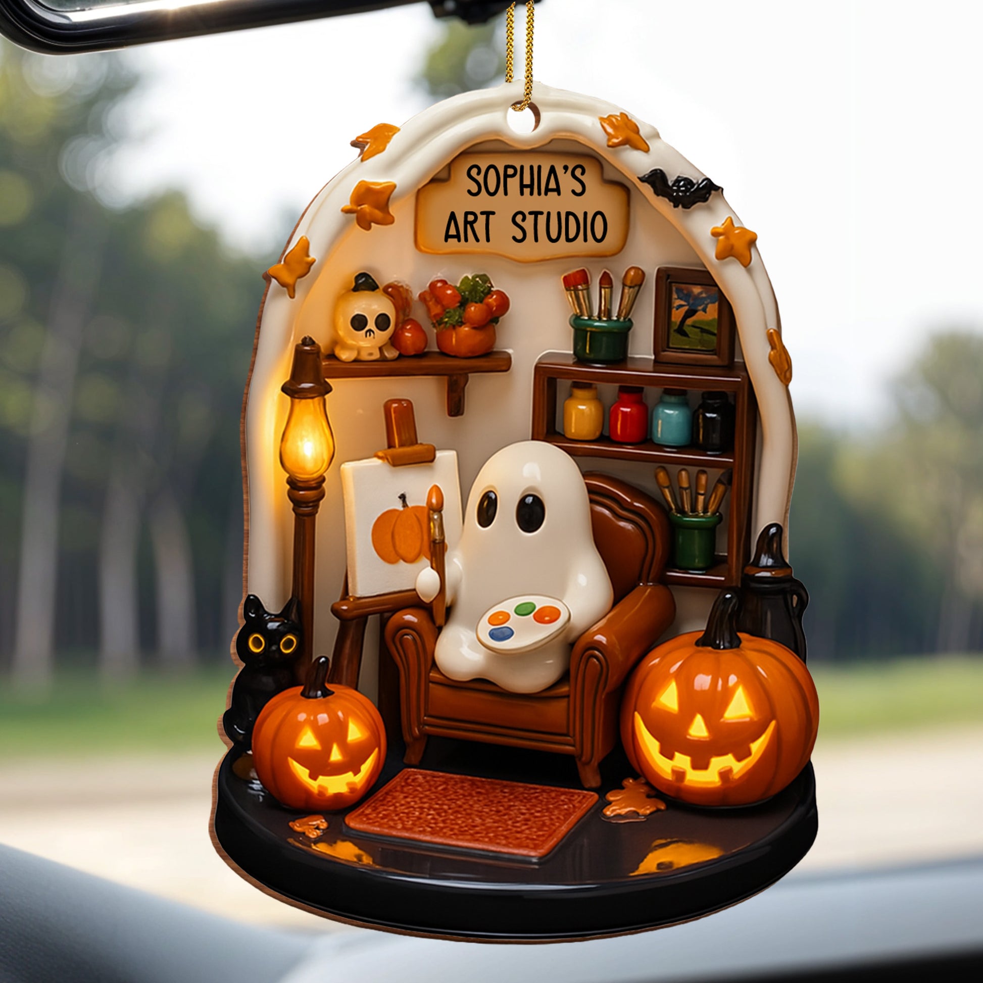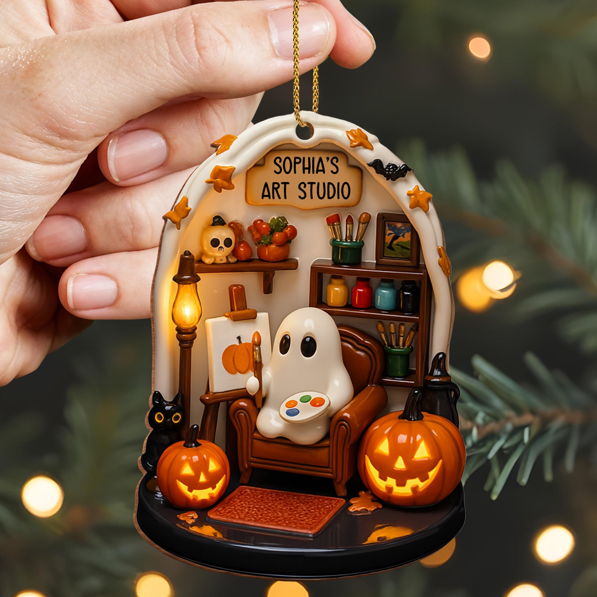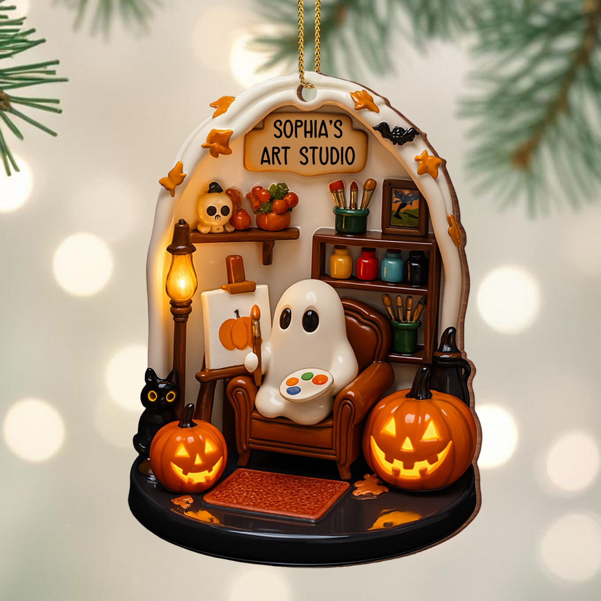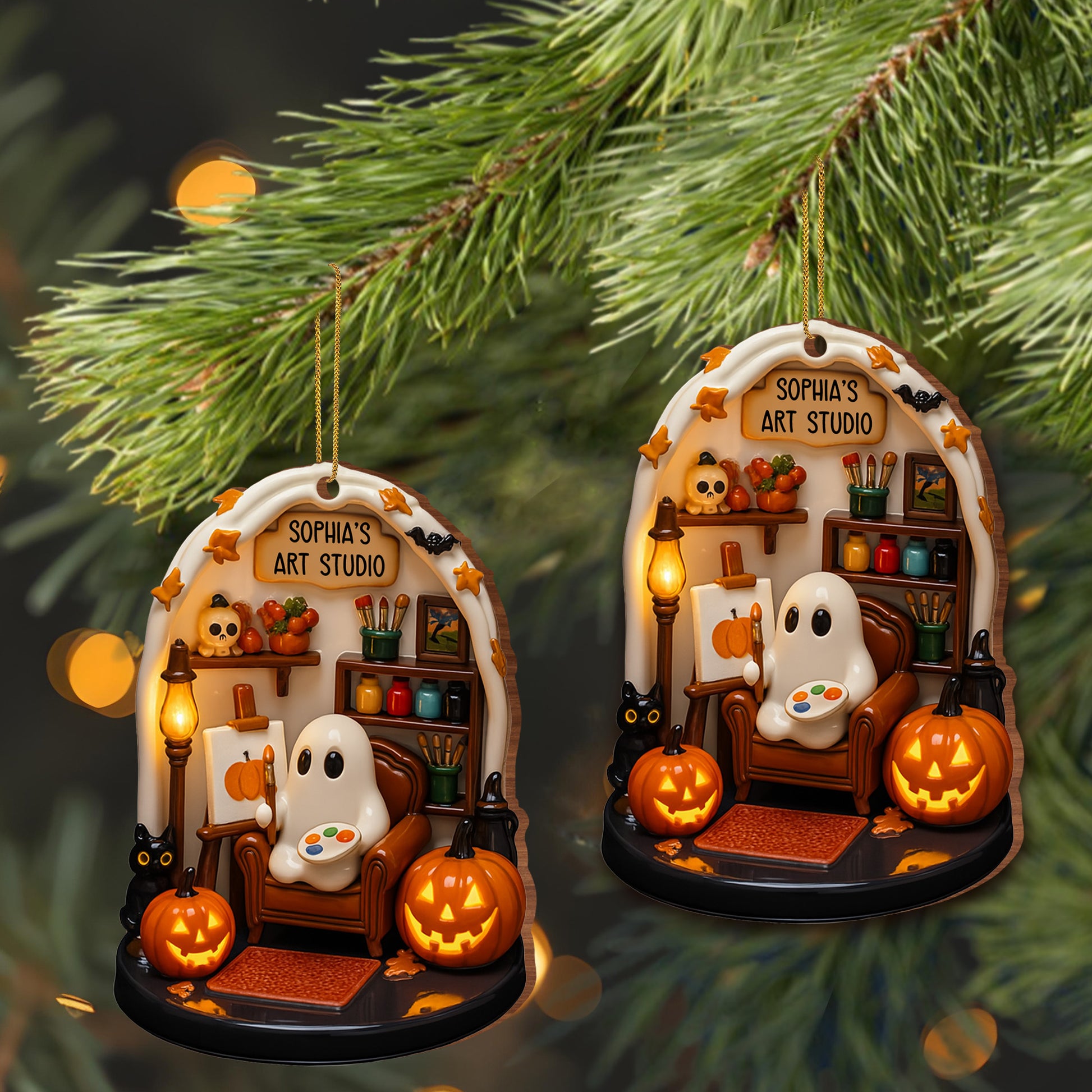 Your Art Studio With Ghost and Pumpkin, Custom Wood Ornament, Gift For Artists and Halloween Lovers