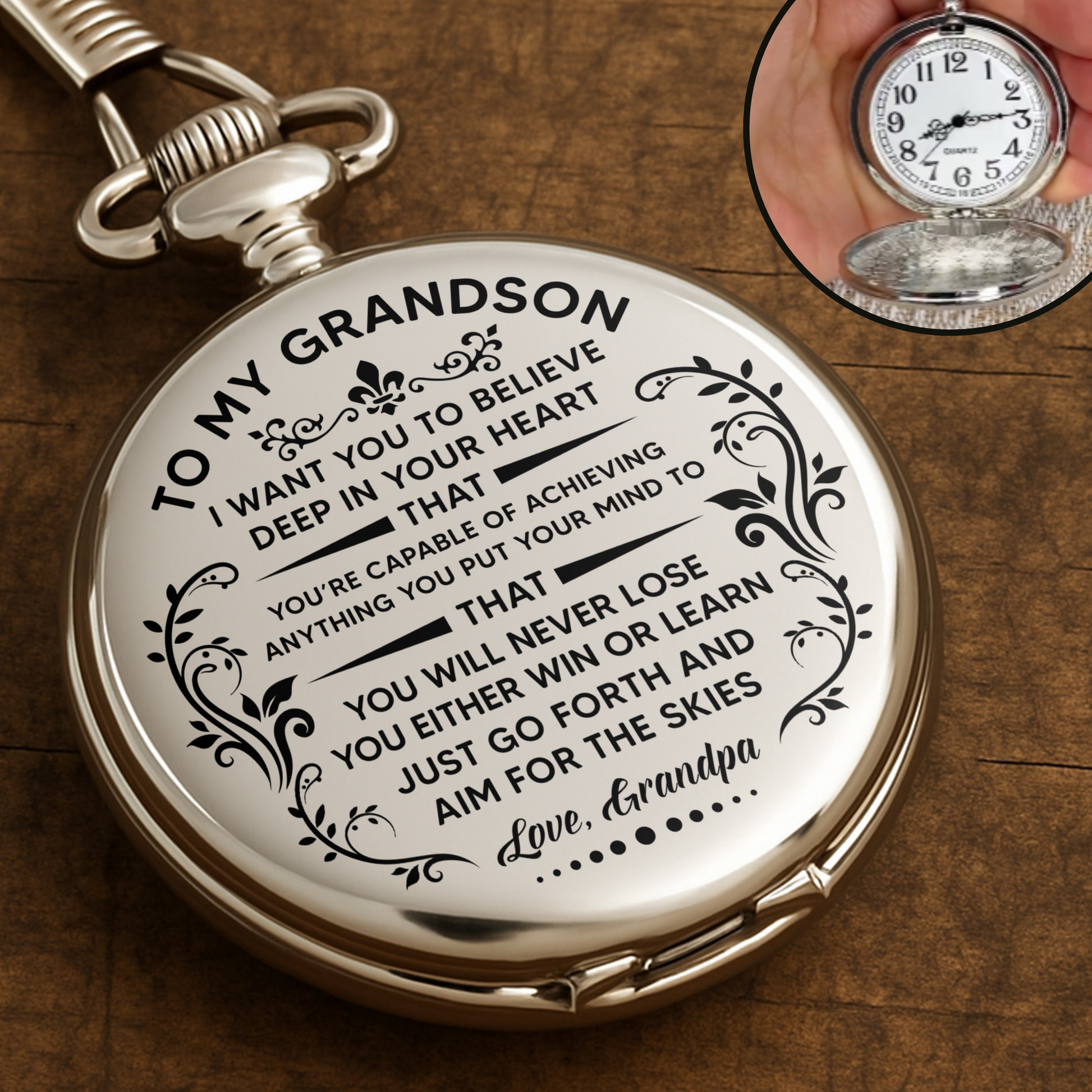À mon petit-fils, crois en toi avec des fioritures élégantes - Montre de poche plaquée argent personnalisée - GSN001_SWATCH