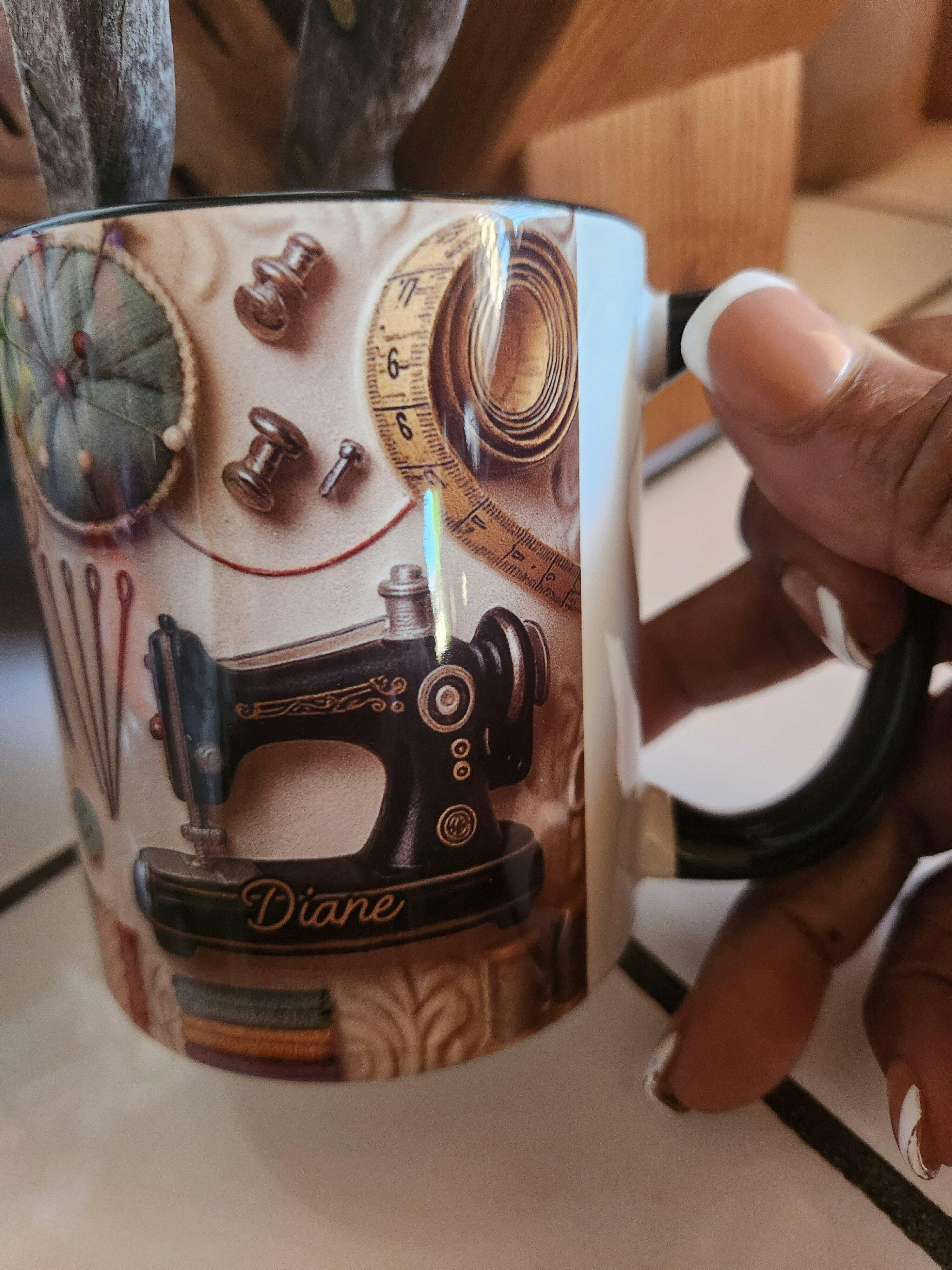 My beautiful "seamstress' cup" makes morning coffee such a treat. It reminds me of my favorite hobby as I start each day. I LOVE seeing my name printed across the sewing machine.