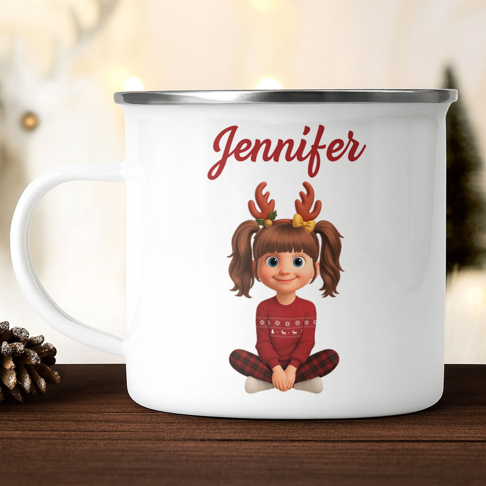 Customized Christmas Holiday Cartoon Girl With Reindeer Antlers,Enamel Mug,Gift For Daughters and Christmas Enthusiasts
