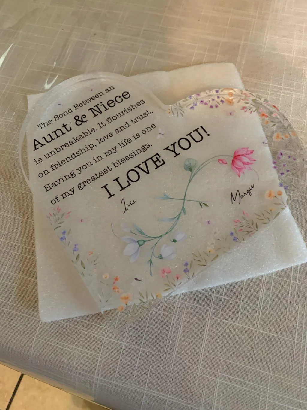 Célébrez vos moments précieux avec notre plaque acrylique personnalisée en forme de cœur . Cette plaque sur mesure de haute qualité est un souvenir magnifique et durable, parfait pour mettre en valeur vos messages et souvenirs les plus sincères.