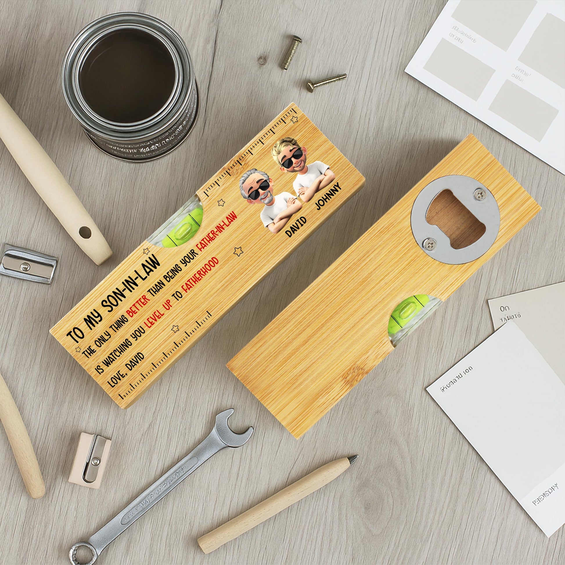 À mon gendre, la seule chose qui soit meilleure que d'être ton beau-père - Niveau à bulle en bois personnalisé avec décapsuleur - FAM005_PLEV