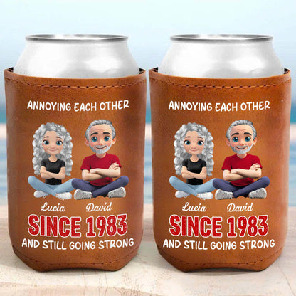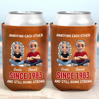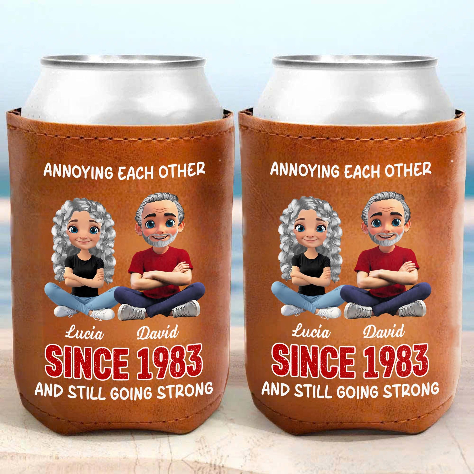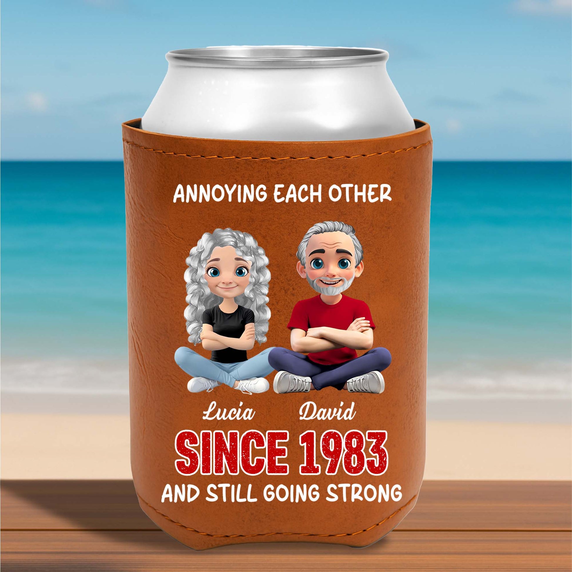 Annoying Each Other Since 1983, Cartoon Couple Design, Personalized Leather Can Cooler, Gift For Couples