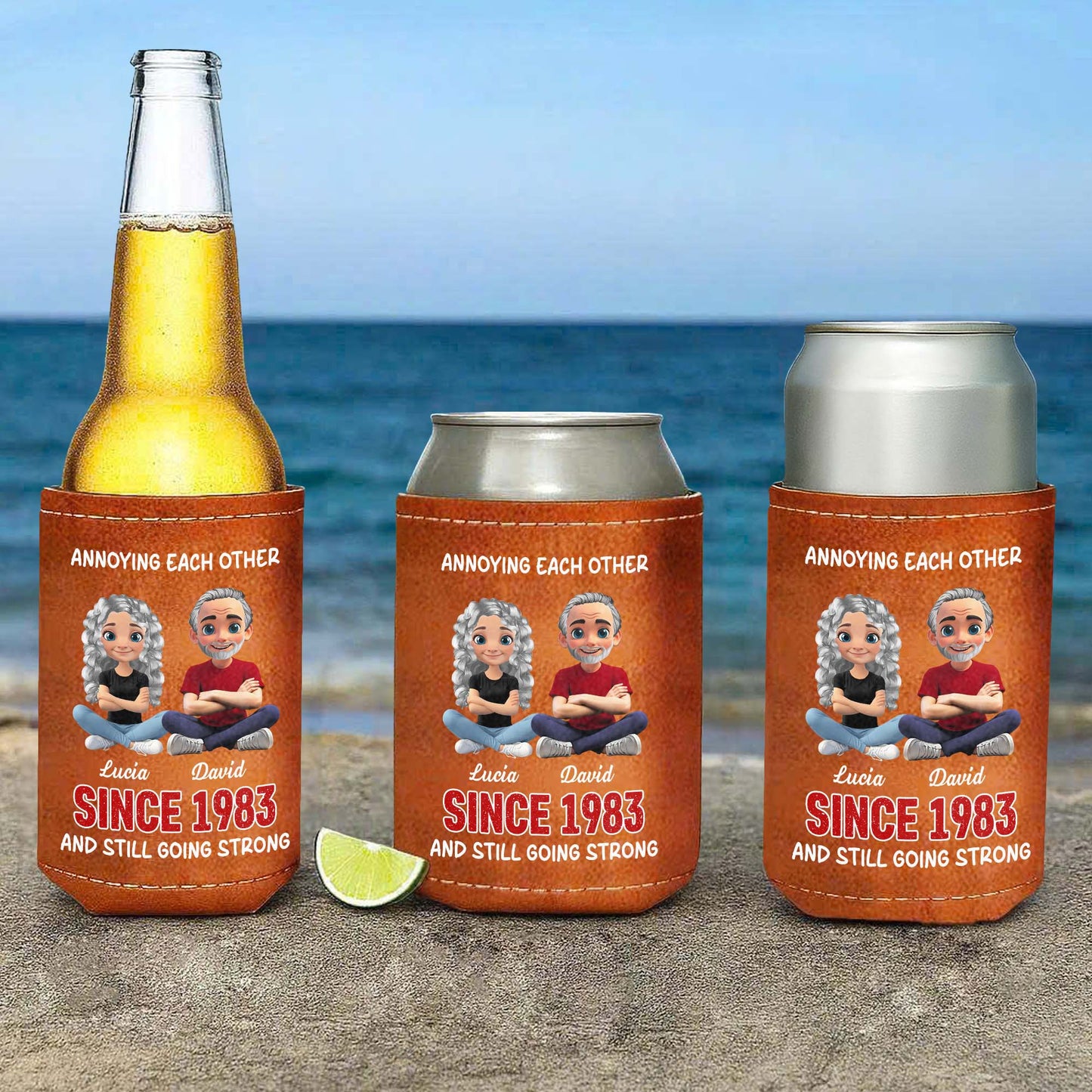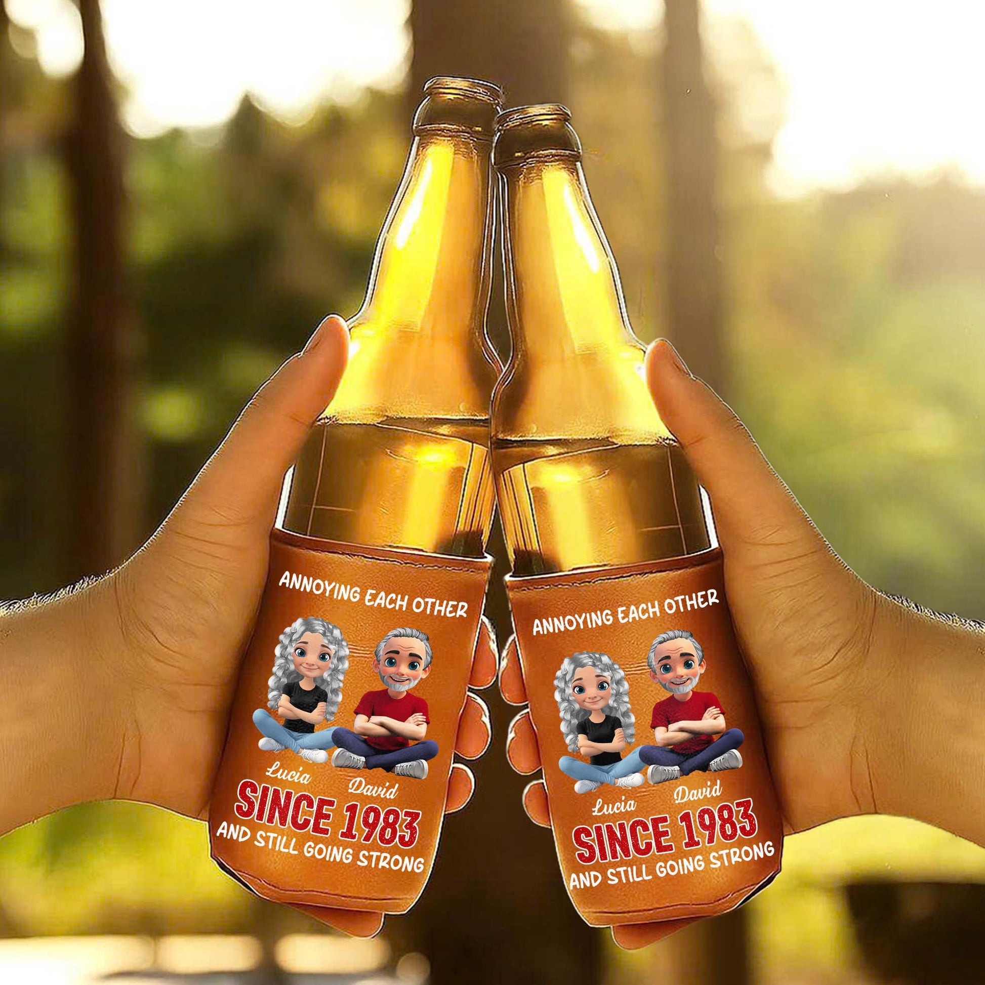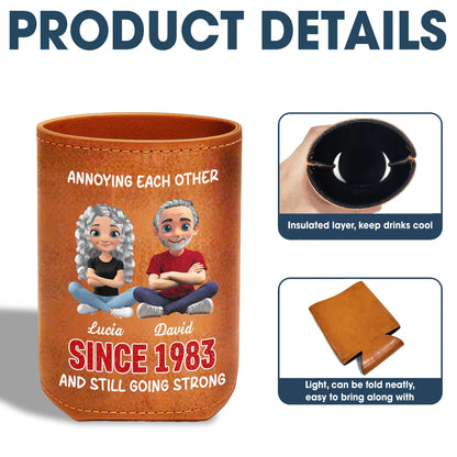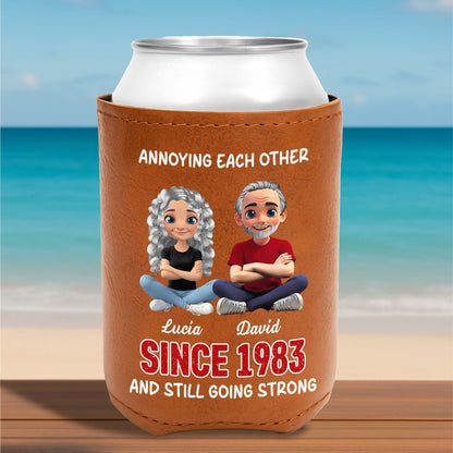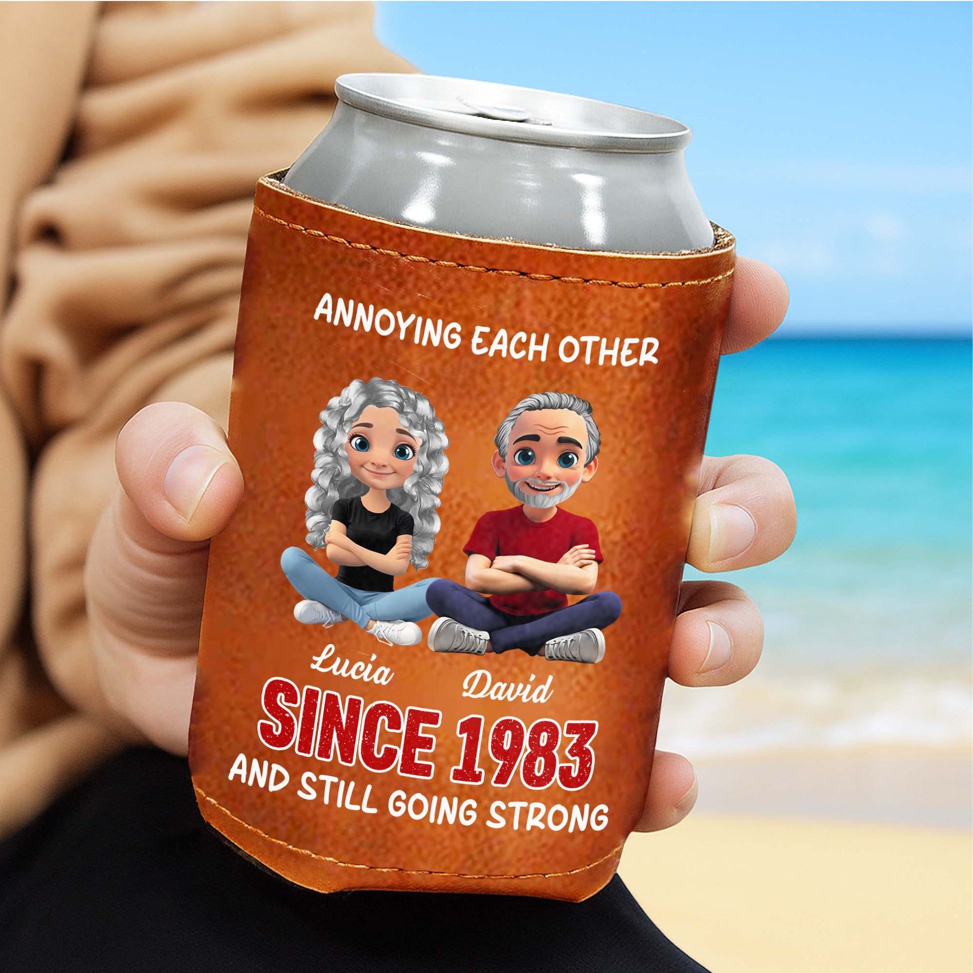 Annoying Each Other Since 1983, Cartoon Couple Design, Personalized Leather Can Cooler, Gift For Couples