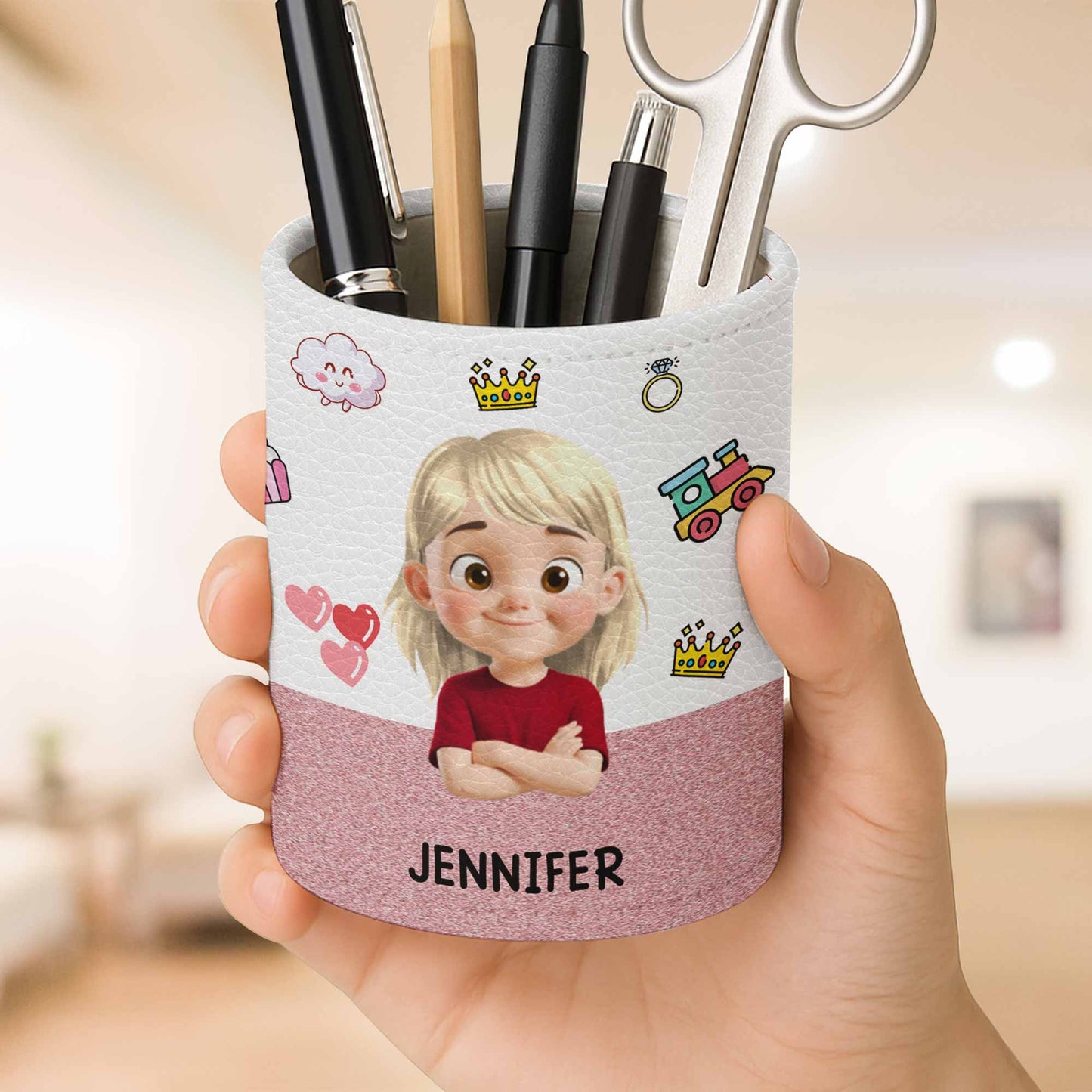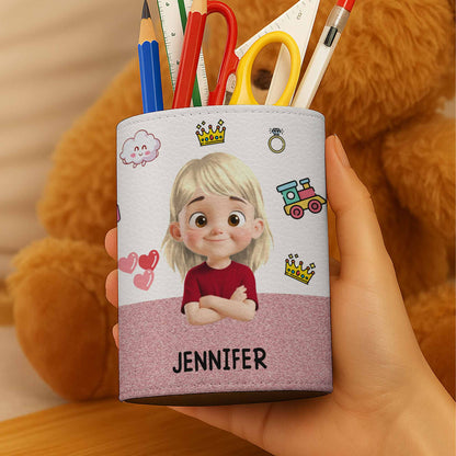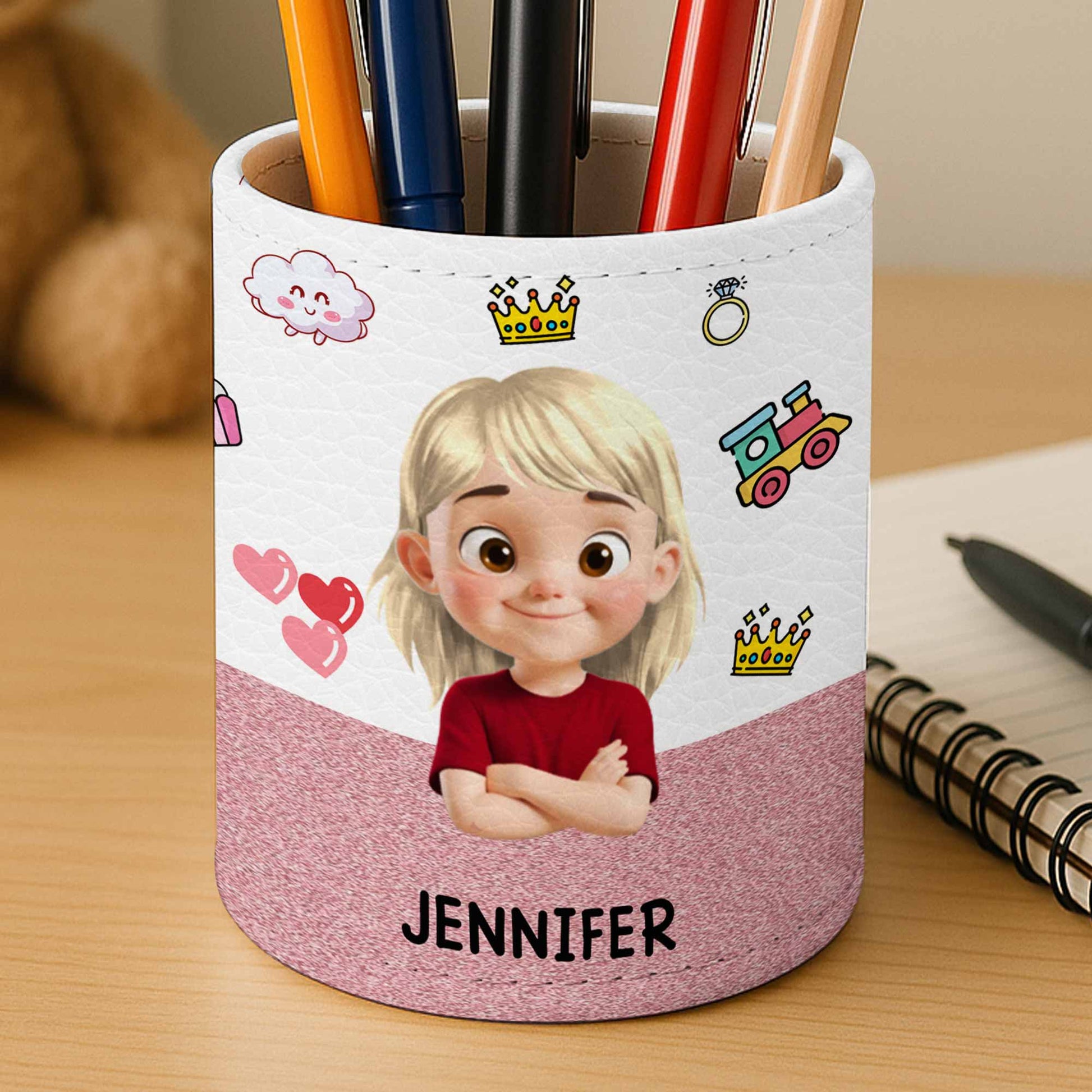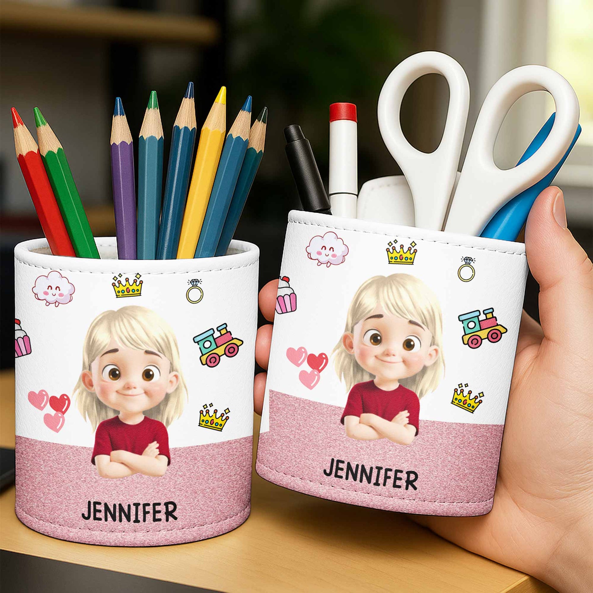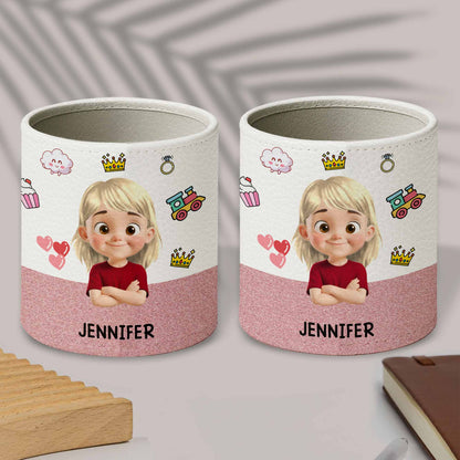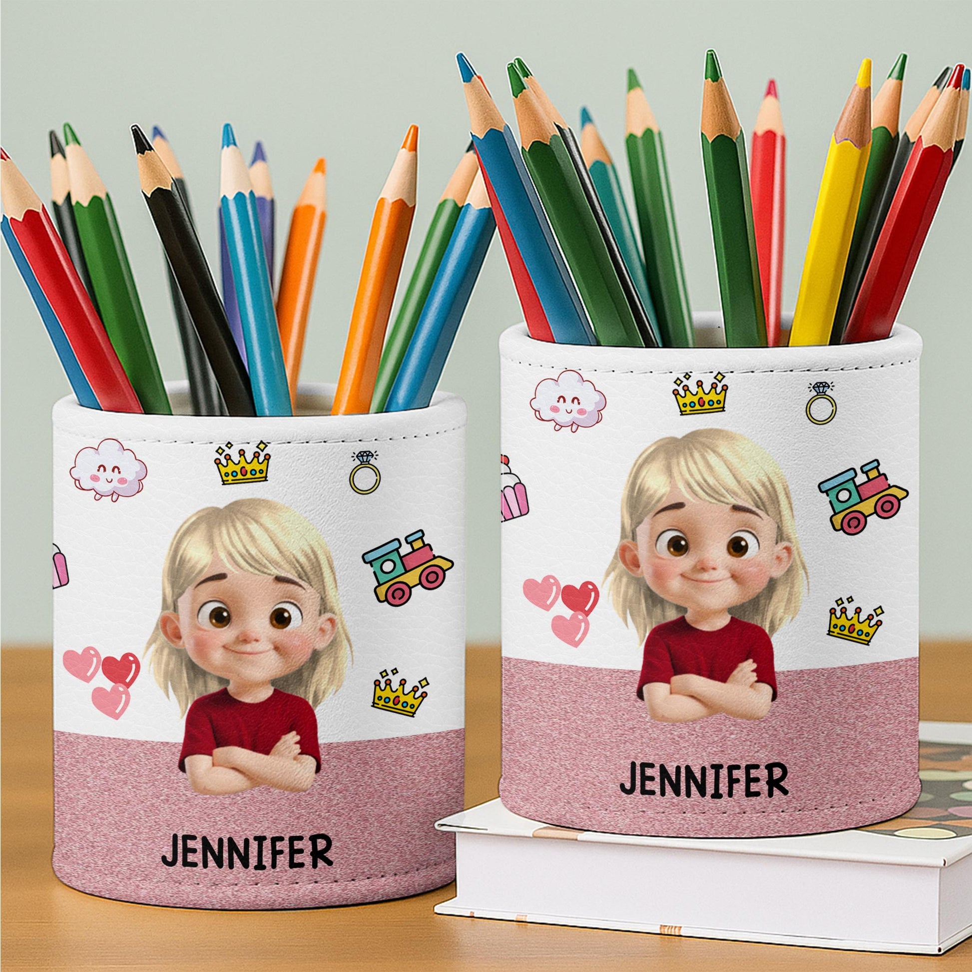 Message: Create a cute and colorful space for your child's art supplies with this customizable pen holder featuring a sweet animated princess surrounded by hearts and crowns.