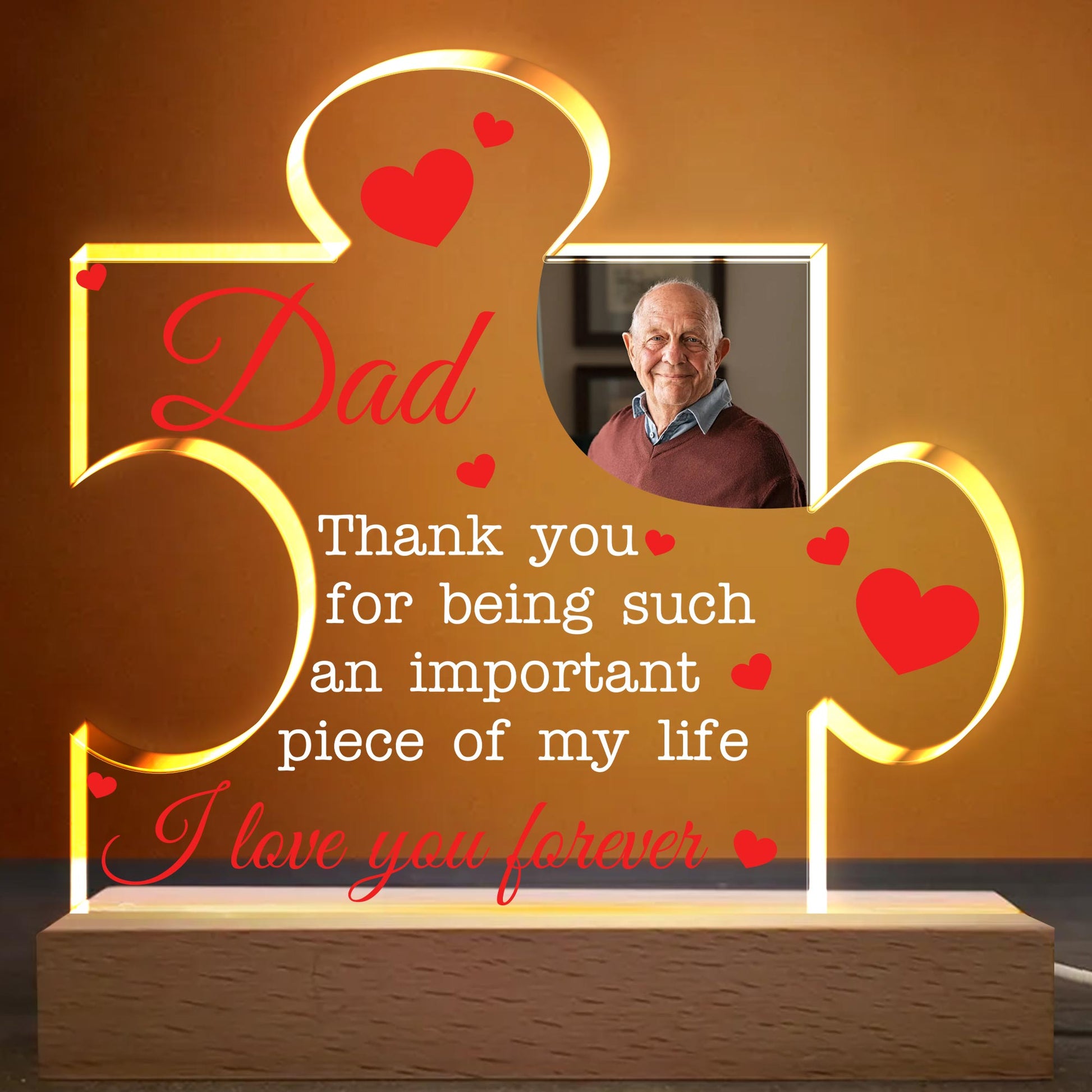 Dad, Thank You For Being Such An Important Piece Of My Life, Hearts and Puzzle Piece - Personalized LED Night Light With Wooden Base - DAD107_LEWO