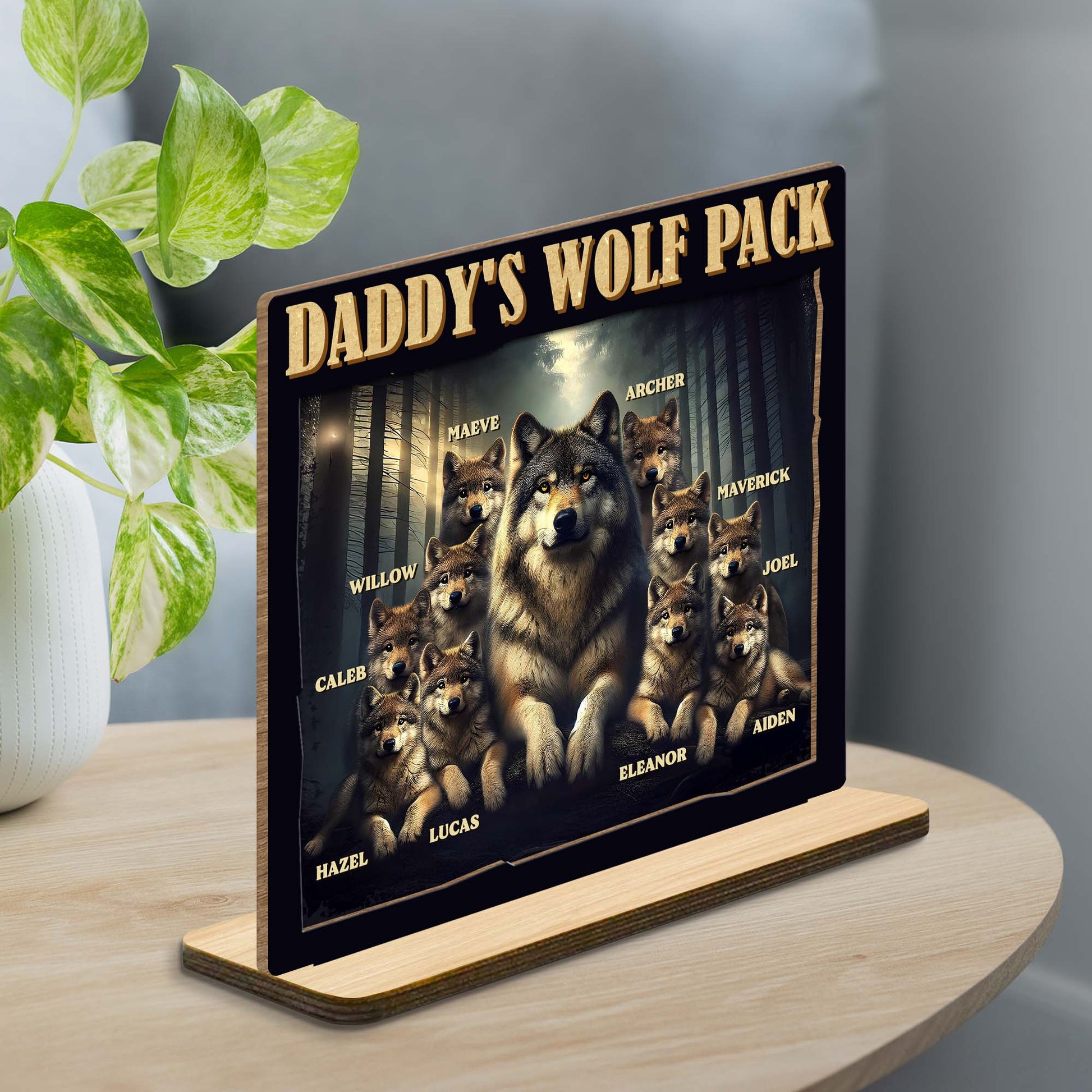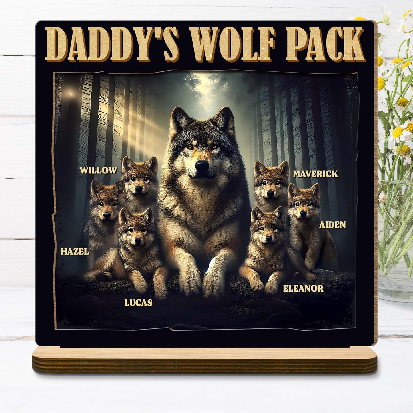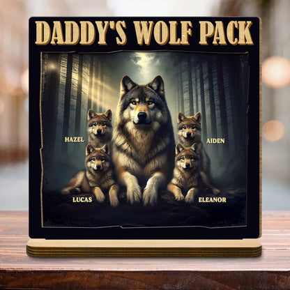 Daddy's Wolf Pack Featuring Majestic Wolves - Personalized Custom 2-Layer Wood Plaque With Flat Base - DAD208_WPLA