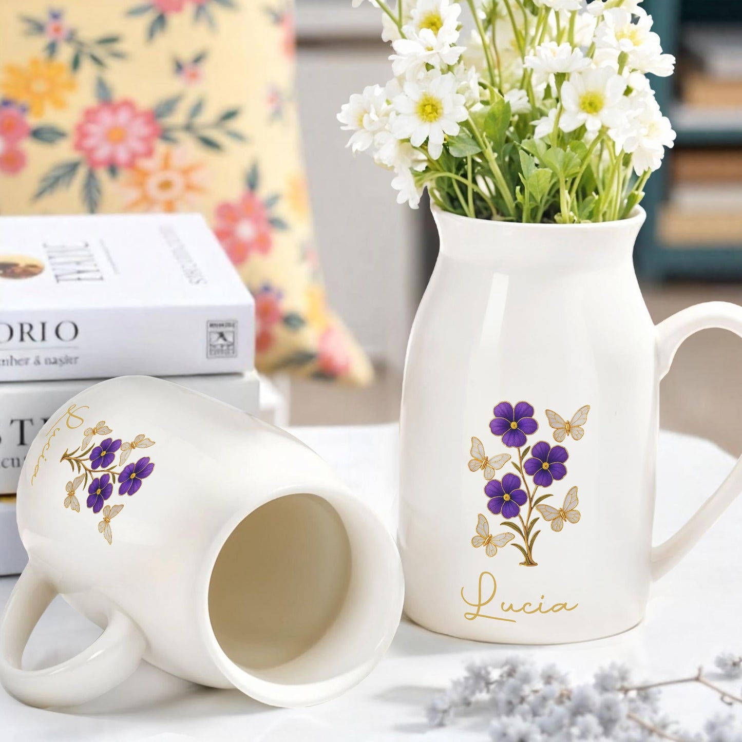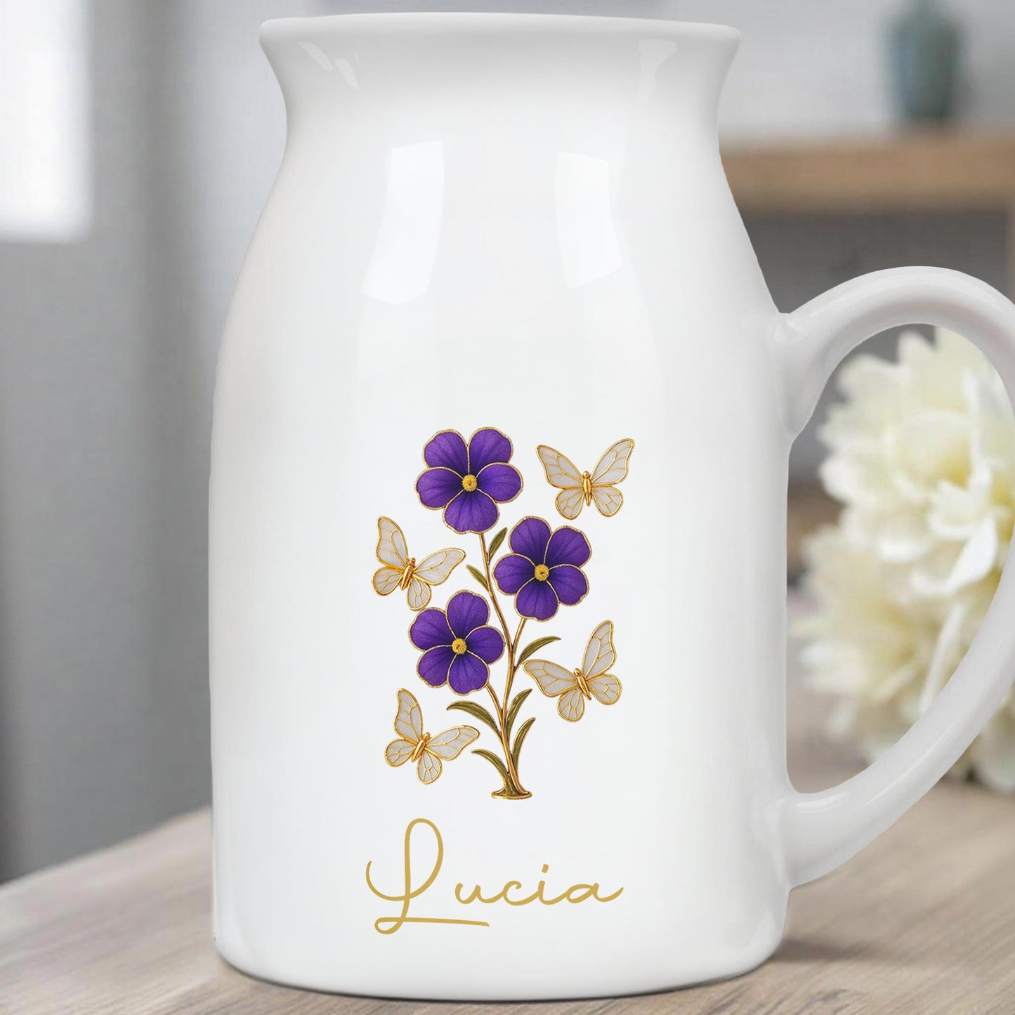 Elegant Flowers And Fluttering Butterflies Design, Personalized Ceramic Flower Vase, Gift For Family And Nature Lovers