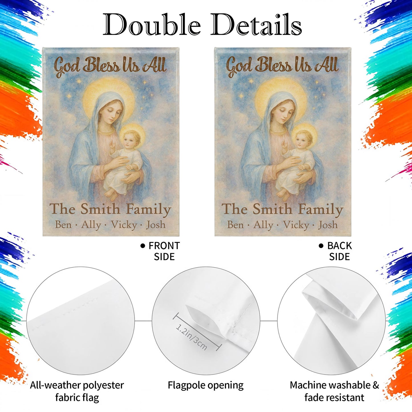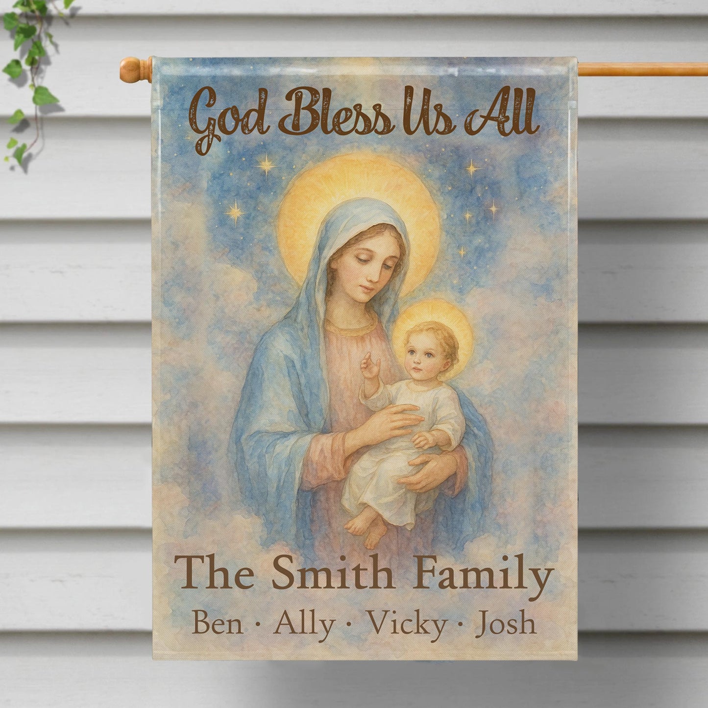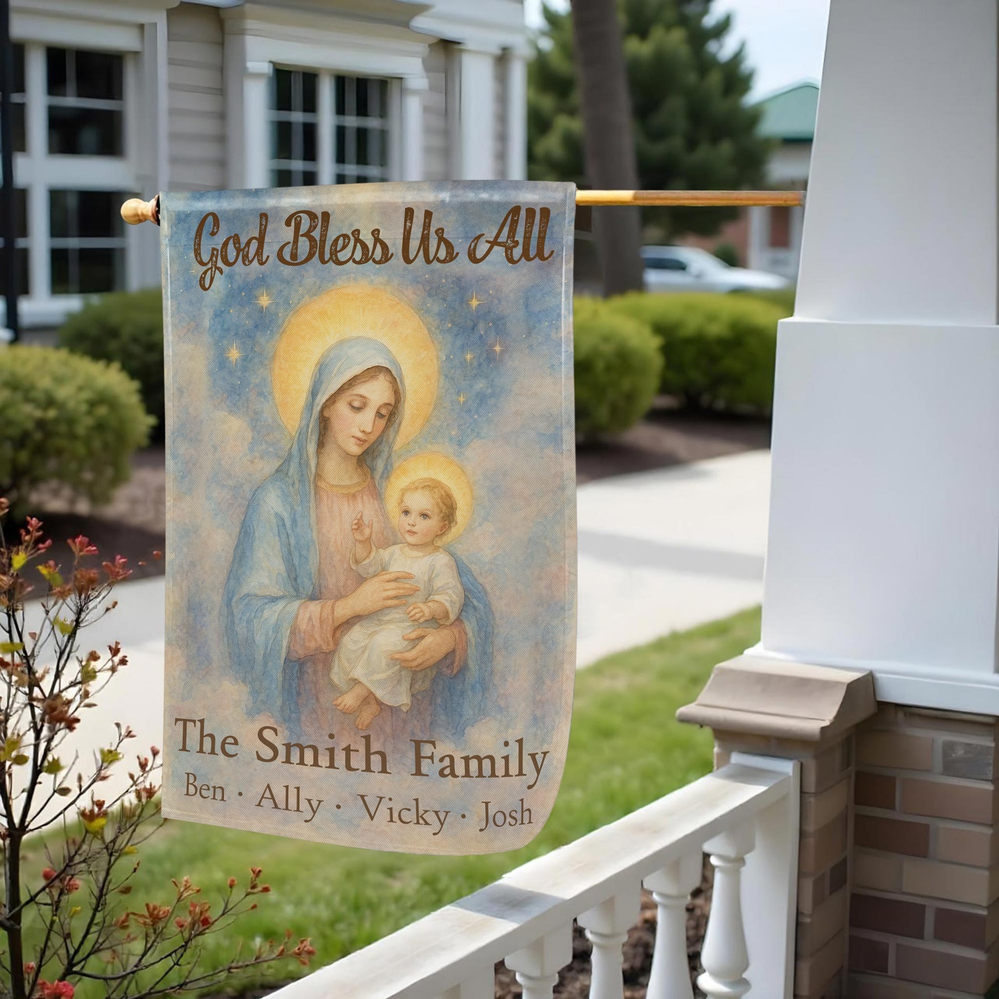 God Bless Us All, Virgin Mary and Child, Personalized Flag, Gift For Religious Families