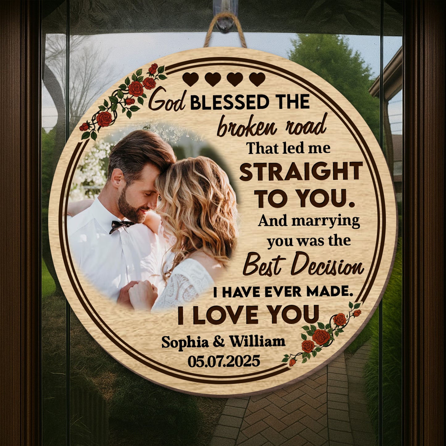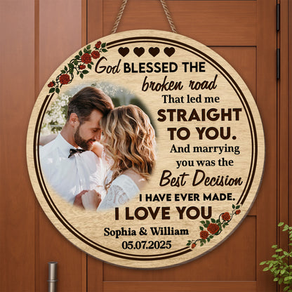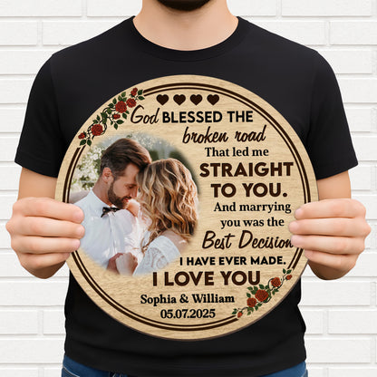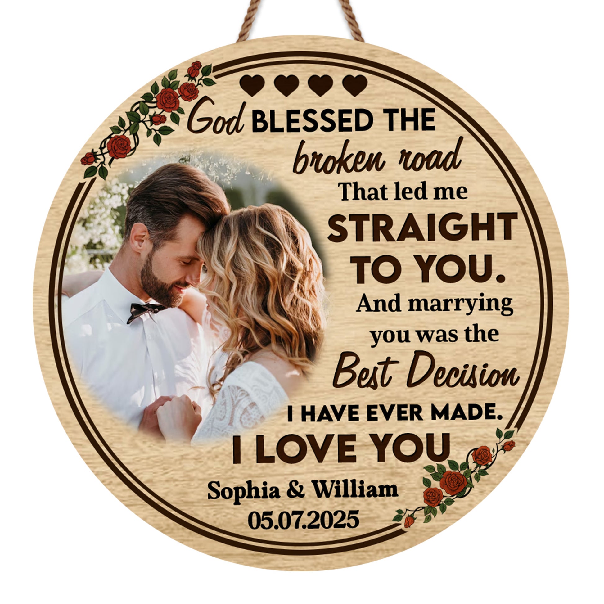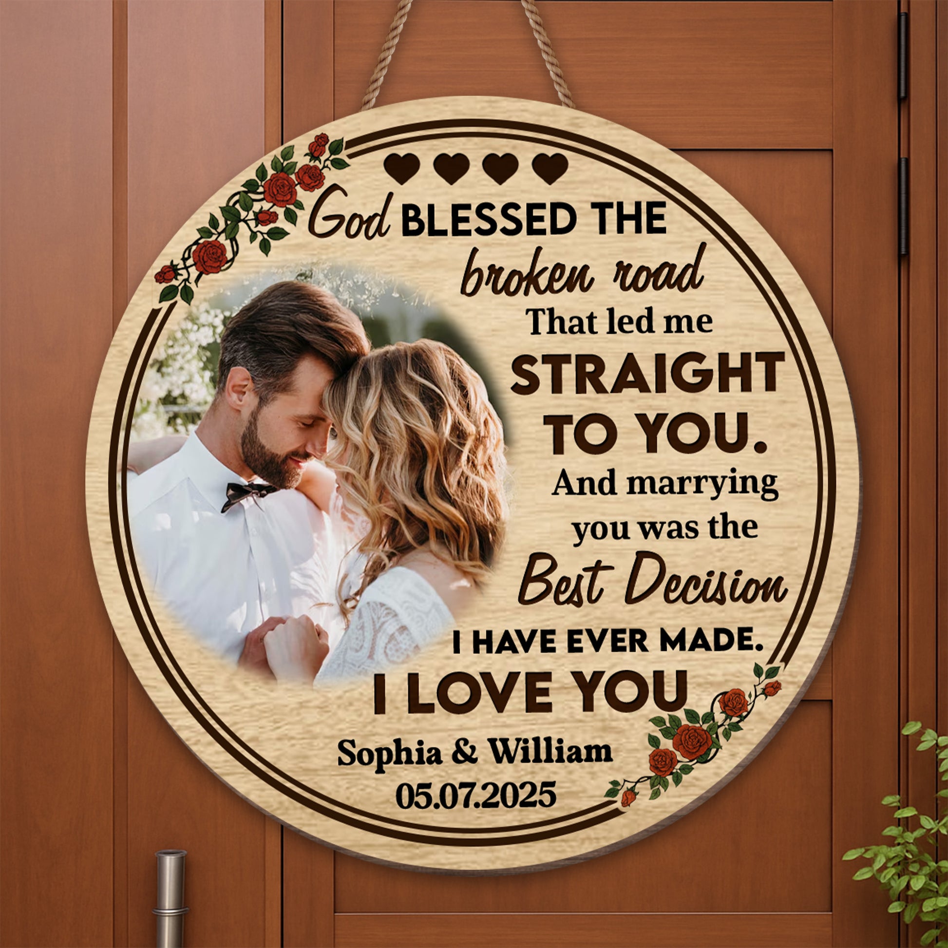 God Blessed The Broken Road, Roses And Hearts Design, Custom Wood Sign, Gift For Spouses