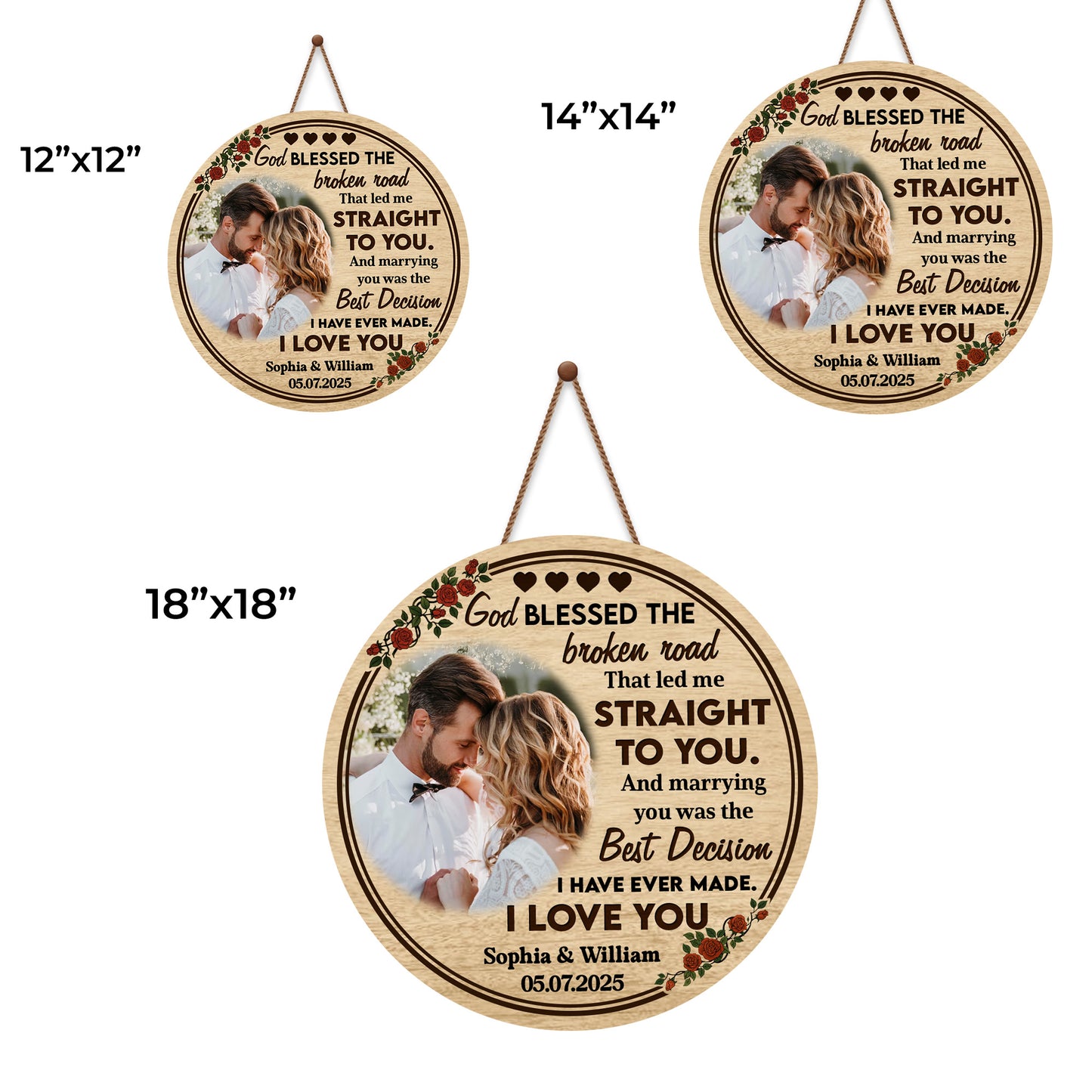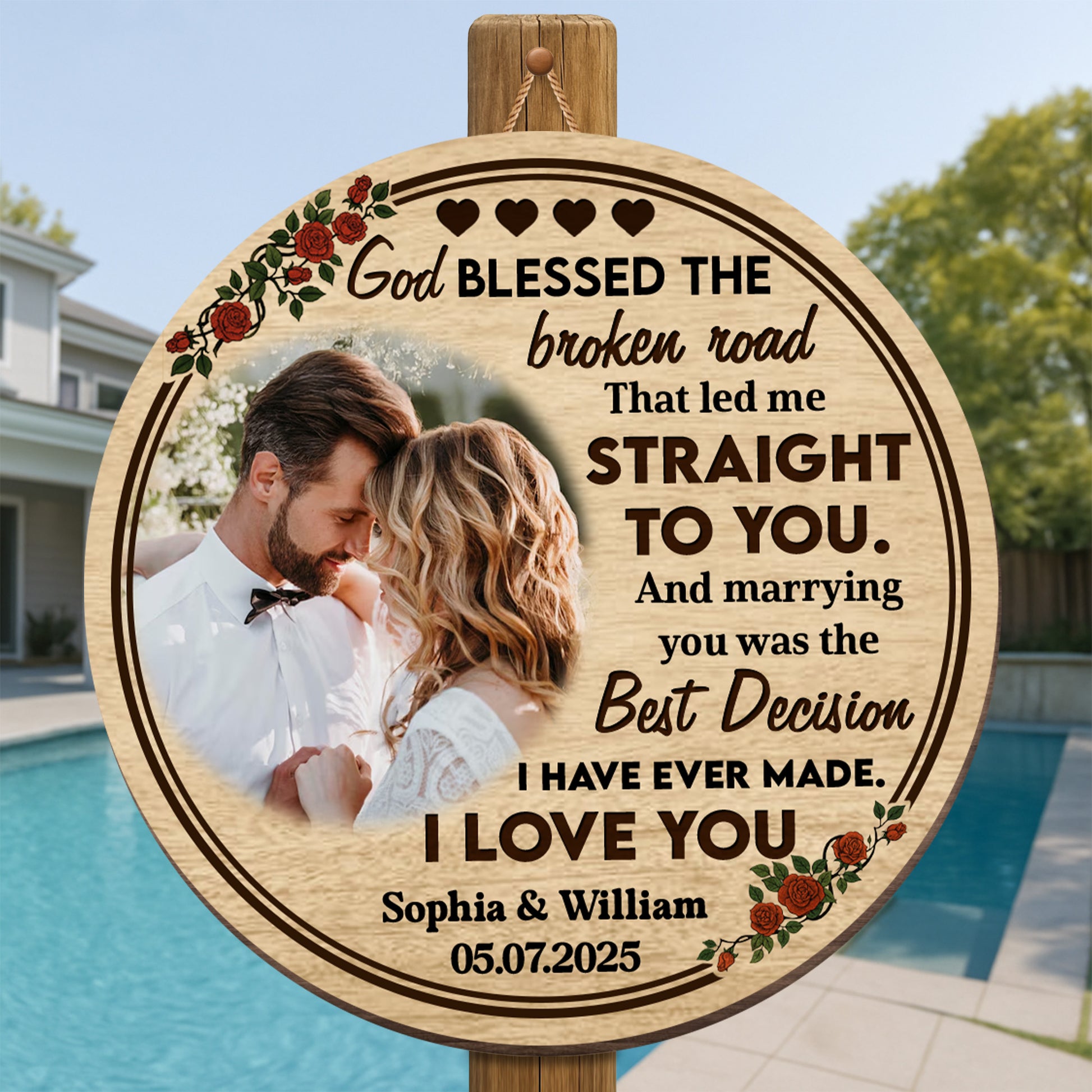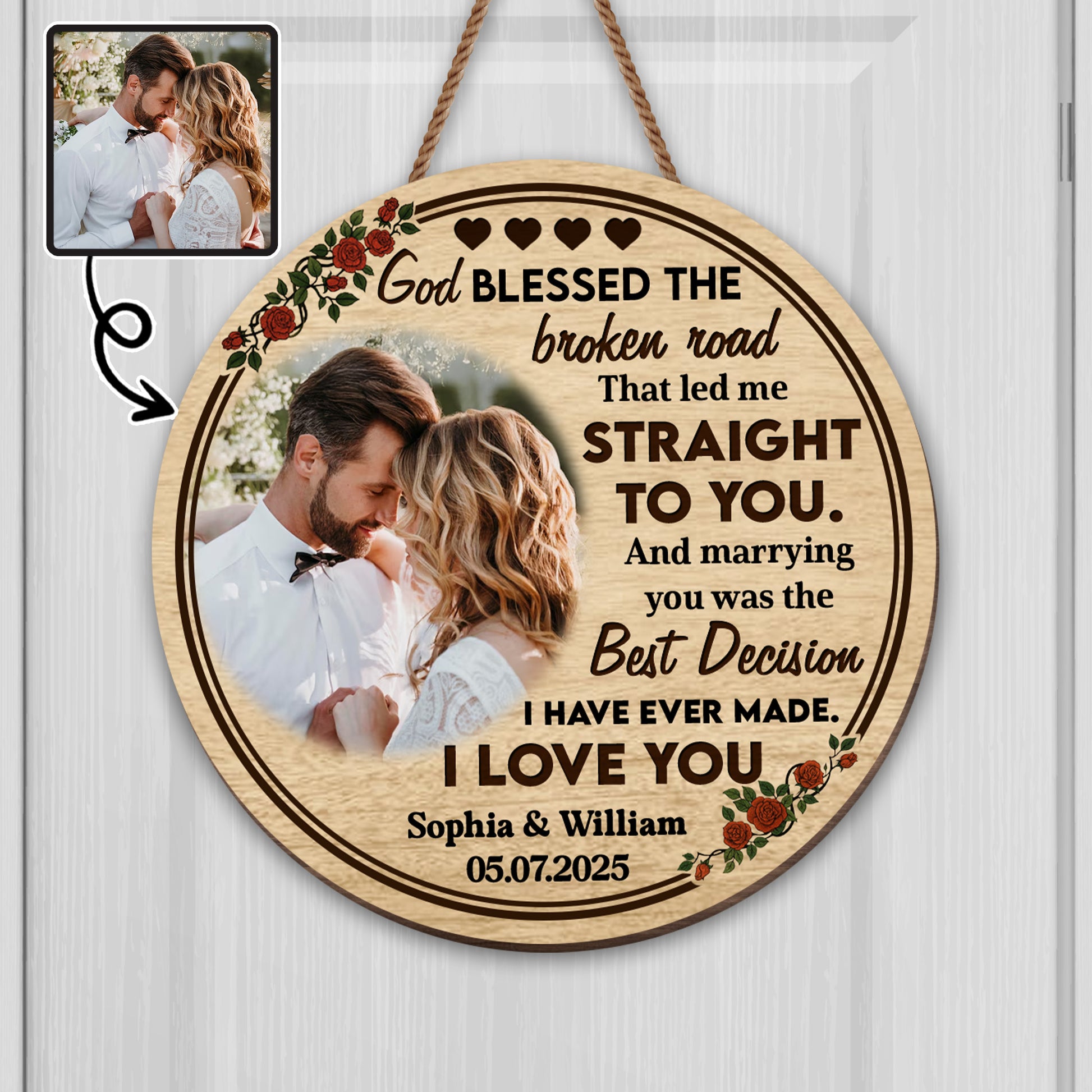 God Blessed The Broken Road, Roses And Hearts Design, Custom Wood Sign, Gift For Spouses