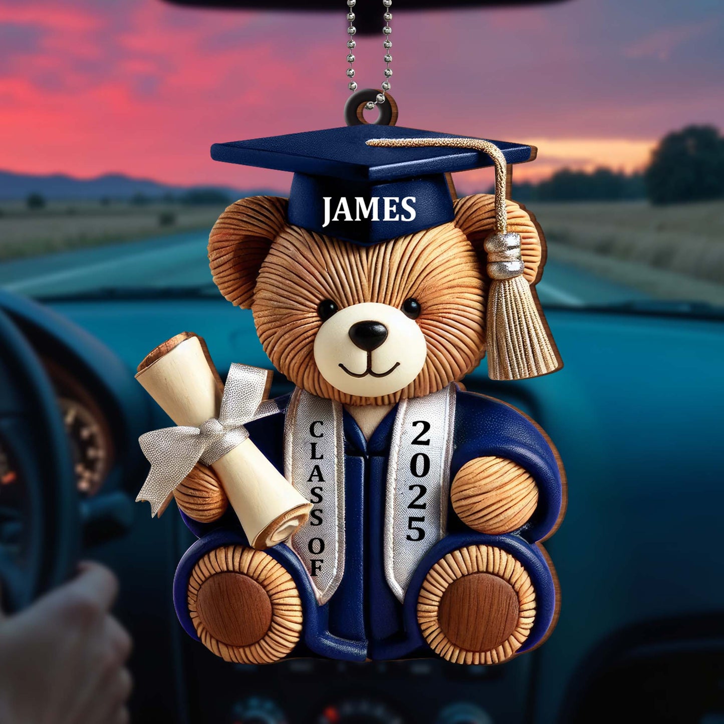 Graduation Teddy Bear With Cap And Diploma - Personalized Custom Wood Ornament, Car Hanging Ornament - GRAD005_WCA