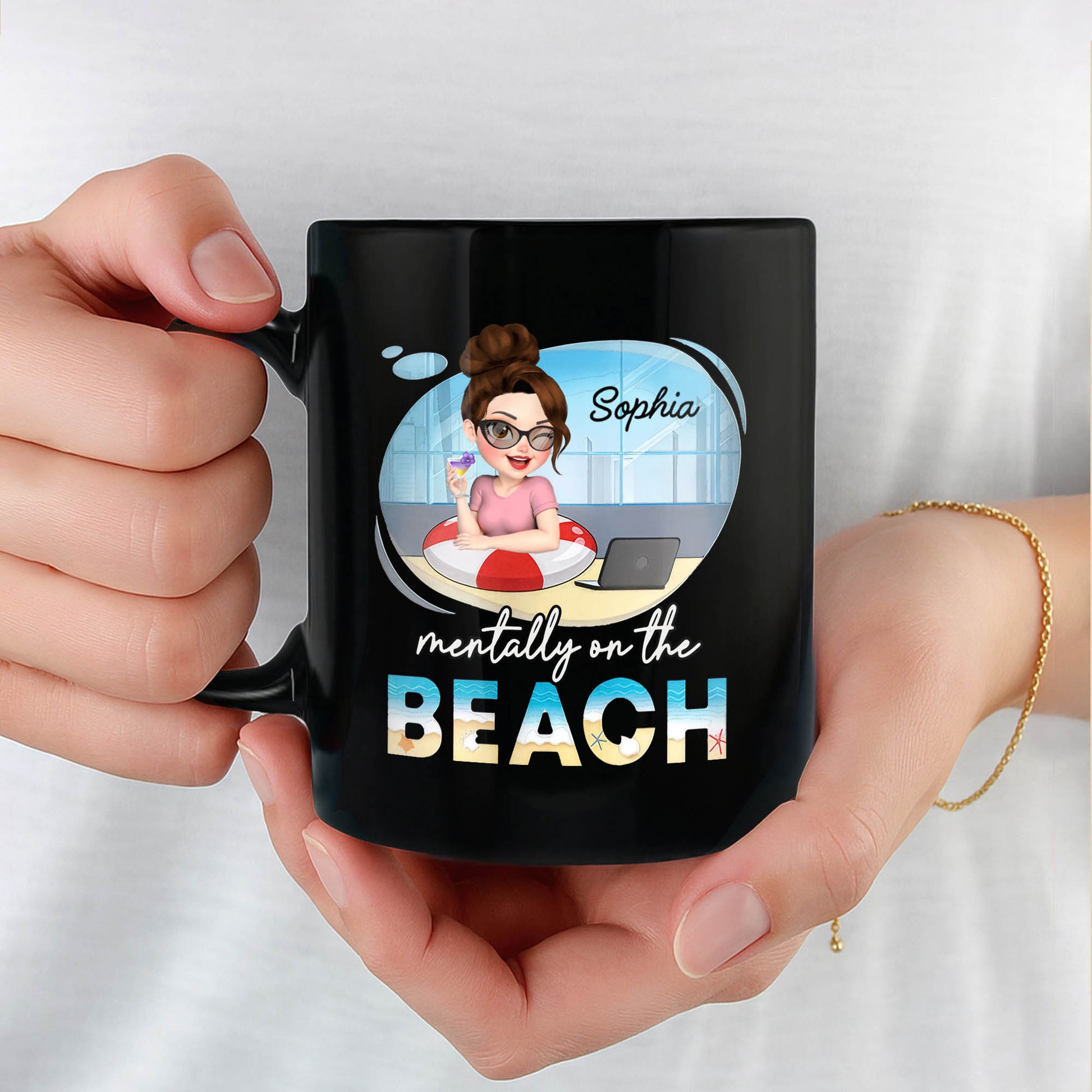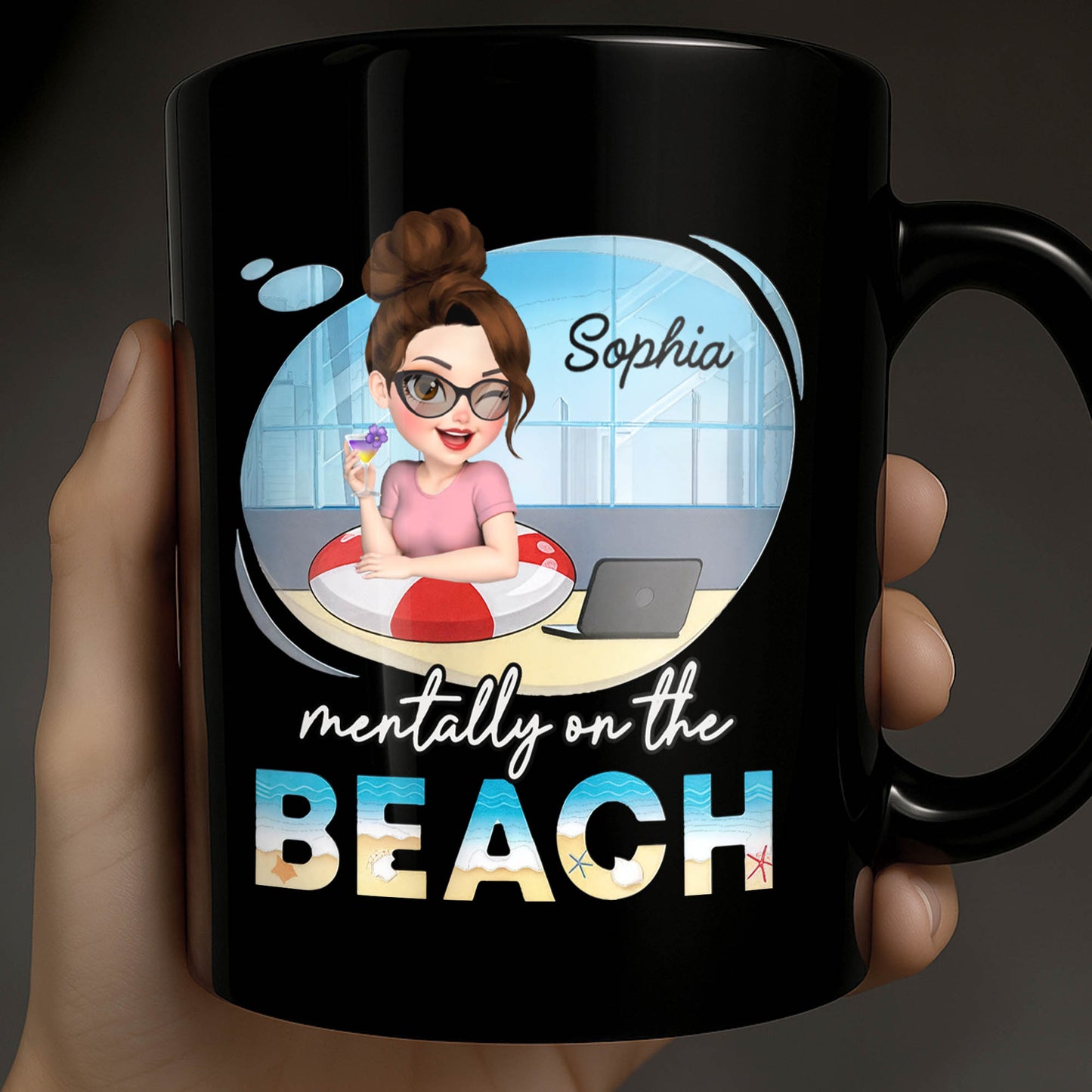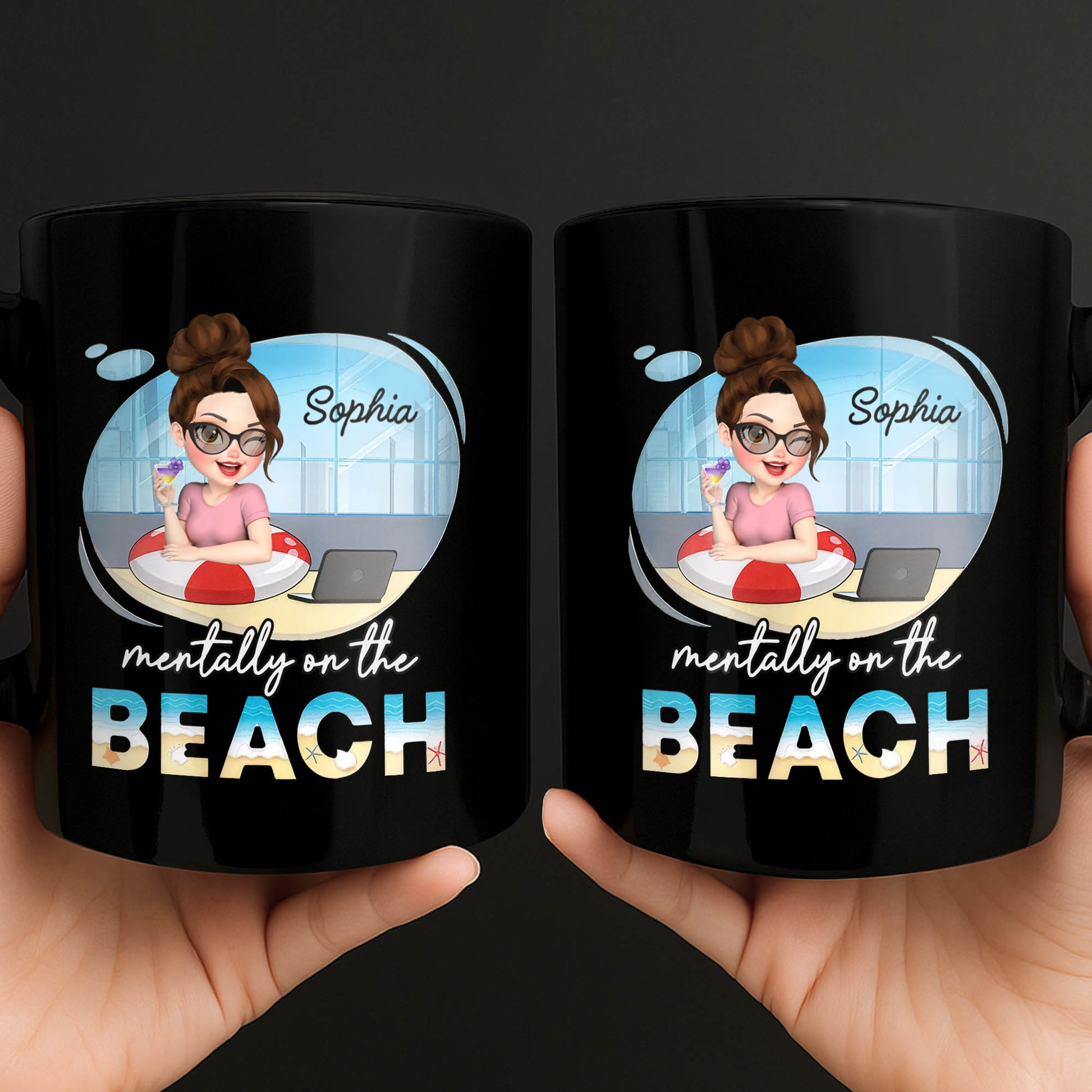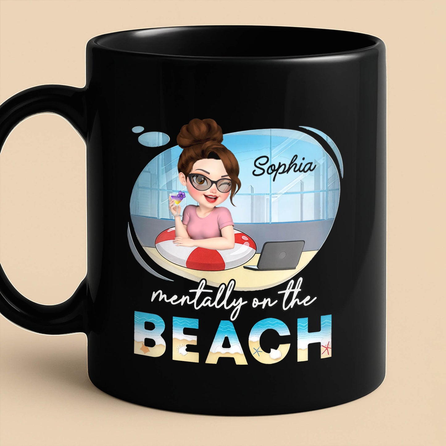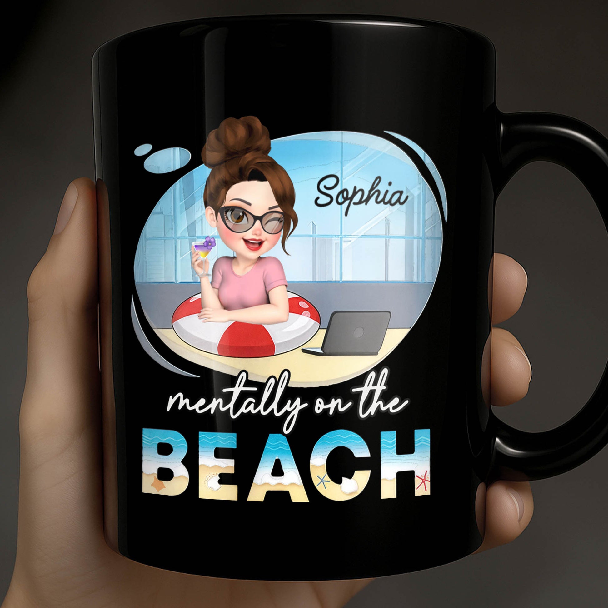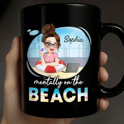 Mentally On The Beach With Laptop And Office Chair, Custom Black Mug, Gift For Besties And Beach Lovers