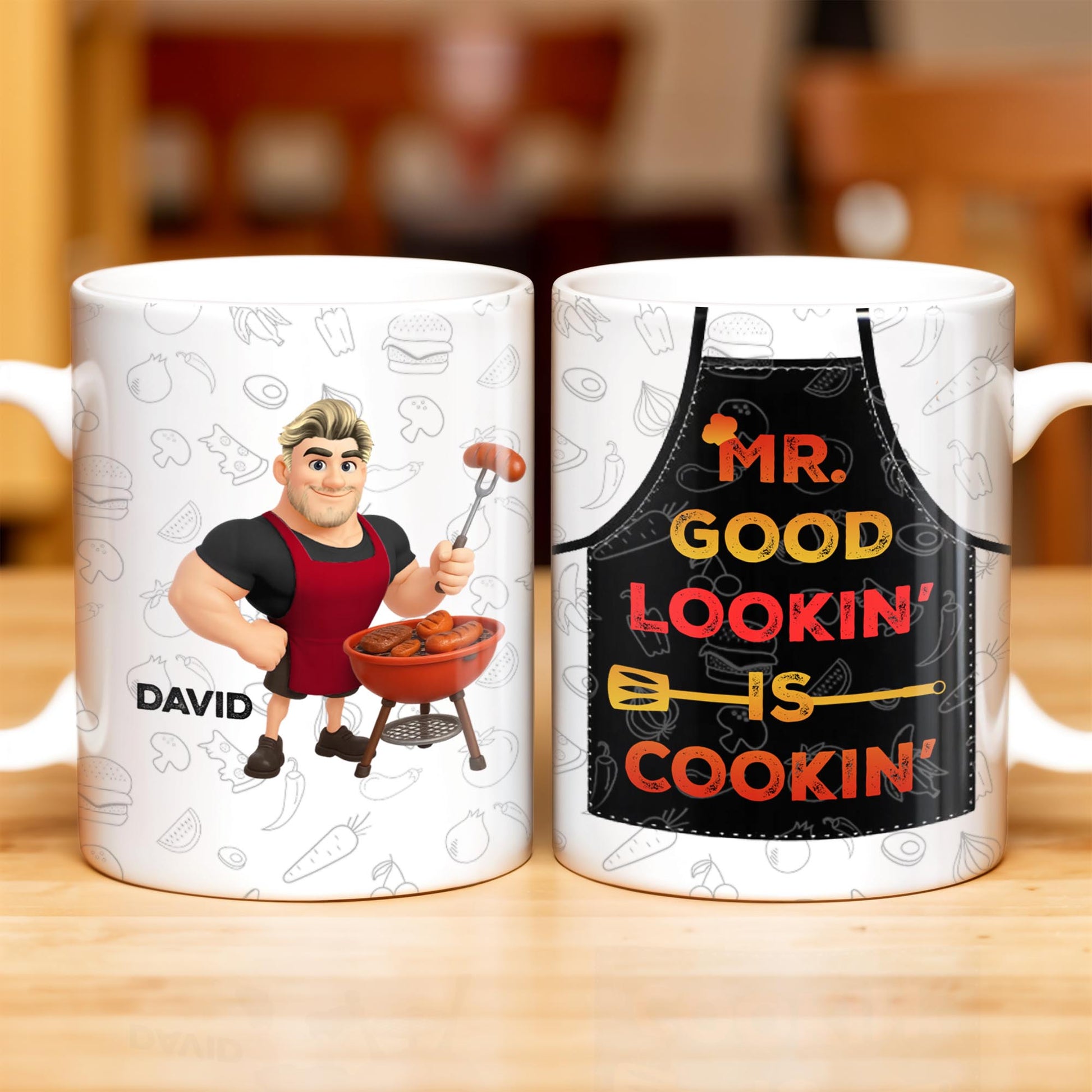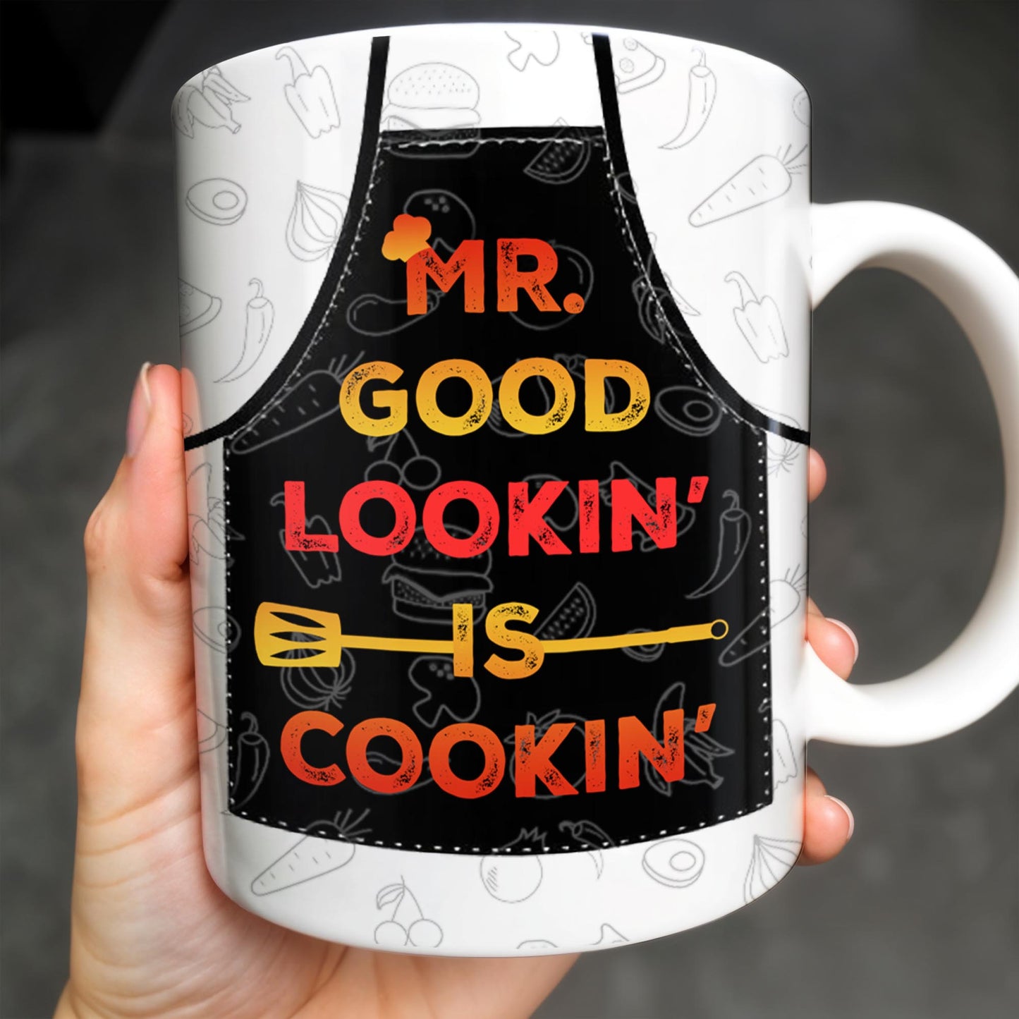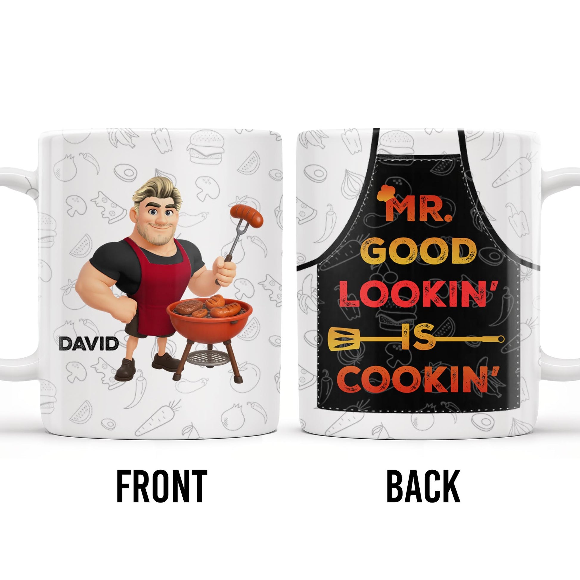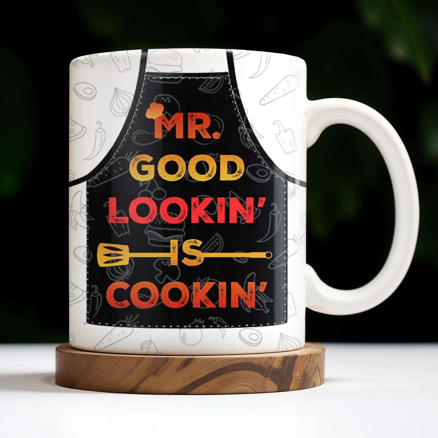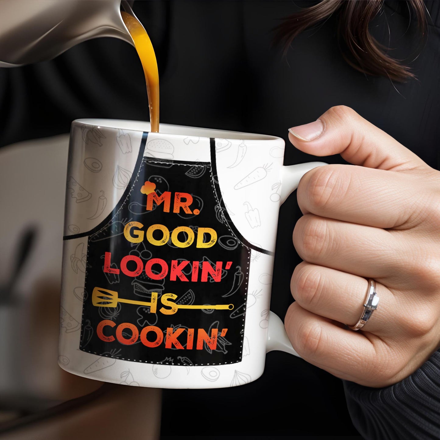Mr. Good Lookin' Is Cookin' Apron And BBQ Grill Design, Coffee Mug, Gift For Husband and Cooking Lovers
