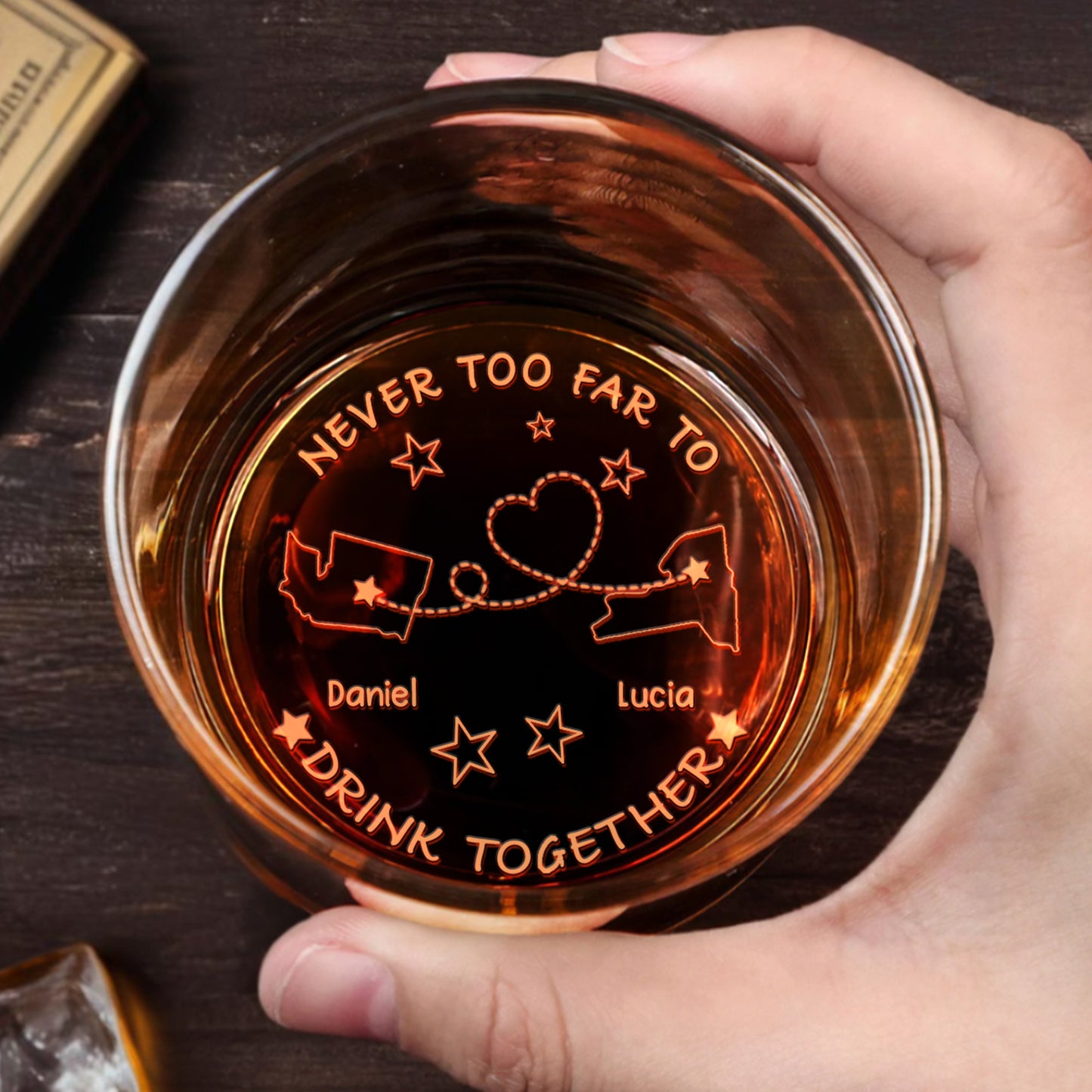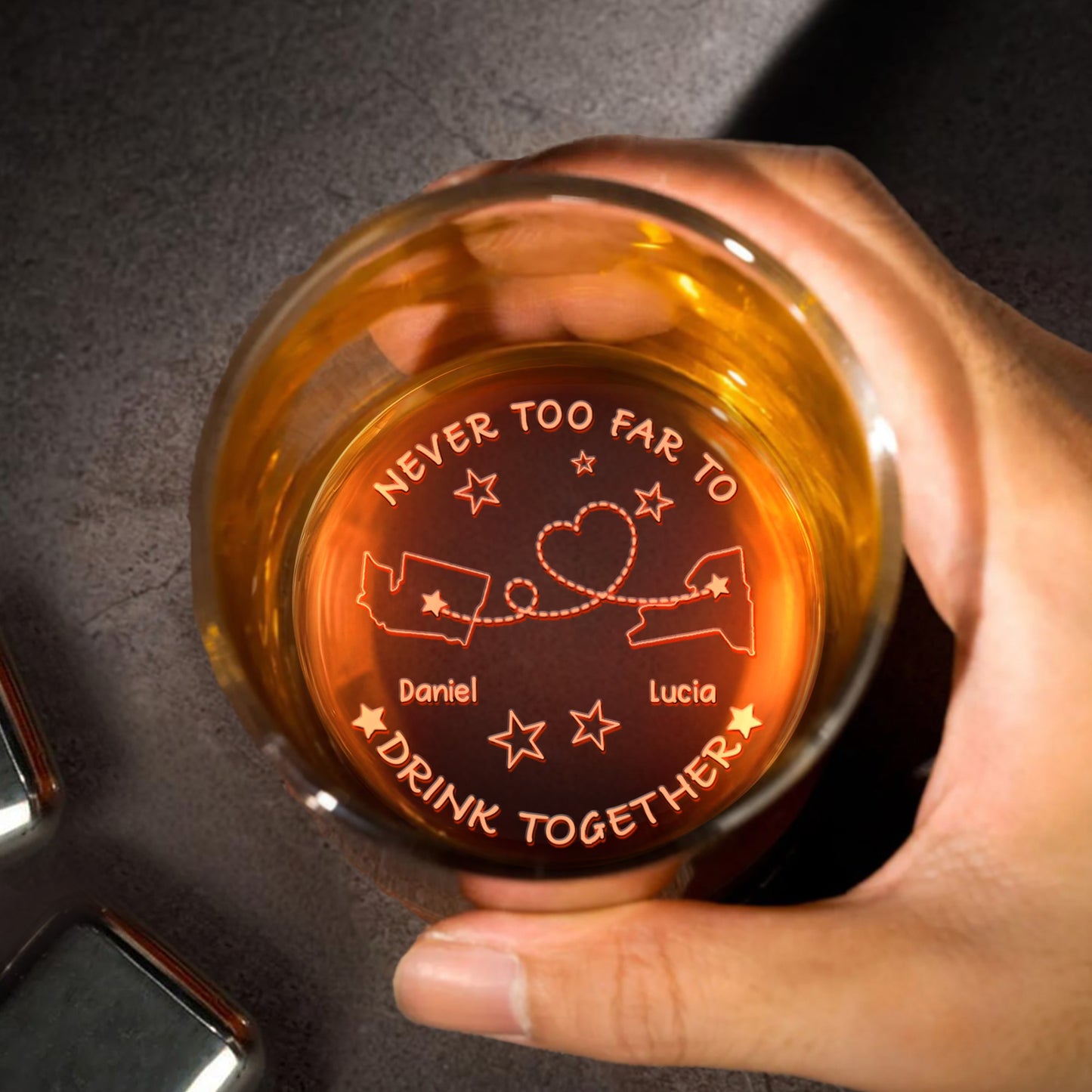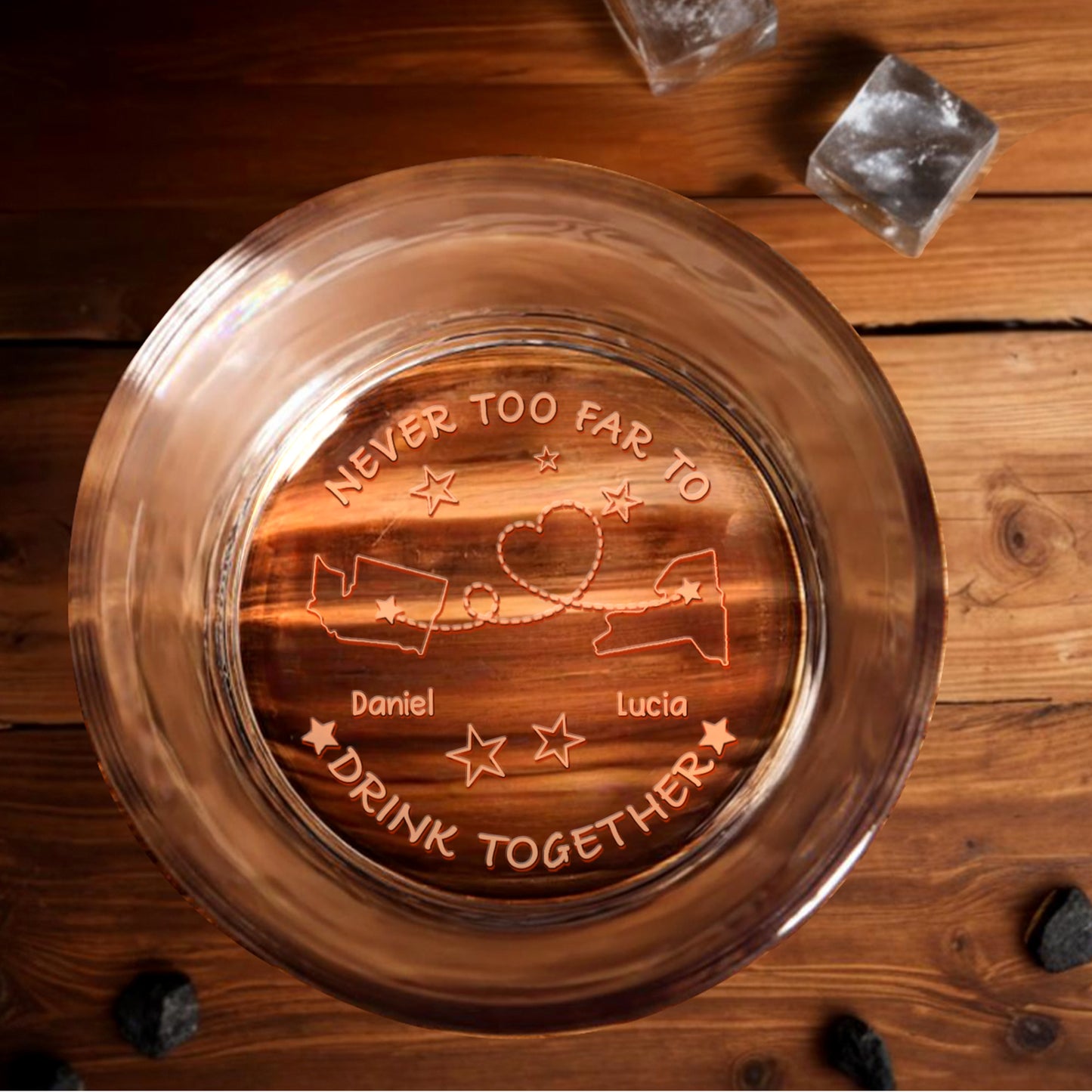 Never Too Far To Drink Together, States, Heart, Connecting Line, Stars - Personalized Engraved Whiskey Glass - FAM310_EWG