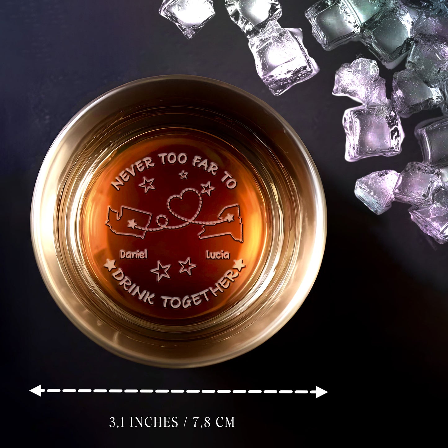 Never Too Far To Drink Together, Personalized Engraved Whiskey Glass, Gift For Couples