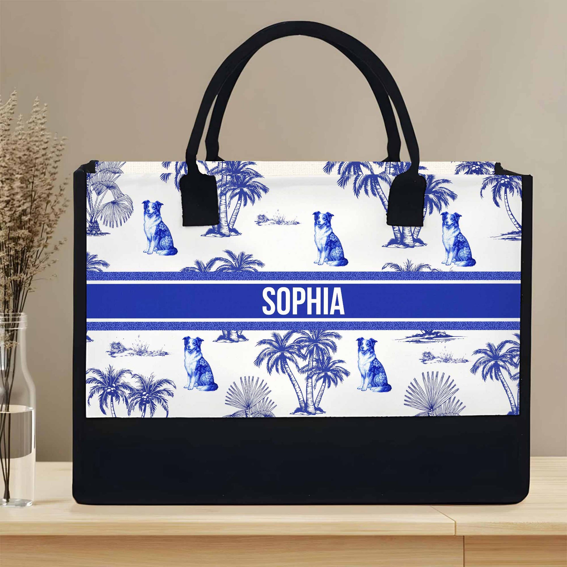 Personalized Tropical And Dog Themed Tote Bag With Palm Trees, Personalized Canvas Tote Bag, Gift For Dog and Beach Lovers
