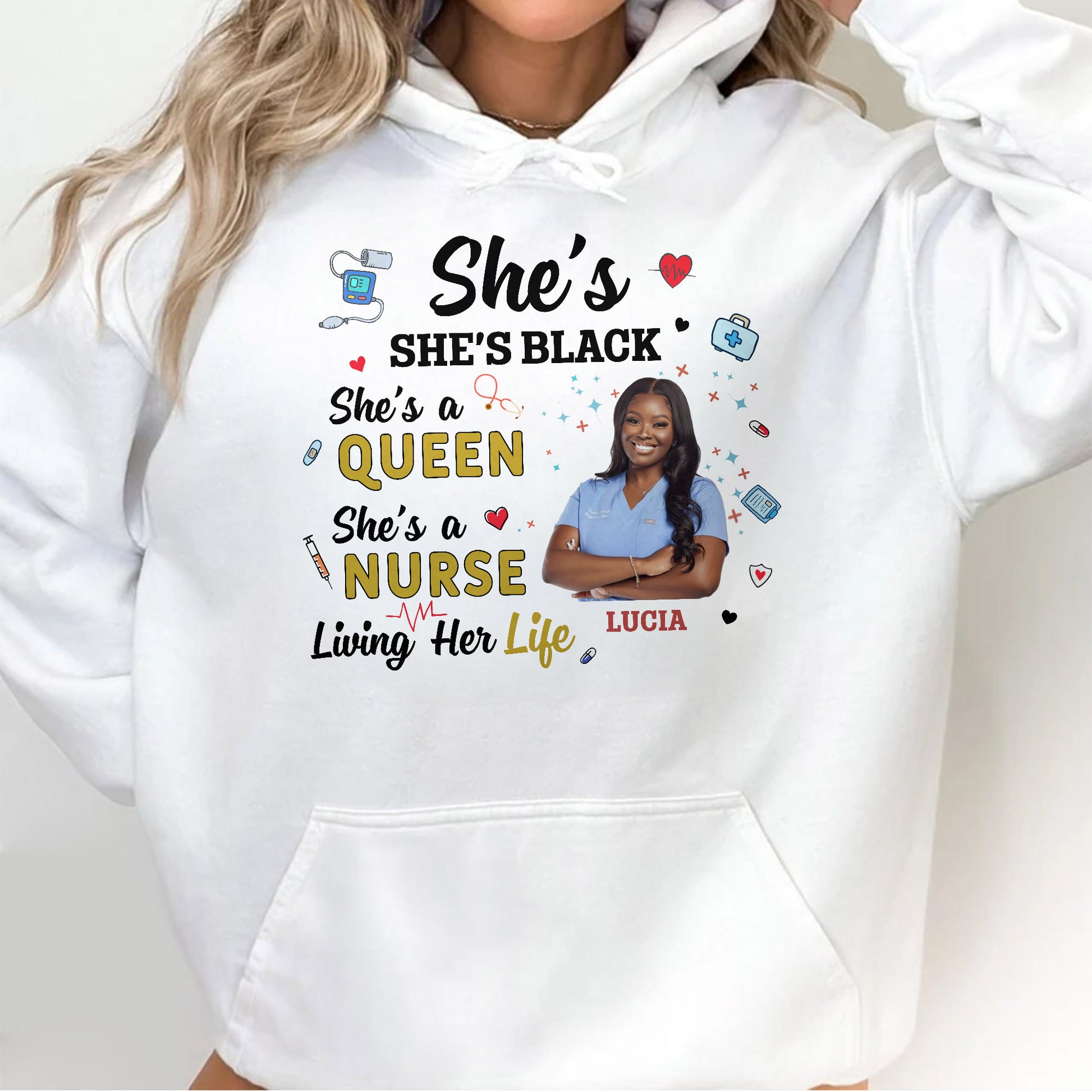 She's Black, She's a Queen, She's a Nurse Living Her Life - Personalized Custom Unisex T-shirt, Hoodie - NUR027_WBAS