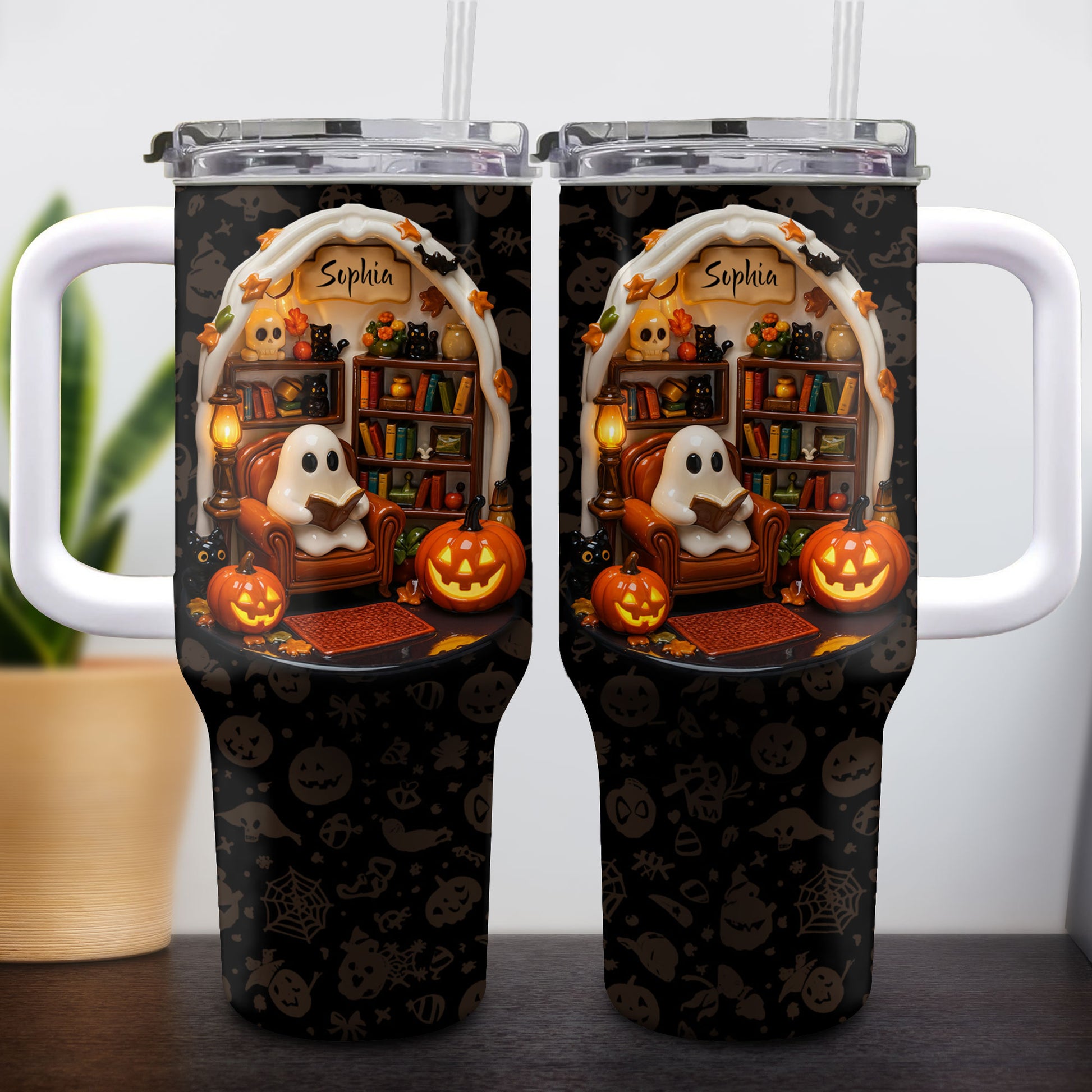 Sophia’s Reading Nook, Ghost And Pumpkin Design, 40oz Tumbler With Straw, Gift For Book And Halloween Lovers