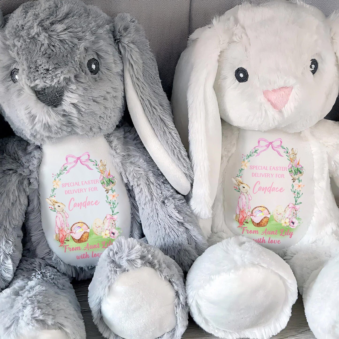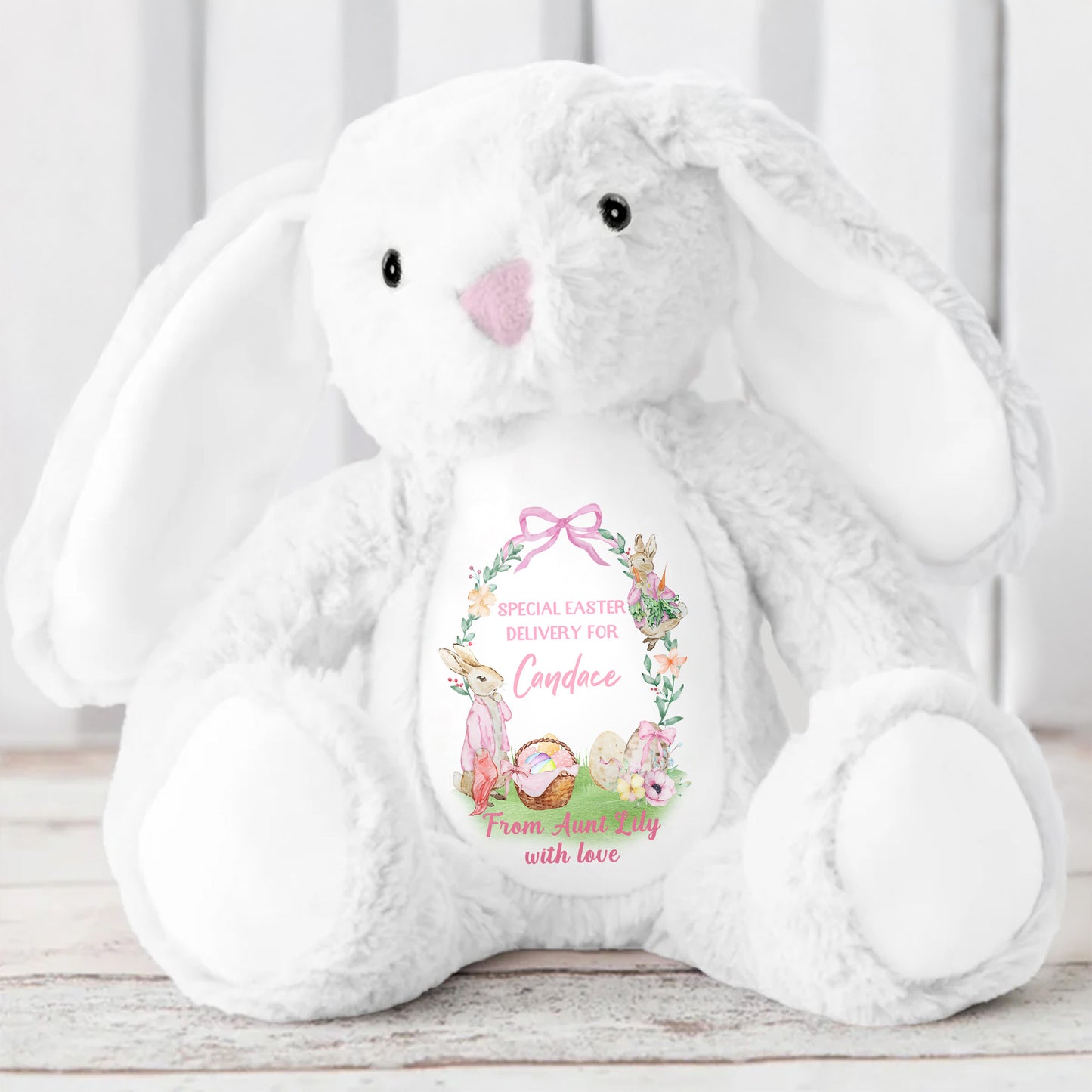 Special Easter Delivery For Candace, Easter Bunny, Eggs And Flowers - Personalized Stuffed Bunny - GRK025_BUN