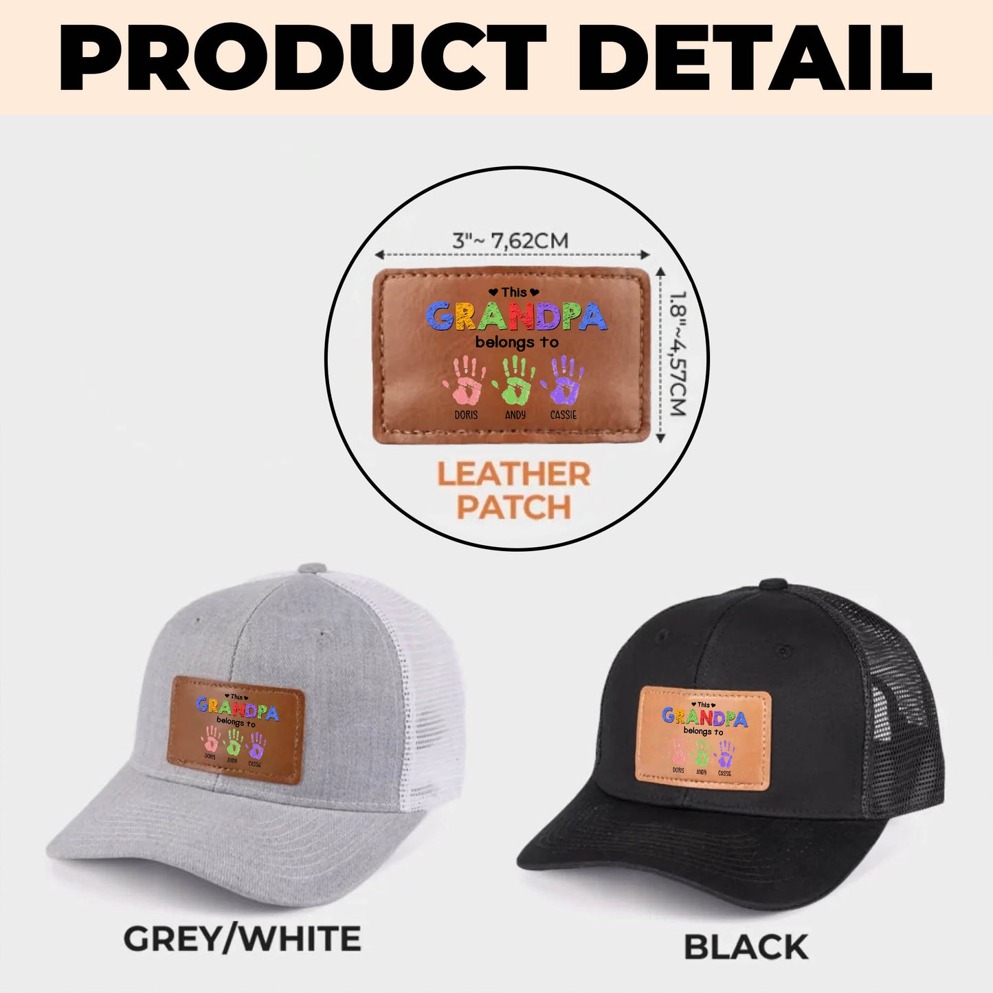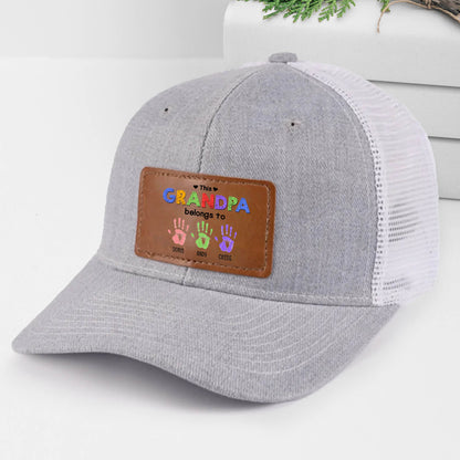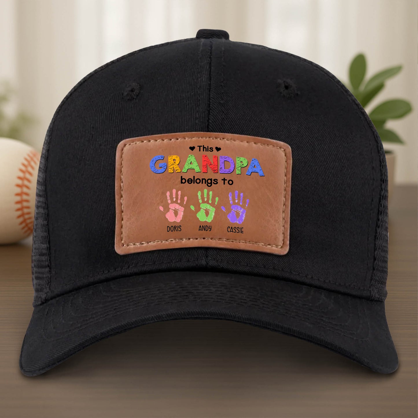 This Grandpa Belongs To, Handprints And Heart, Personalized Leather Patch Hat, Gift For Grandfathers And Family