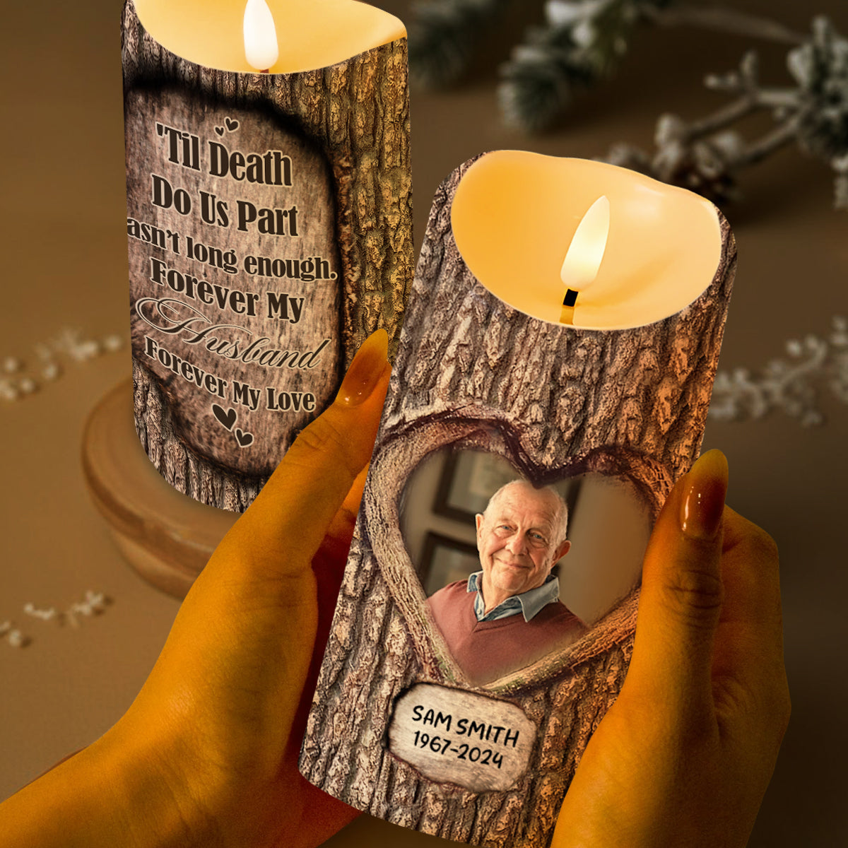 Message: 'Til Death Do Us Part wasn't long enough. Forever My Husband, Forever My LoveNote: Due to differences in monitor settings and lighting effects, the actual color may vary slightly. This is a printed LED candle with a faux 3D effect to create a premium, deep look.