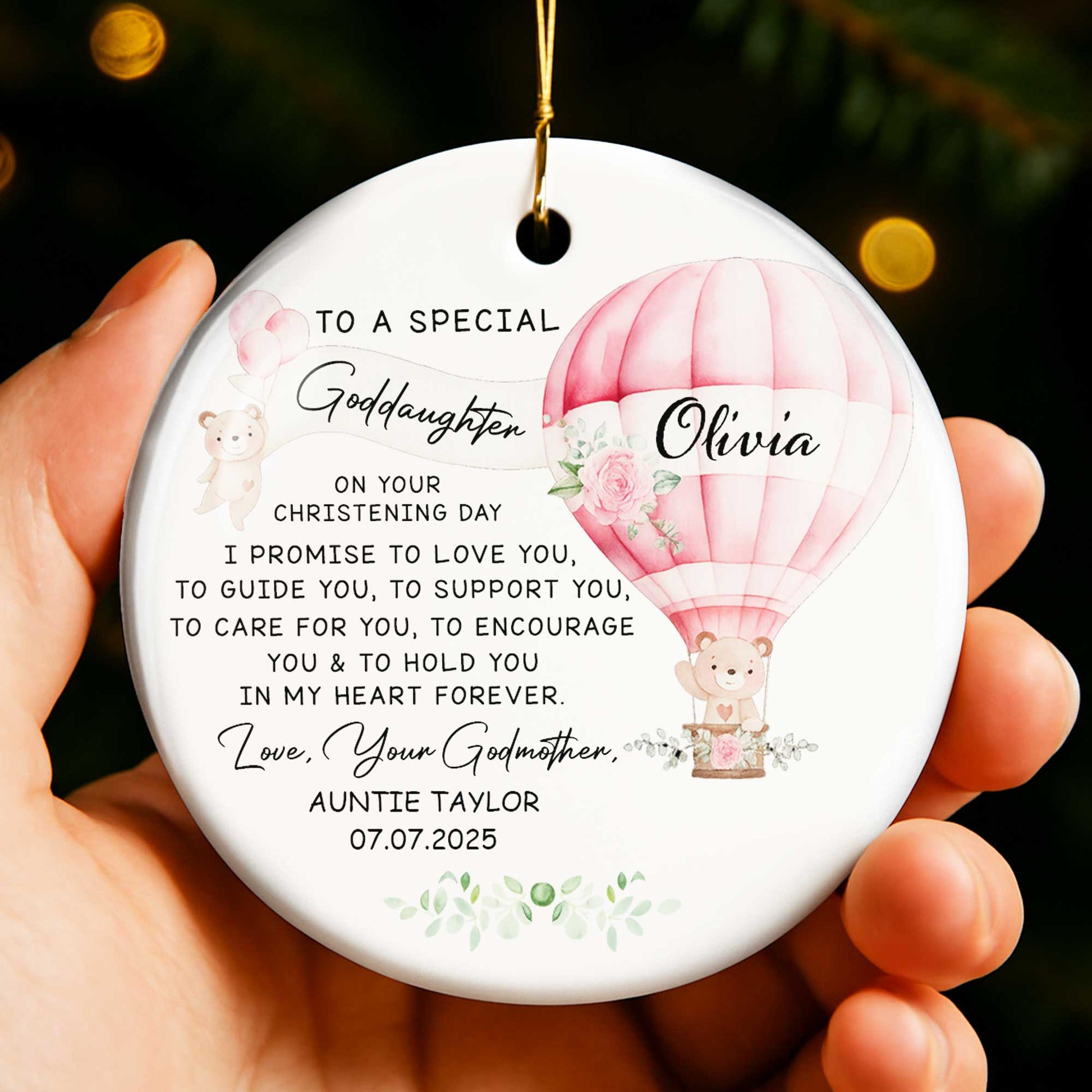 To A Special Goddaughter On Your Christening Day, Hot Air Balloon And Teddy Bear - Personalized Custom Ceramic Ornament With Round Shape - KID236_RCE