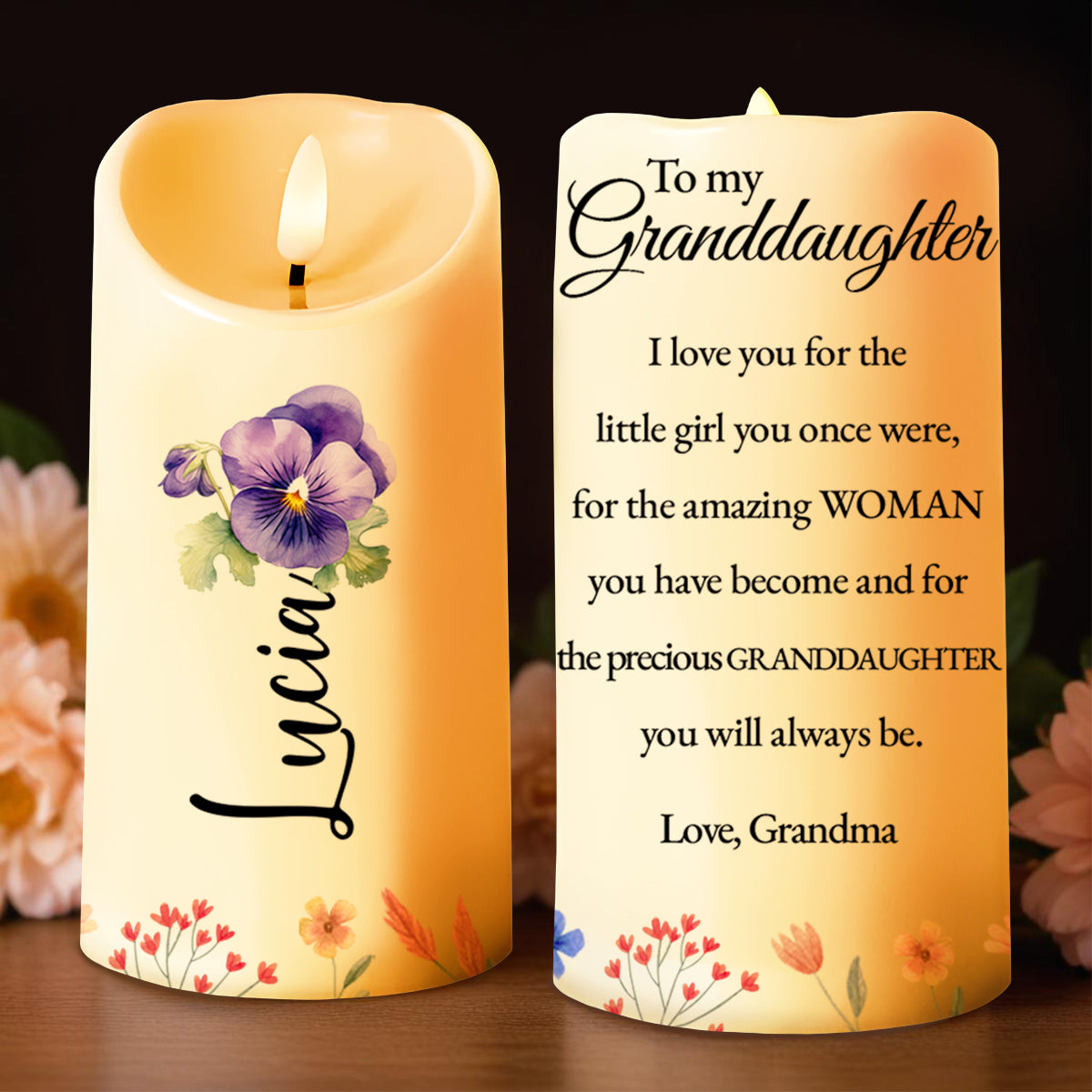 Message: To My Granddaughter, I Love You For The Little Girl You Once Were, For The Amazing Woman You Have Become And For The Precious Granddaughter You Will Always Be. Love, GrandmaNote: Due to differences in monitor settings and lighting effects, the actual color may vary slightly. This is a printed LED candle with a faux 3D effect to create a premium, deep look.