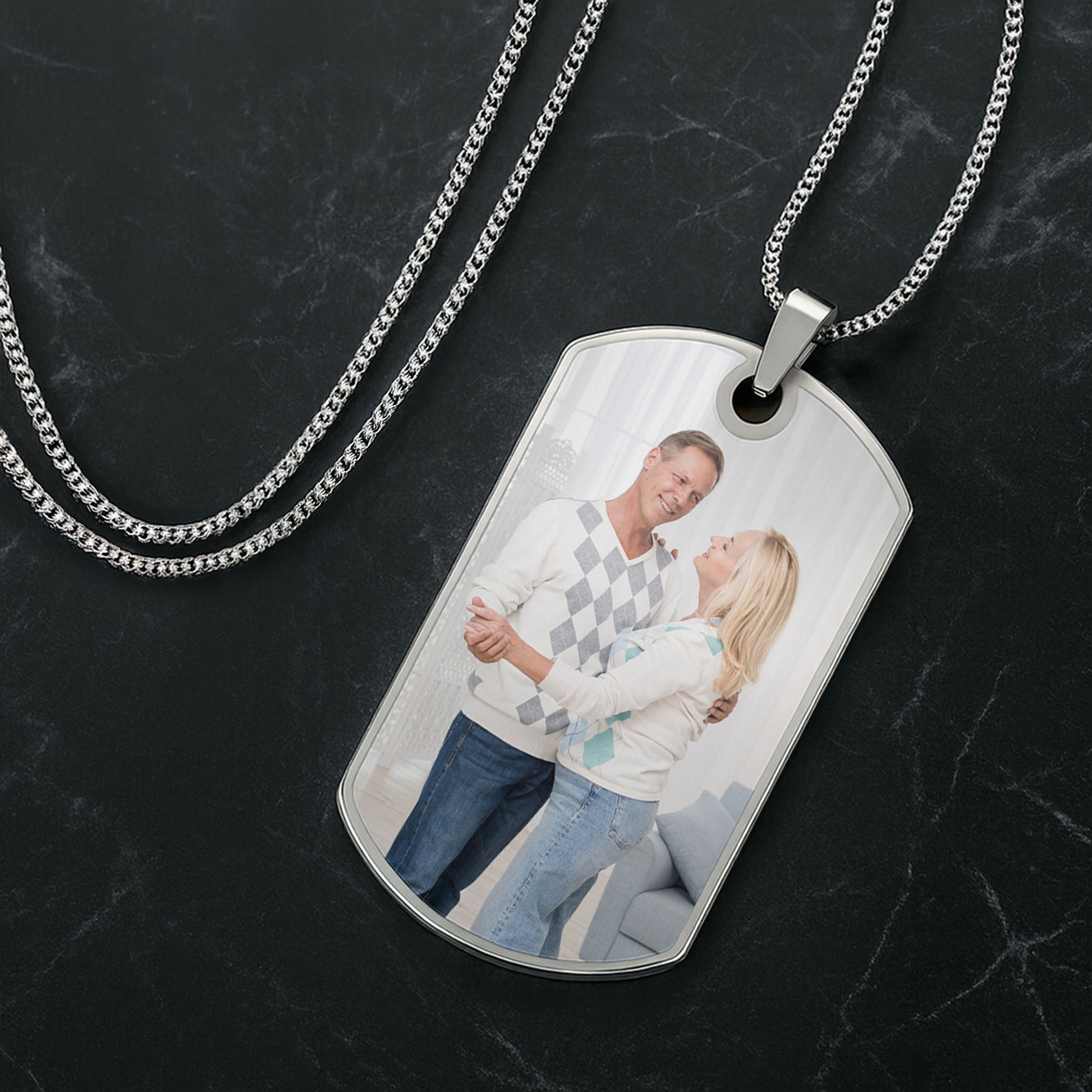 Create a keepsake you can wear every day with our Personalized Dog Tag Necklace. Made from stainless steel and finished with a protective layer over your image and text, this two-sided tag delivers crisp detail and everyday durability.