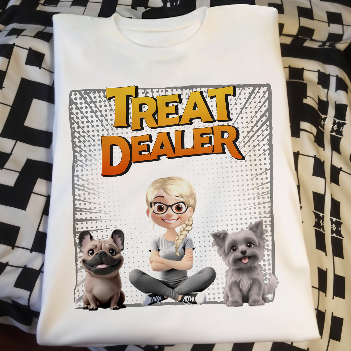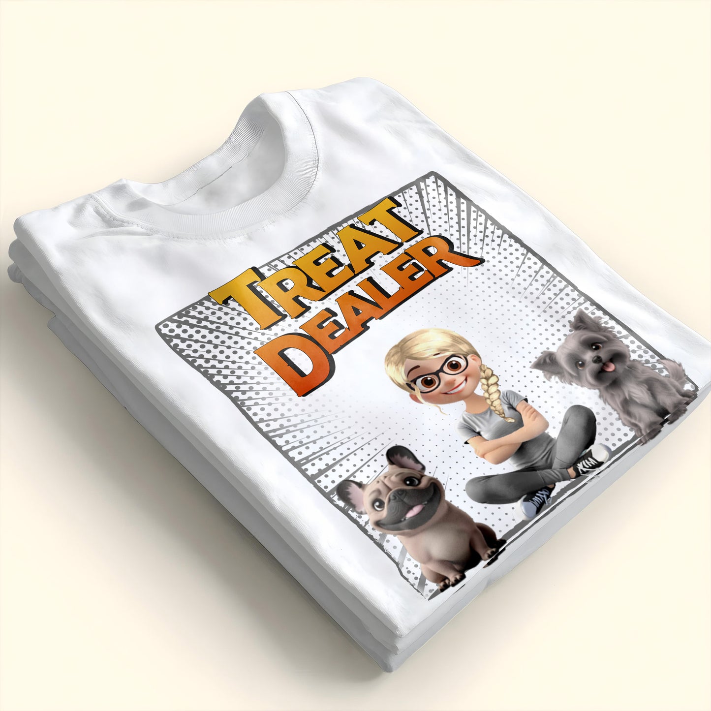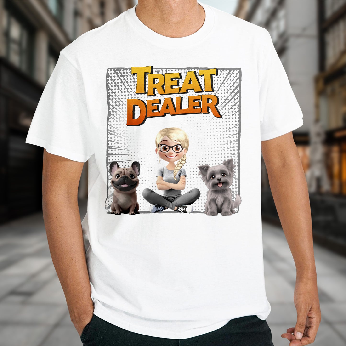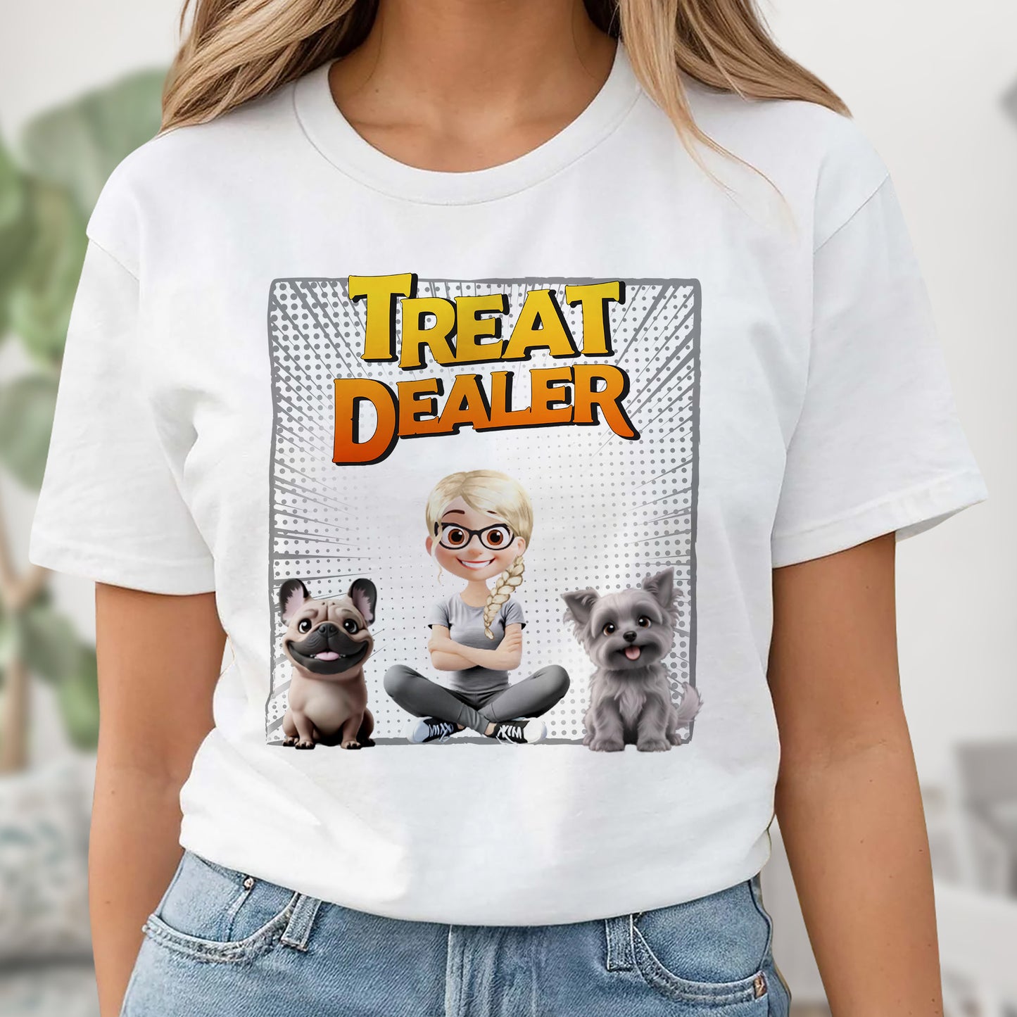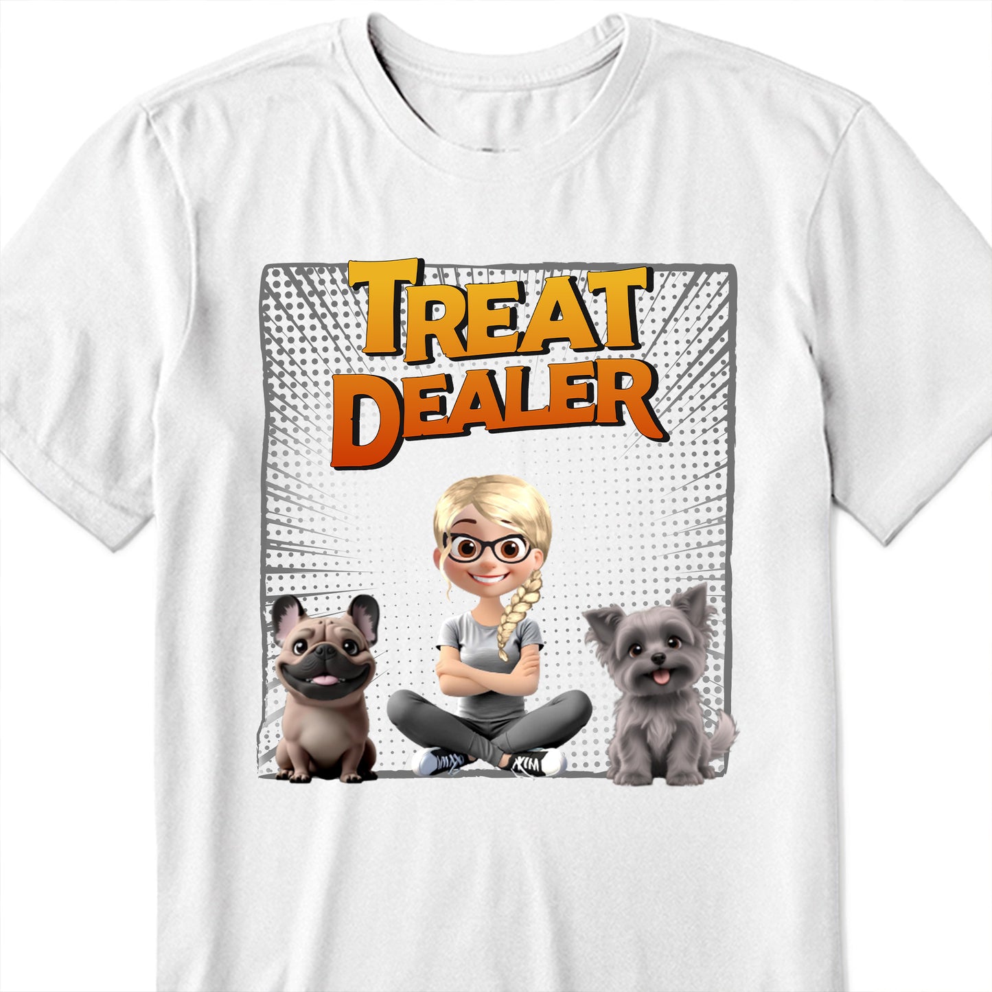 Treat Dealer With Cartoon Girl and Dogs, Personalized Custom Unisex T-shirt, Gift For Pet Owners And Dog Lovers