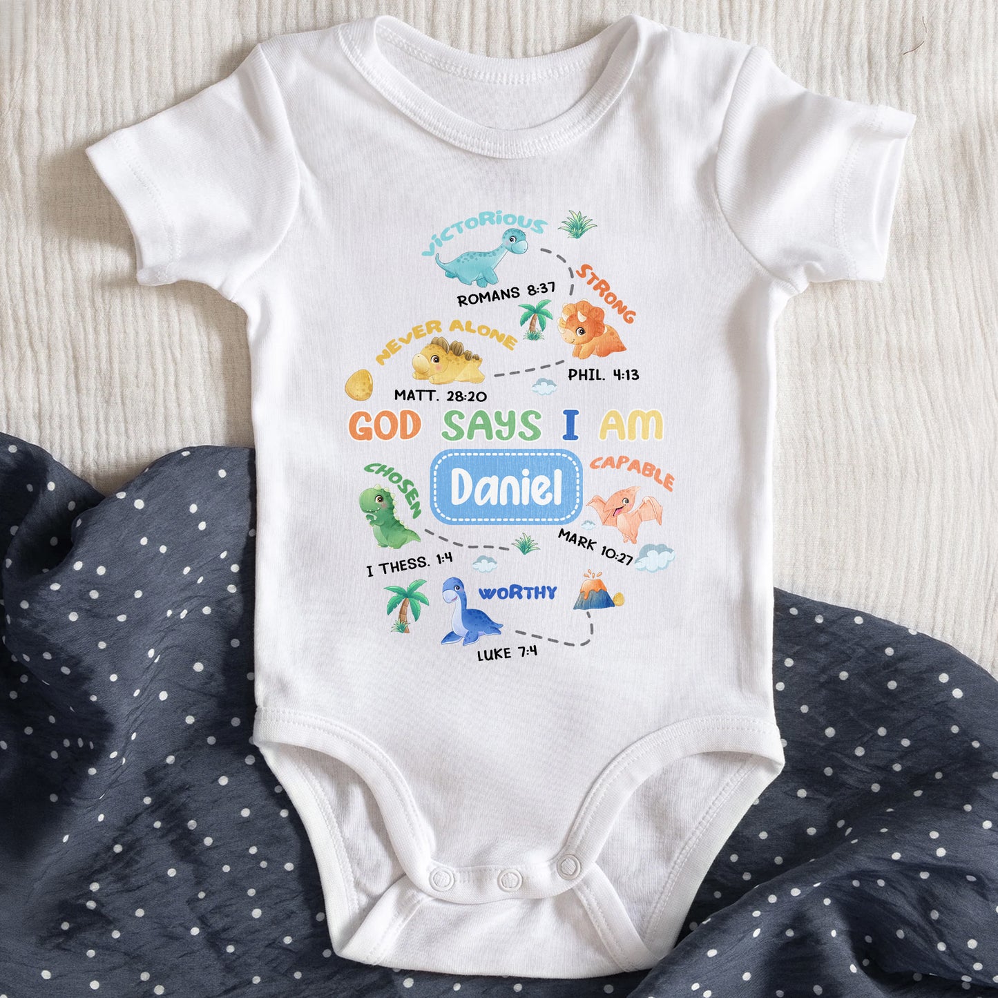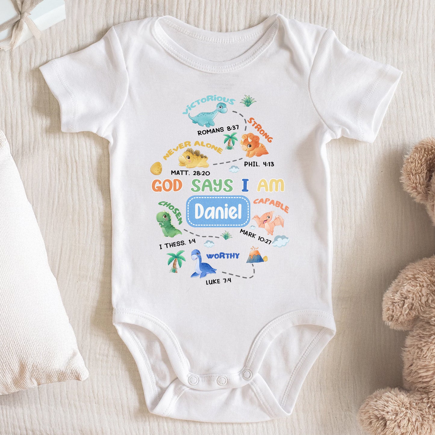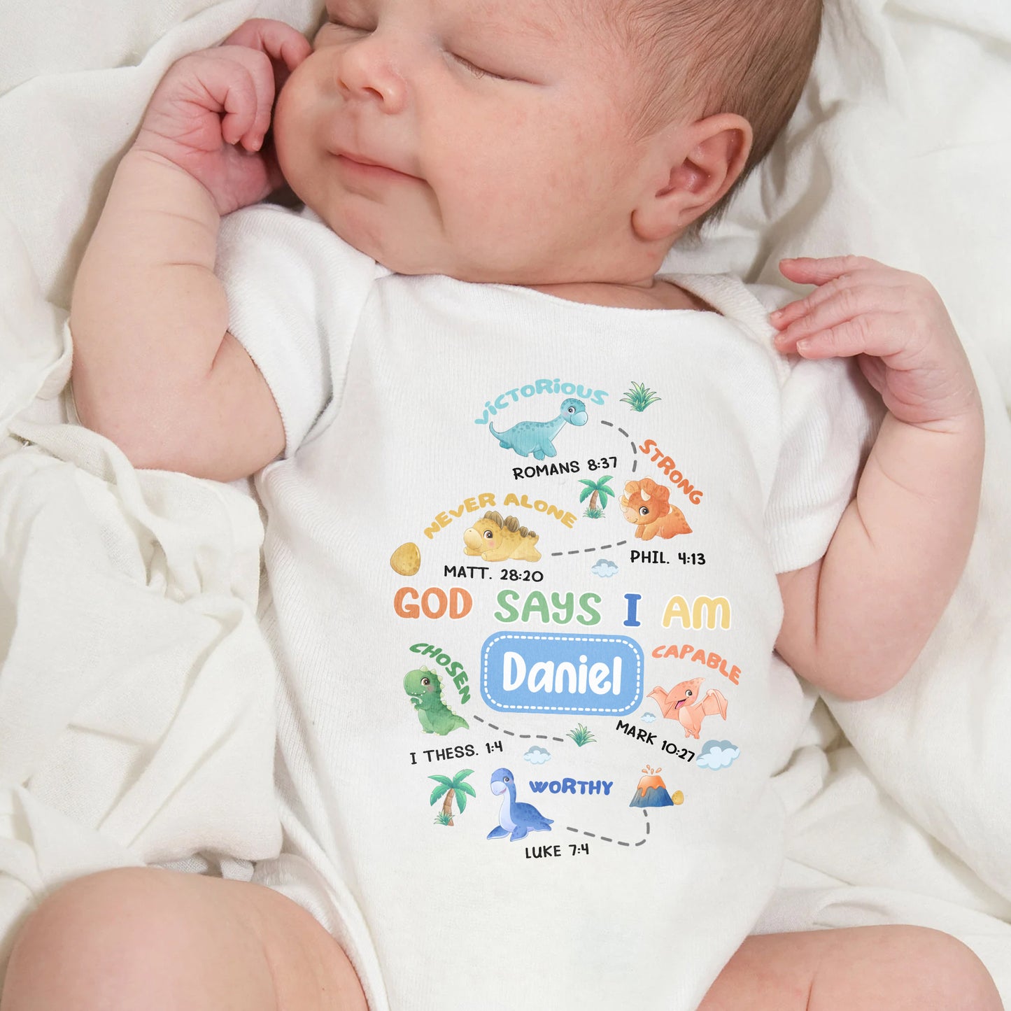 Victorious, Strong, Never Alone, Chosen, Capable, Worthy, Dinosaurs And Cloud - Personalized Custom Baby Onesie - KID038_ONES
