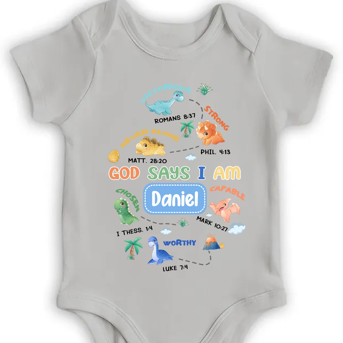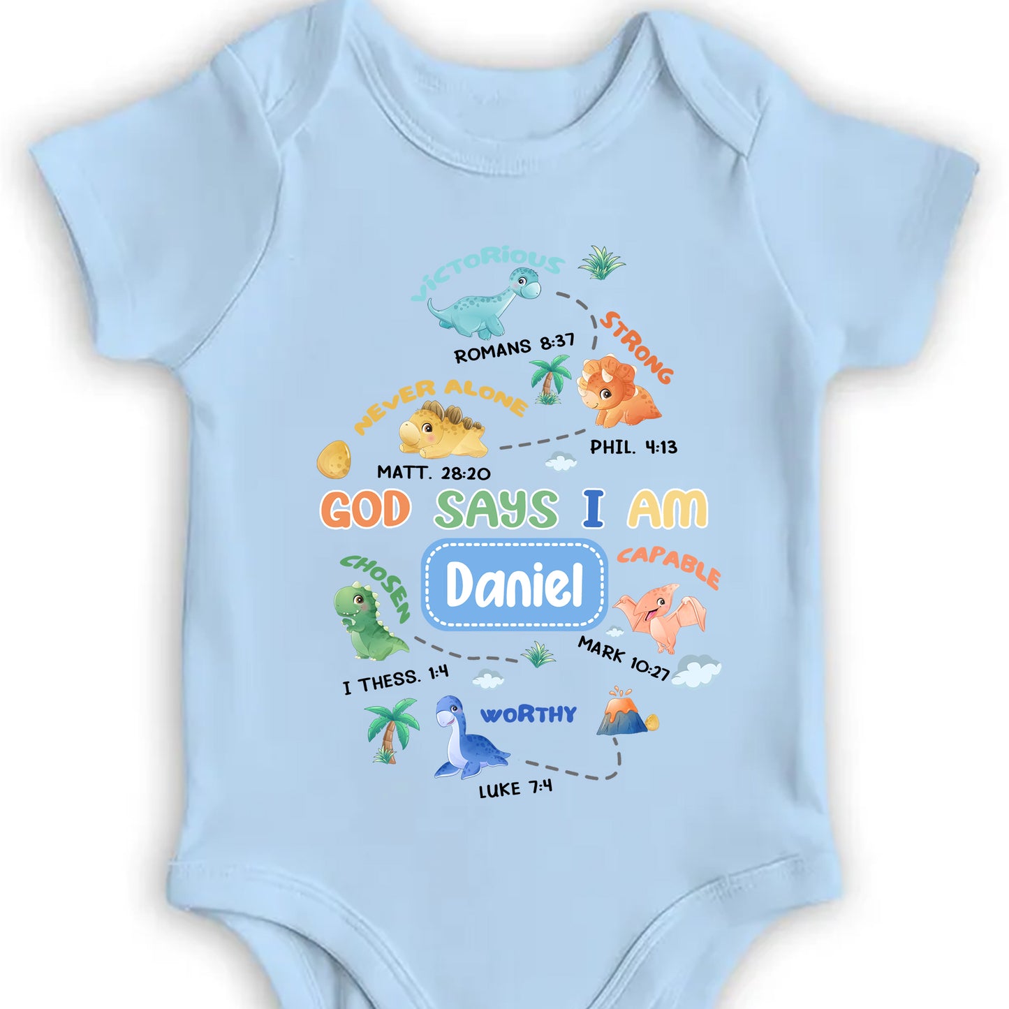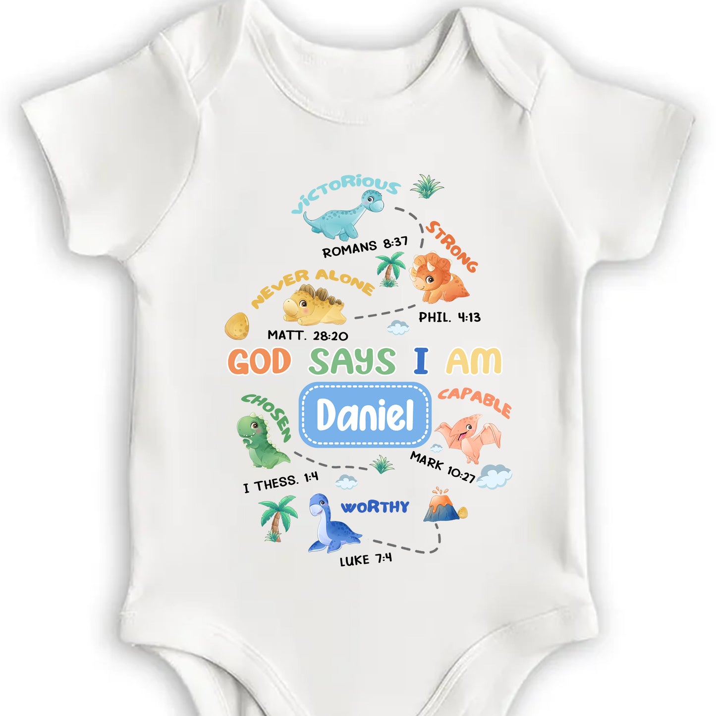Victorious, Strong, Never Alone, Chosen, Capable, Worthy, Dinosaurs And Cloud - Personalized Custom Baby Onesie - KID038_ONES